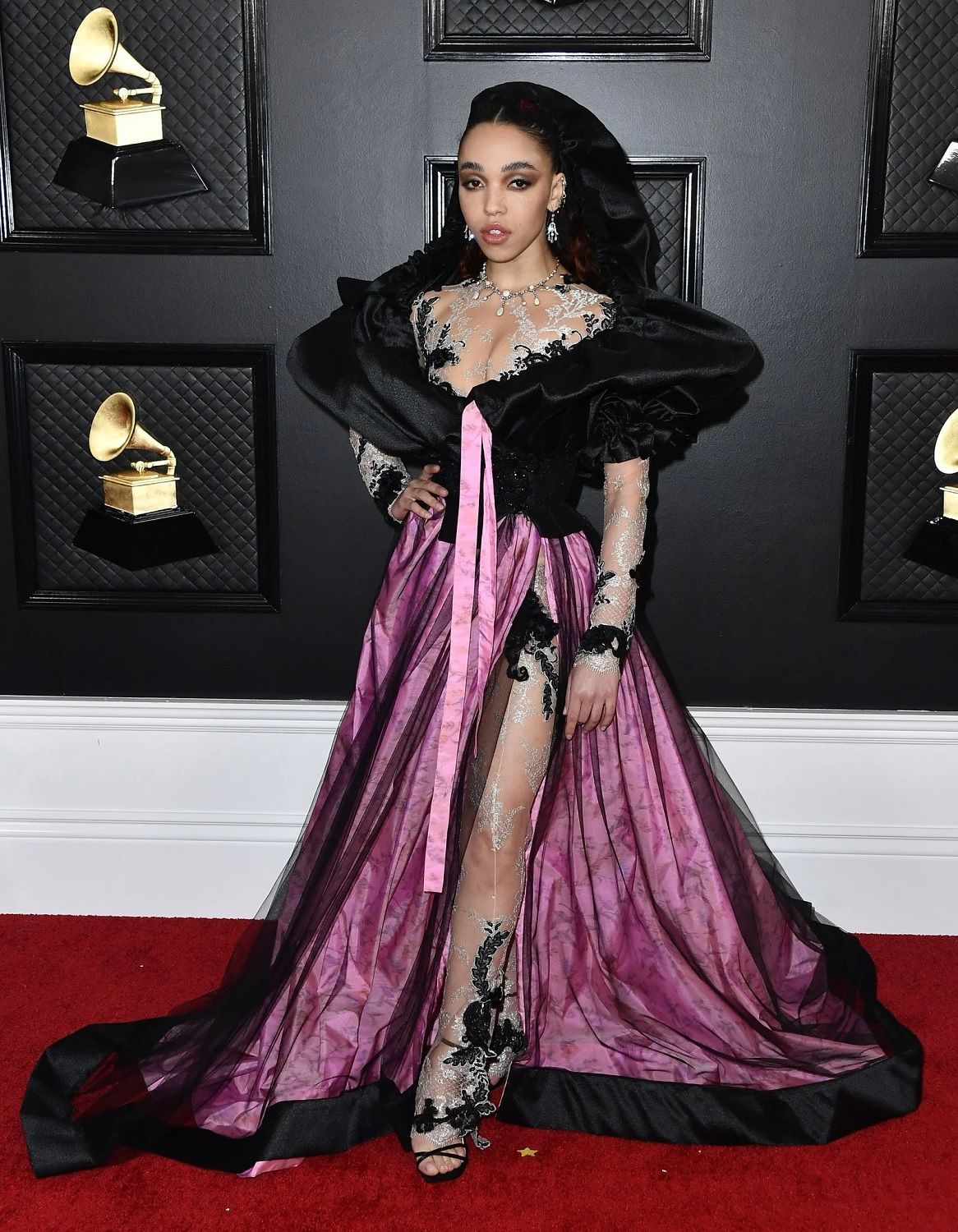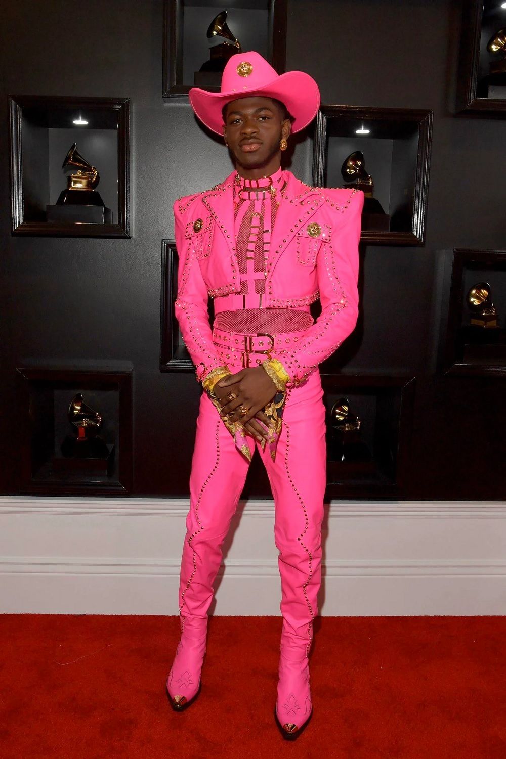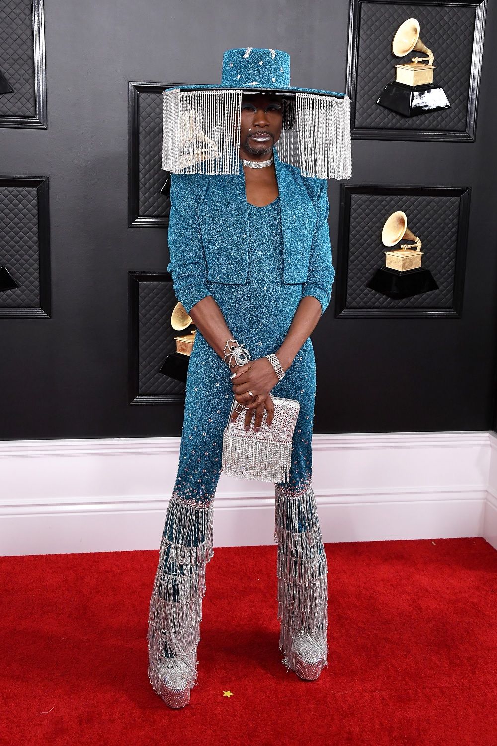 Equally bizarre were the looks worn by Tyler, the Creator in pink livery similar to a Wes Anderson character from the Grand Budapest Hotel; shocking pink in country version also for Lil Nas X in Versace; FKA Twigs in a purple and black hooded dress by Ed Marler that looked like a tribute to Lily Muster; Billy Porter in a Baja East by Scott Studenberg blue suit with a hat featuring metal fringed curtains that opened like a curtain.