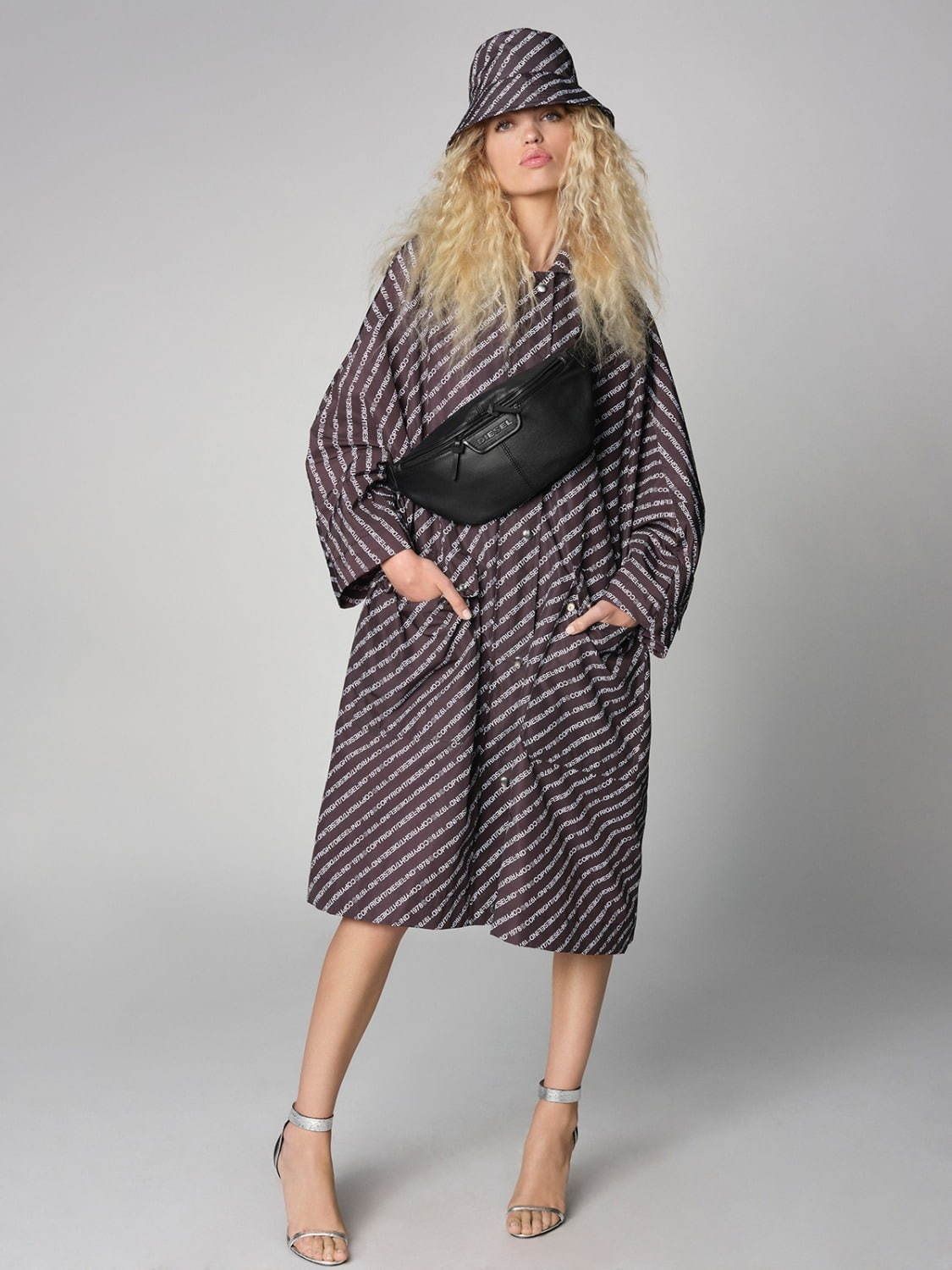 The collection consists of pieces in black and white, versatile, which can be added to a wardrobe of essentials to give a twist to minimal outifits or which can be mixed together for a bolder look. The offer includes a chemisier dress in lightweight georgette crepe, a reversible hooded jacket, a cotton poplin shirt and straight jeans. All are highlighted by the Copyright all-over logo print, including the shiny coated nylon shopping bag and summer sandals.
