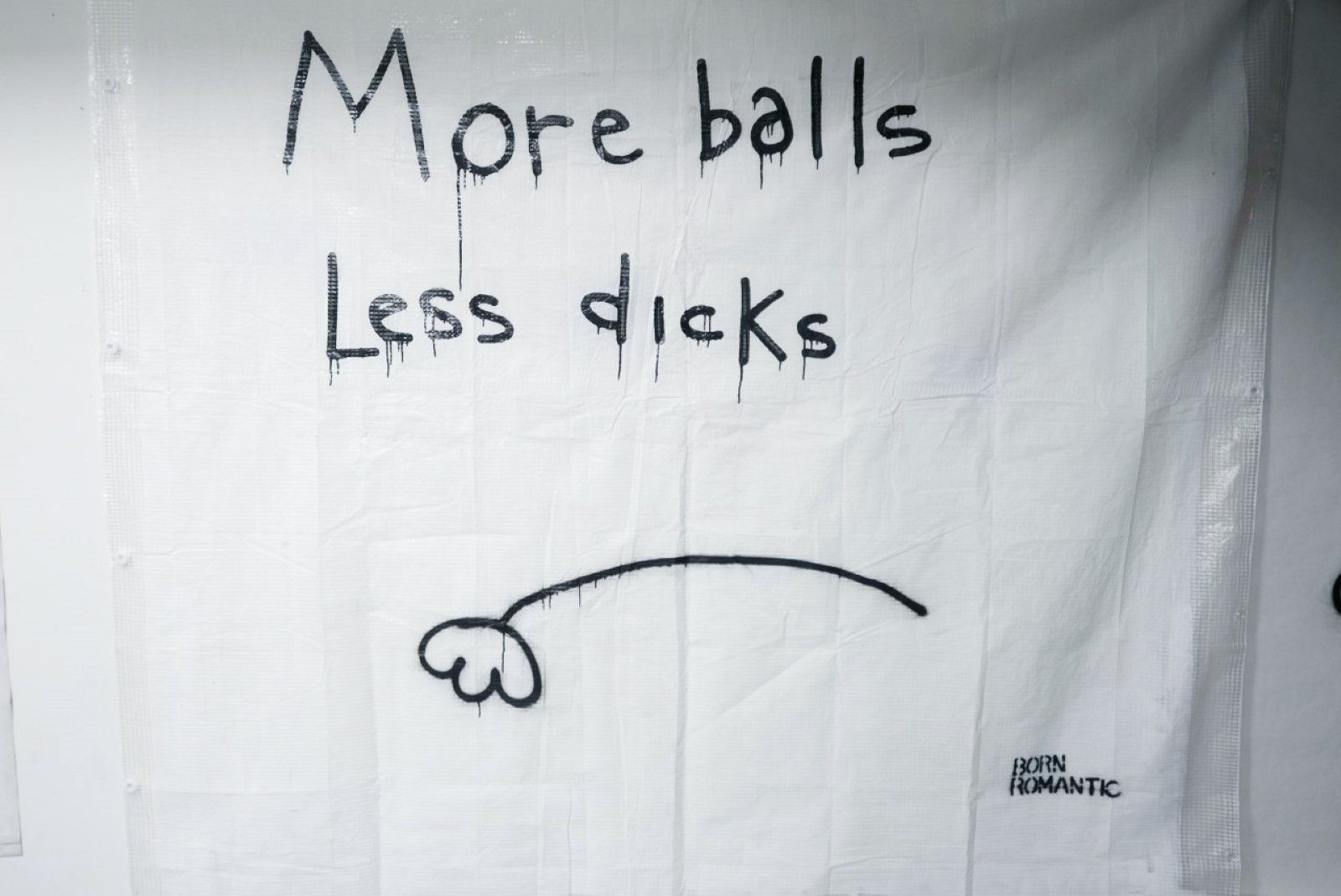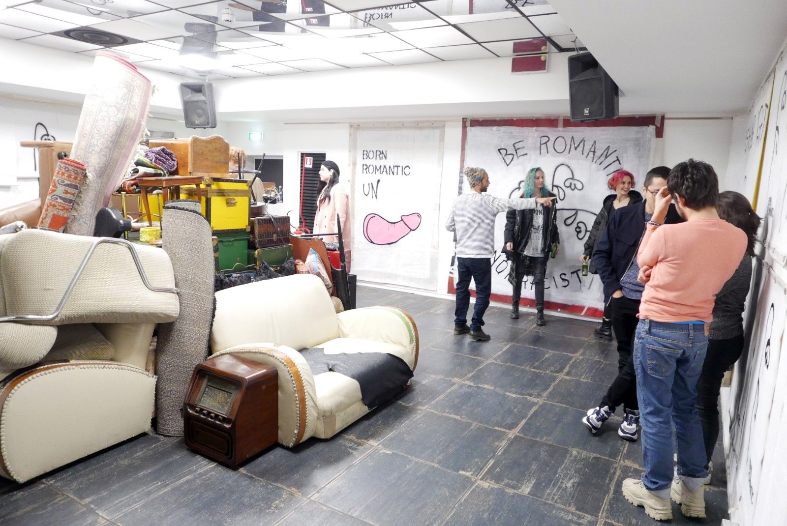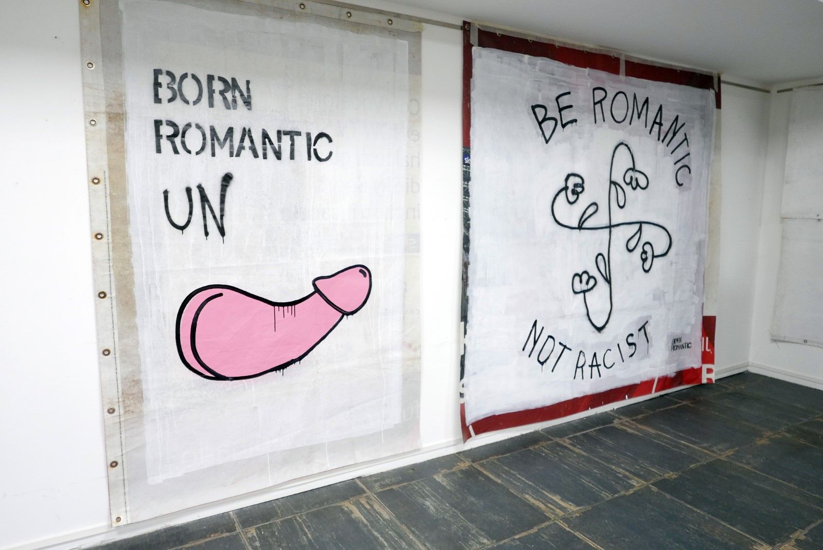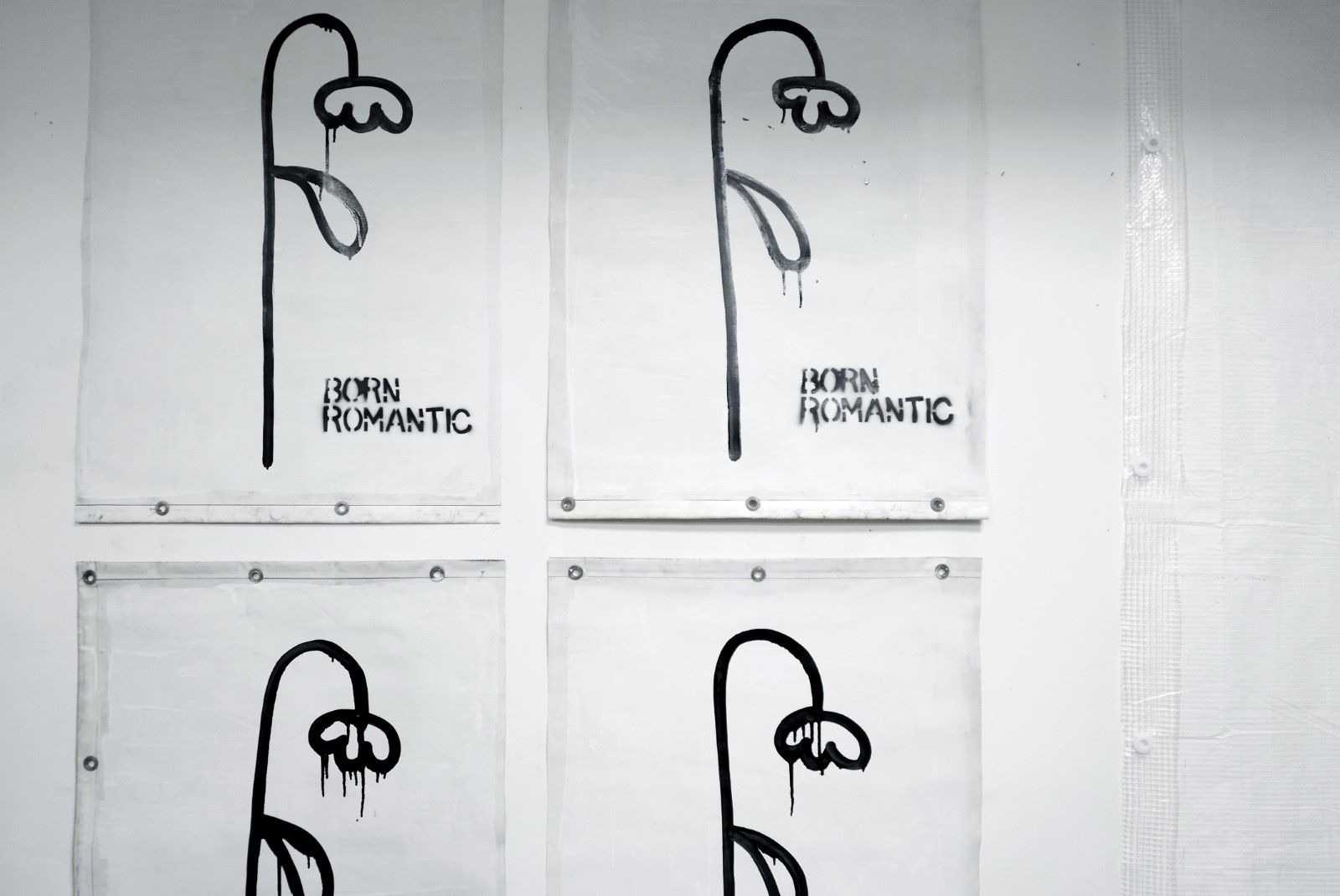 The merch presentation was included in the setting of an event at the Art Mall Gallery in collaboration with Arte su Marte, where a docu-film was screened and an exhibition was set up. During the exhibition, canvases were exhibited from sections of PVC taken from billboards posted at the palaces in Milan. This concept is part of Born Romantic's brand philosophy that is based on the values of conservation, recovery culture and sustainability.
