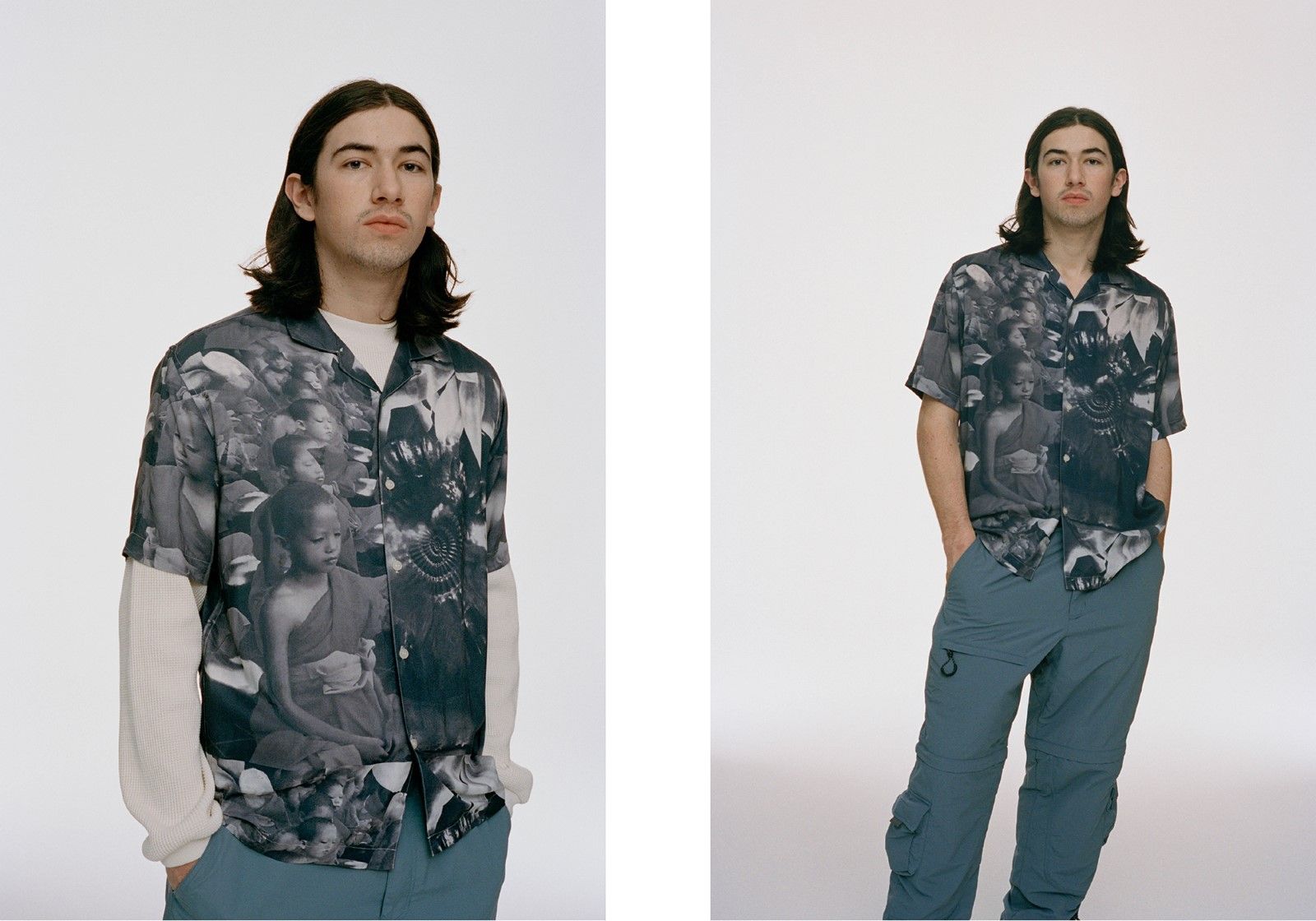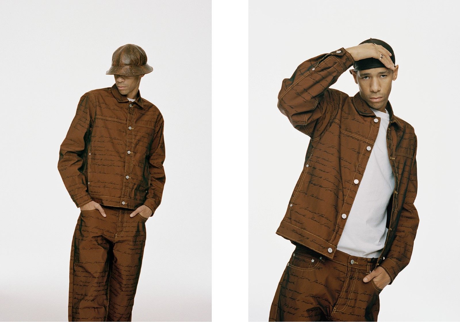 Among the most interesting pieces in the collection are the faux-python leather jackets, present in the two brown and blue colorways, with coordinated bucket hat and the mohair cardigan printed all-over with the Old-English font. A special item is the hybrid hoodie with the hood of a puffer jacket while in the selection inspired by workwear stand out a brown suit decorated with calligraphic prints and a work jacket that features an extended hand embroidery on the front. Also notable are the all-over printed shirts with one in particular decorated with flames and a three-dimensional metallic inscription reminiscent of those worn by American television legend Guy Fieri.