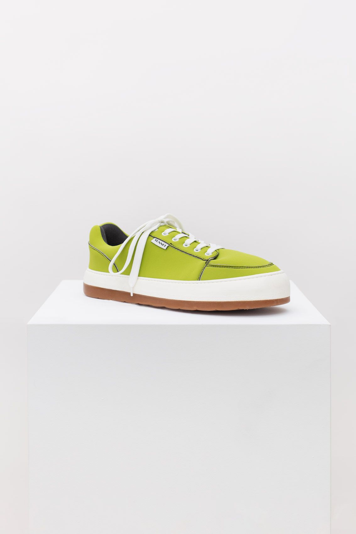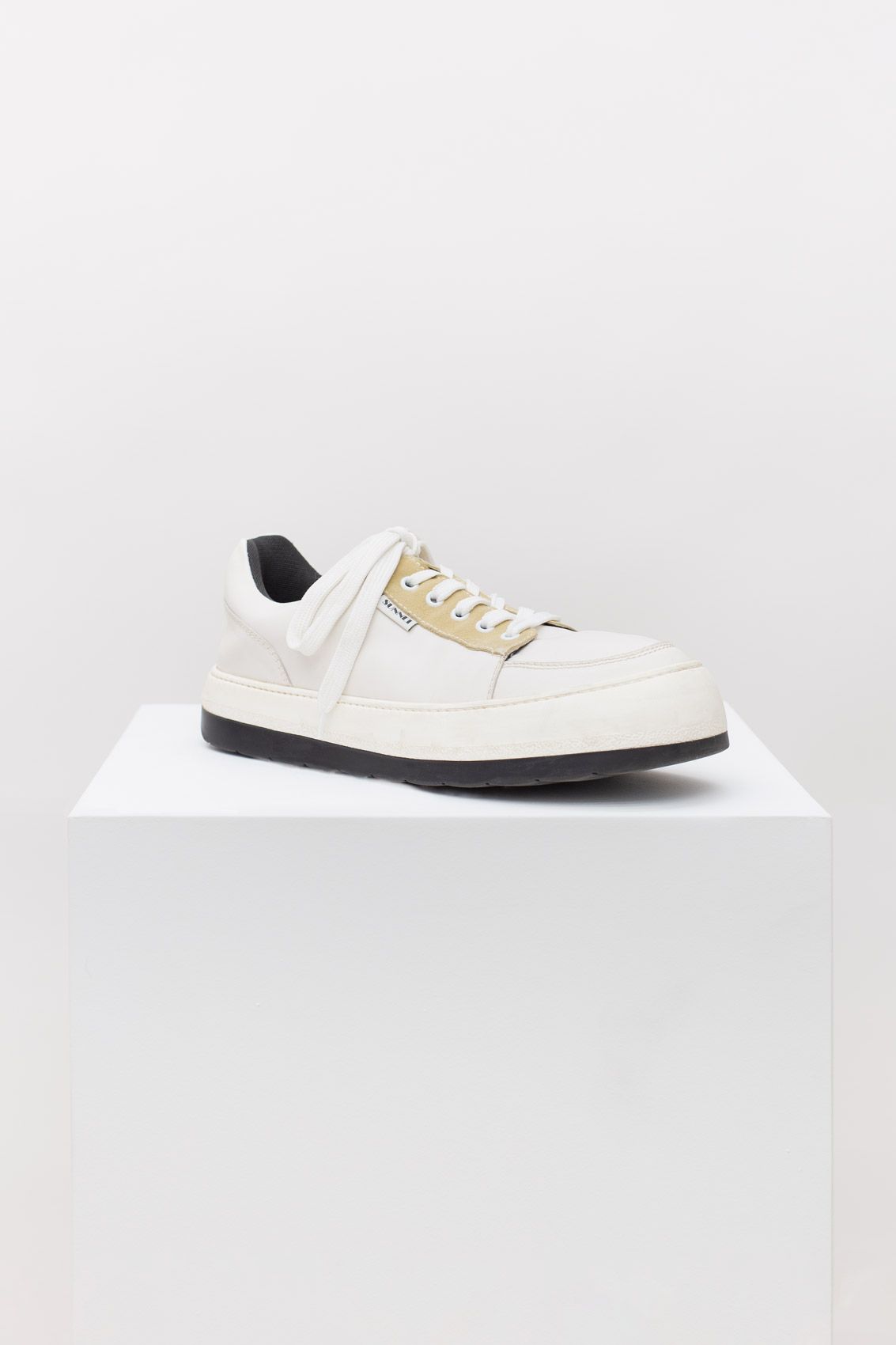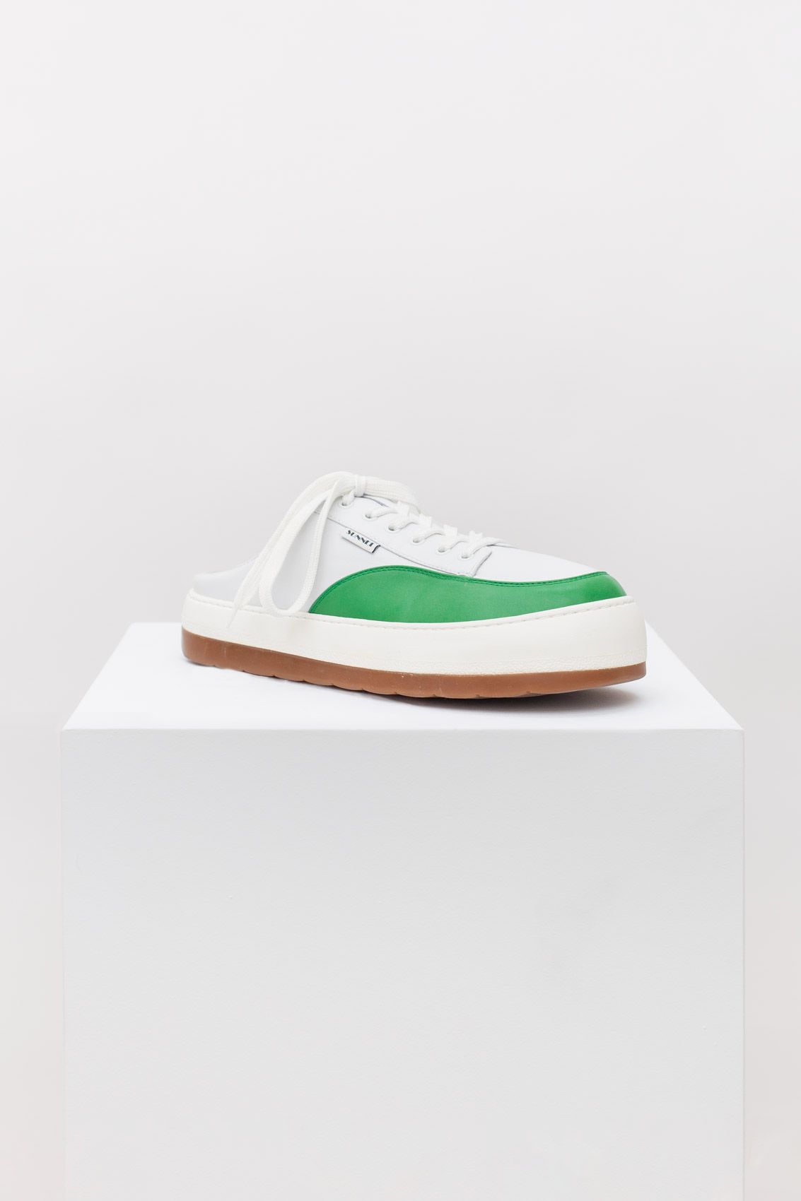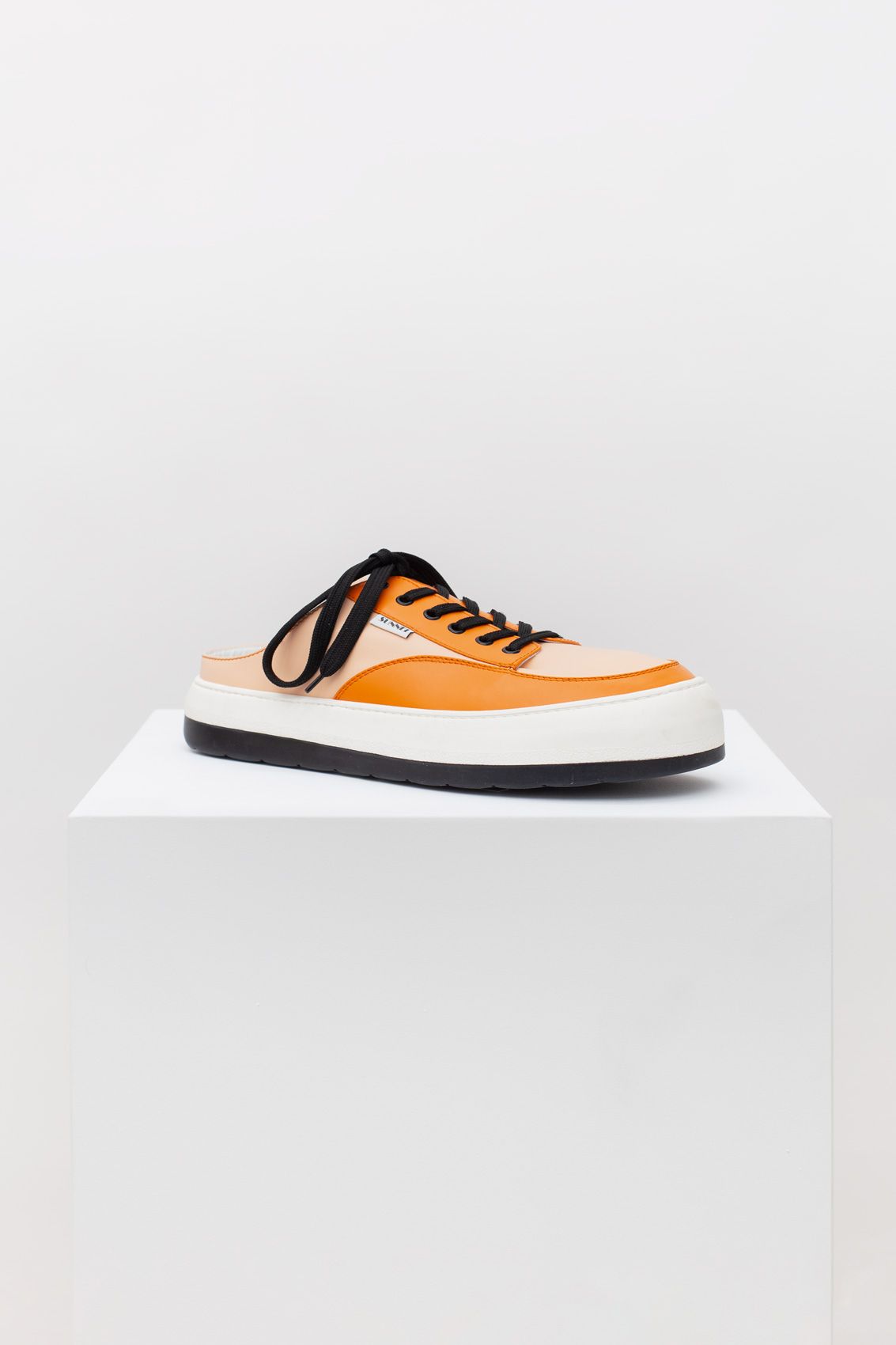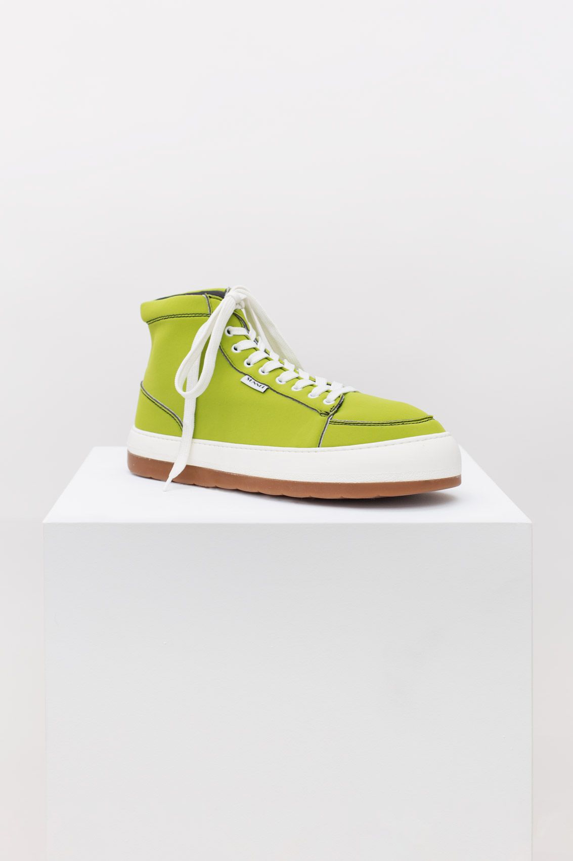 The new line of DREAMY shoes was created focusing on the shape of the shoes, which is more essential, and the color palette, which instead focuses on the new shades of yellow, orange and green. The typical exaggerated volumes of Sunnei's footwear are enriched with new materials such as leather, crocodile and neoprene and are presented in the double format of high-top and sabot.
