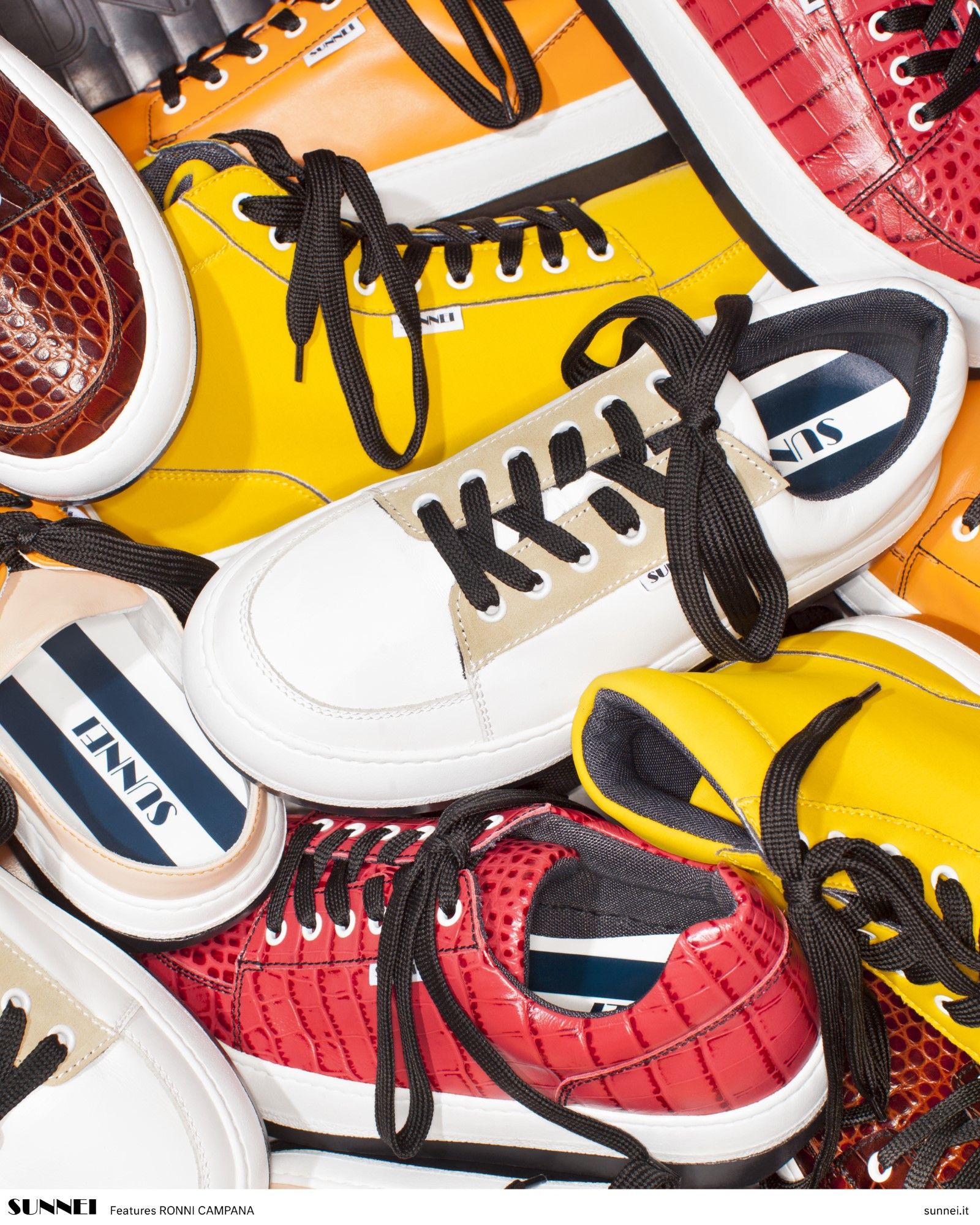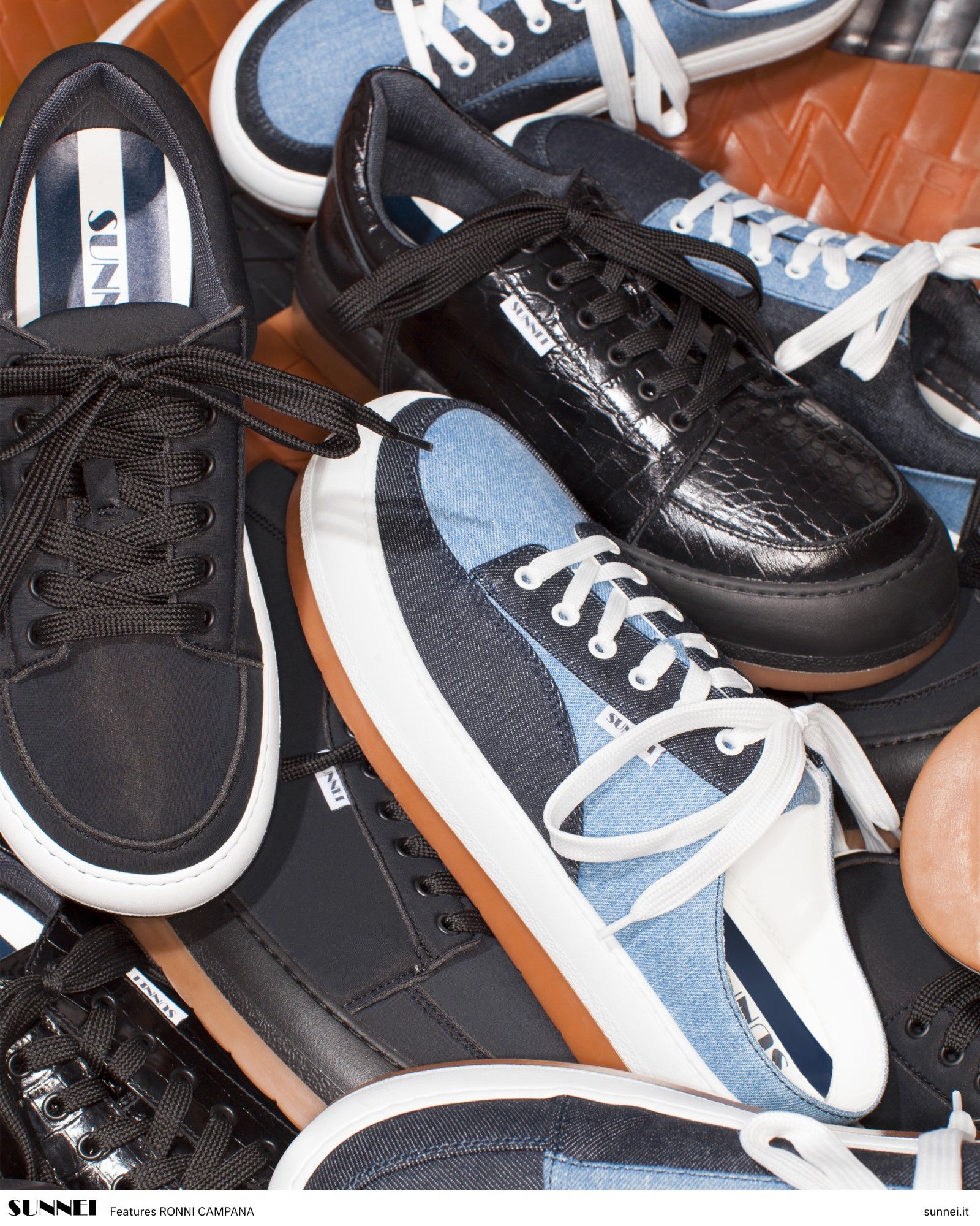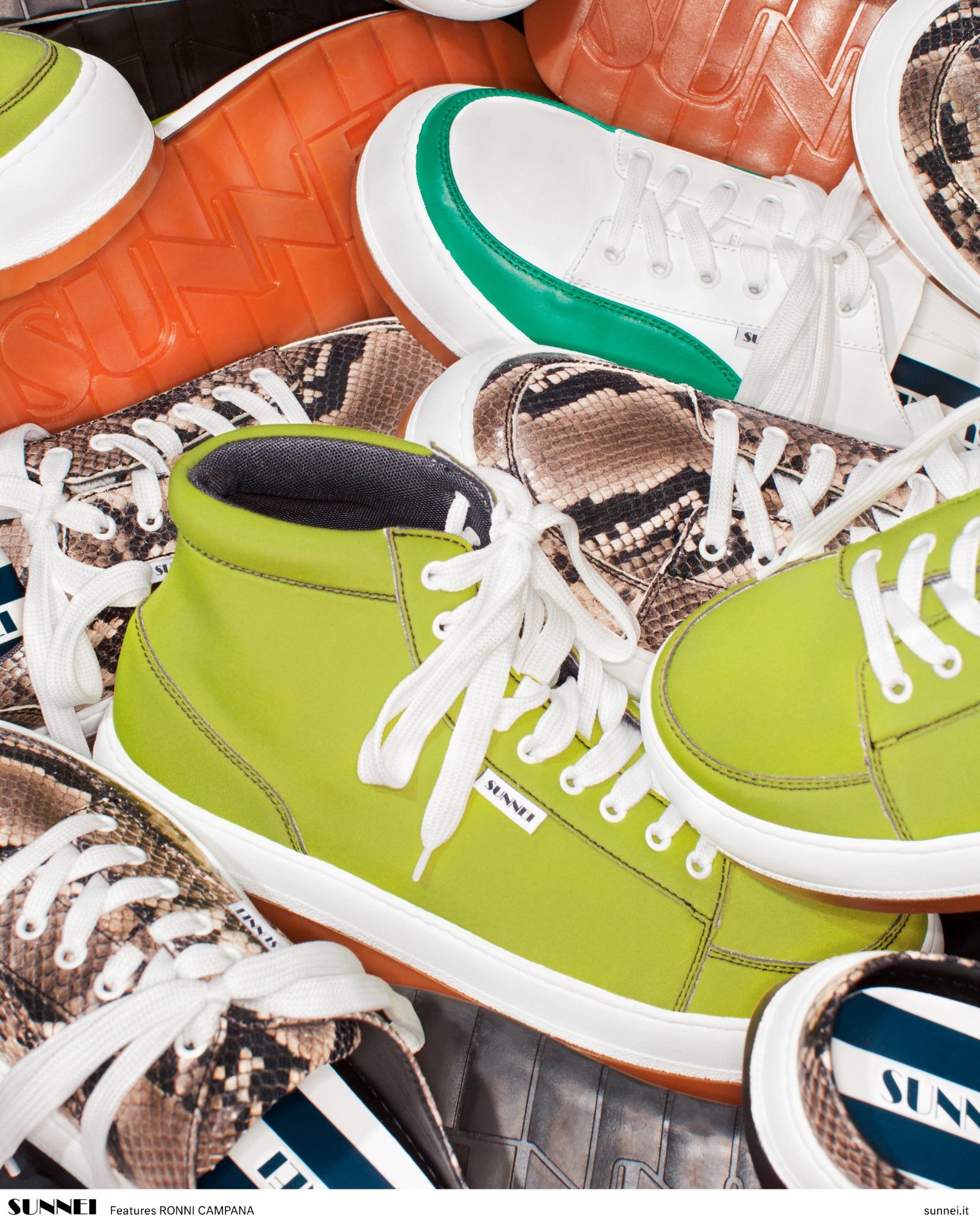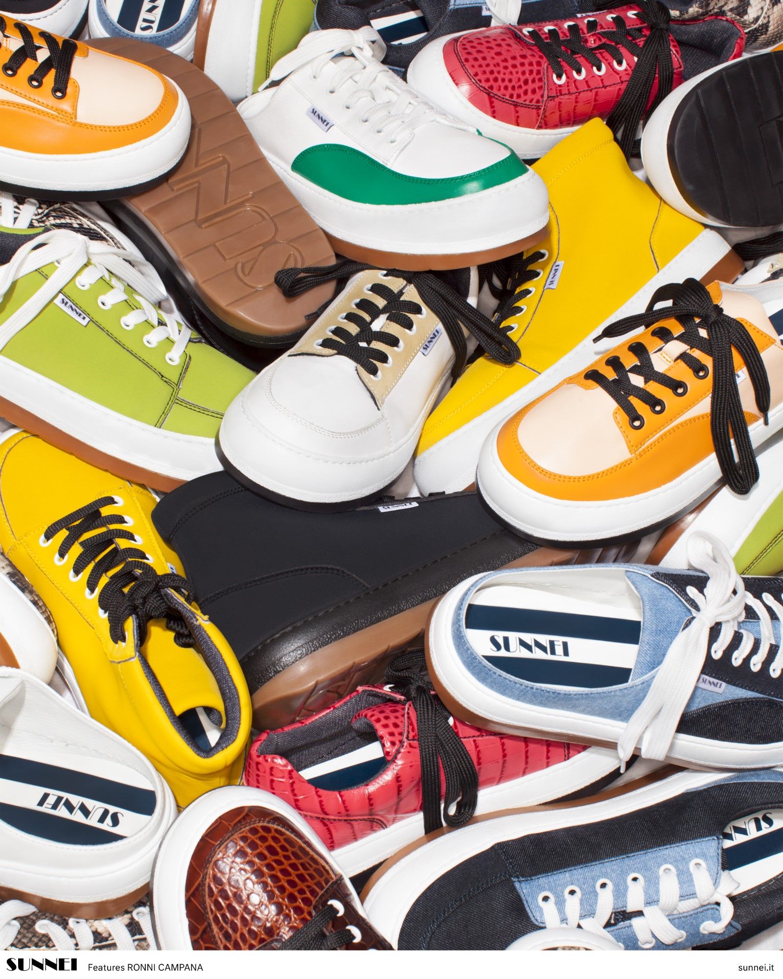 The series of shots that Ronni Campana has created portrays seemingly chaotic mounds of Sunnei's Dreamy Shoes that reveal every model of the shoe line presented in the brand's SS20 collection. The harmony of the composition comes from the interweaving of the different textures of the materials of which the shoes are composed. In addition to the official series of images that you can see in the gallery above, the project also includes content that tells the realization of the photoshoot, which took place in a remote dialogue between Florence and Milan, in the form of video calls.