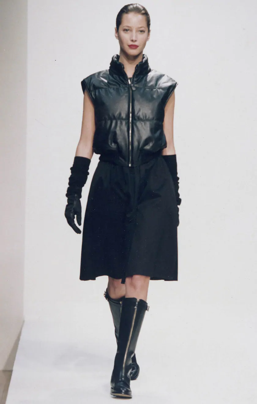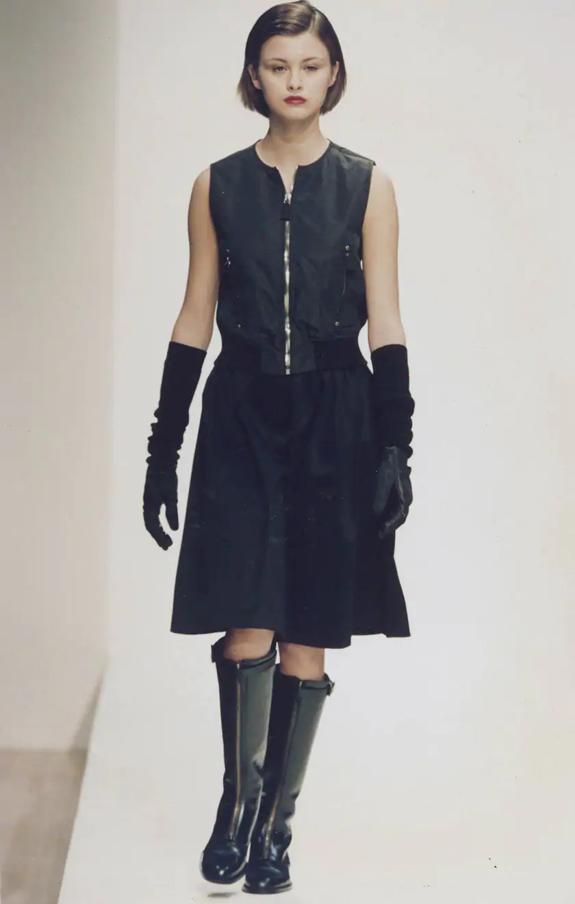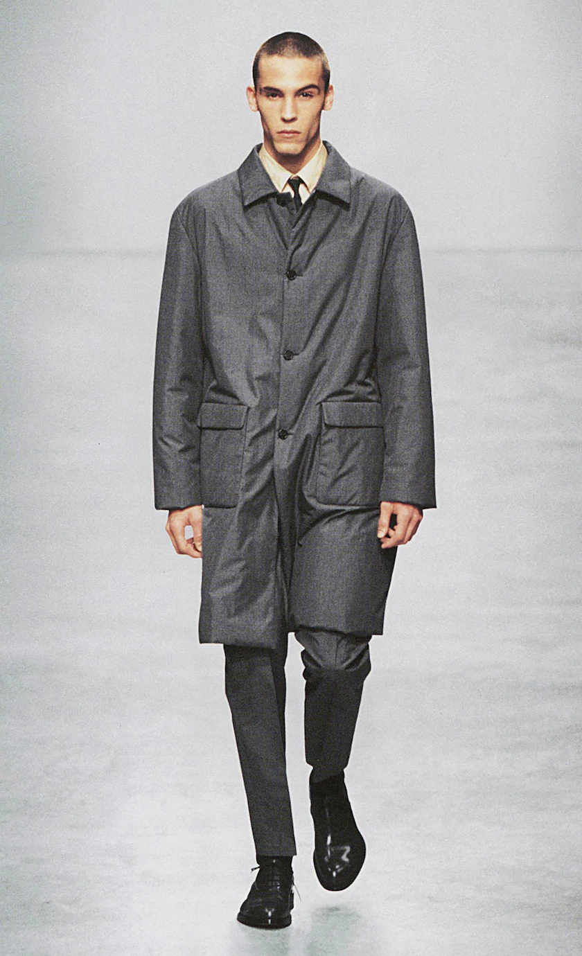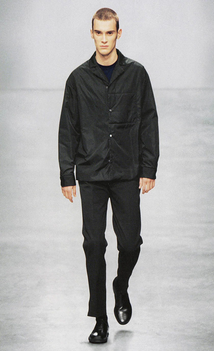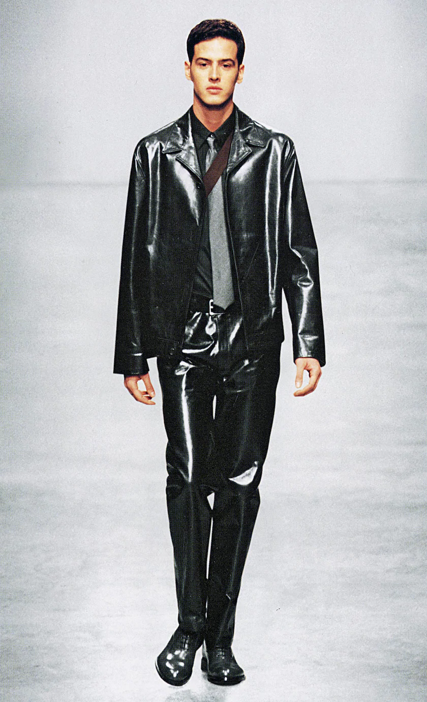 It took a few more years, with the FW94 collection, for the material to make the "jump" from accessories to actual clothes. It was that collection that came close to fulfilling a concept that, in order to truly complete itself, would need a step more: the introduction of a menswear line. In 1993, the men's collection debuted, presenting for the first time the "monochrome look" - the kind of dark-coloured minimalism born in response to the maximalism of the 80s.