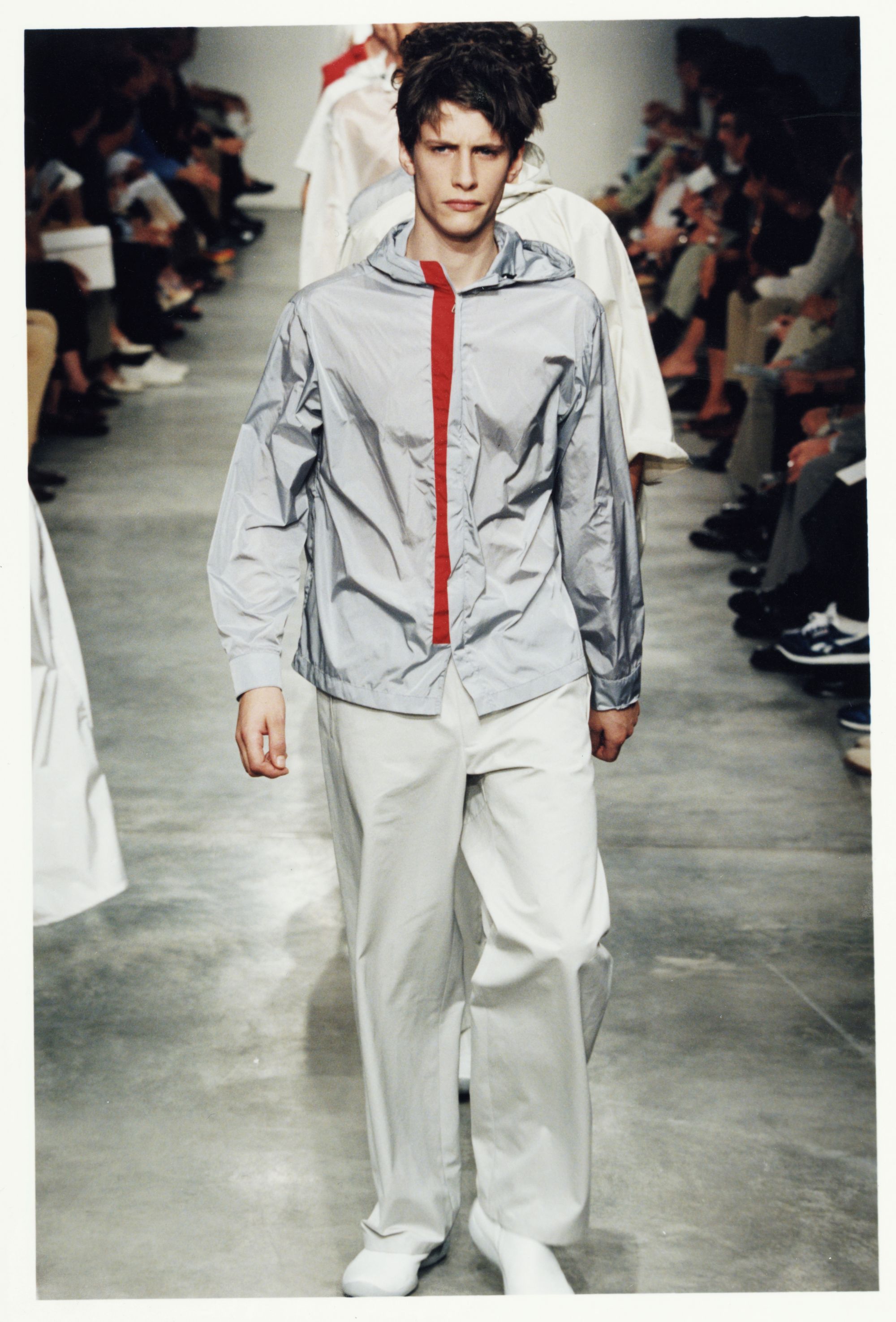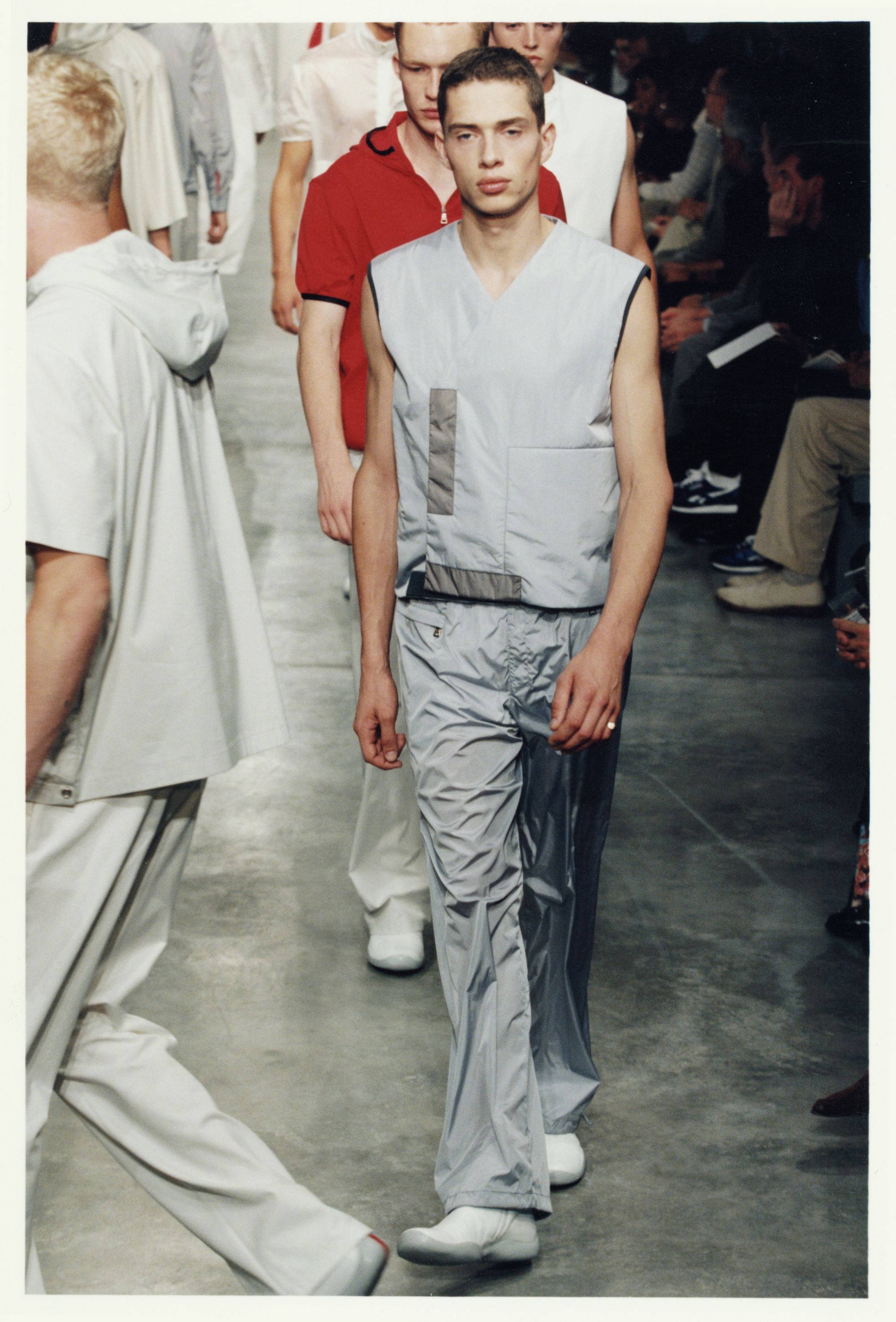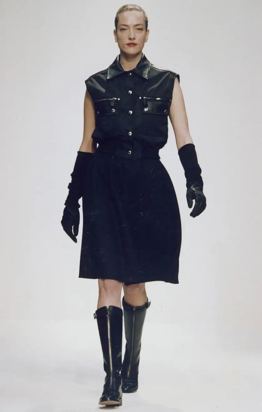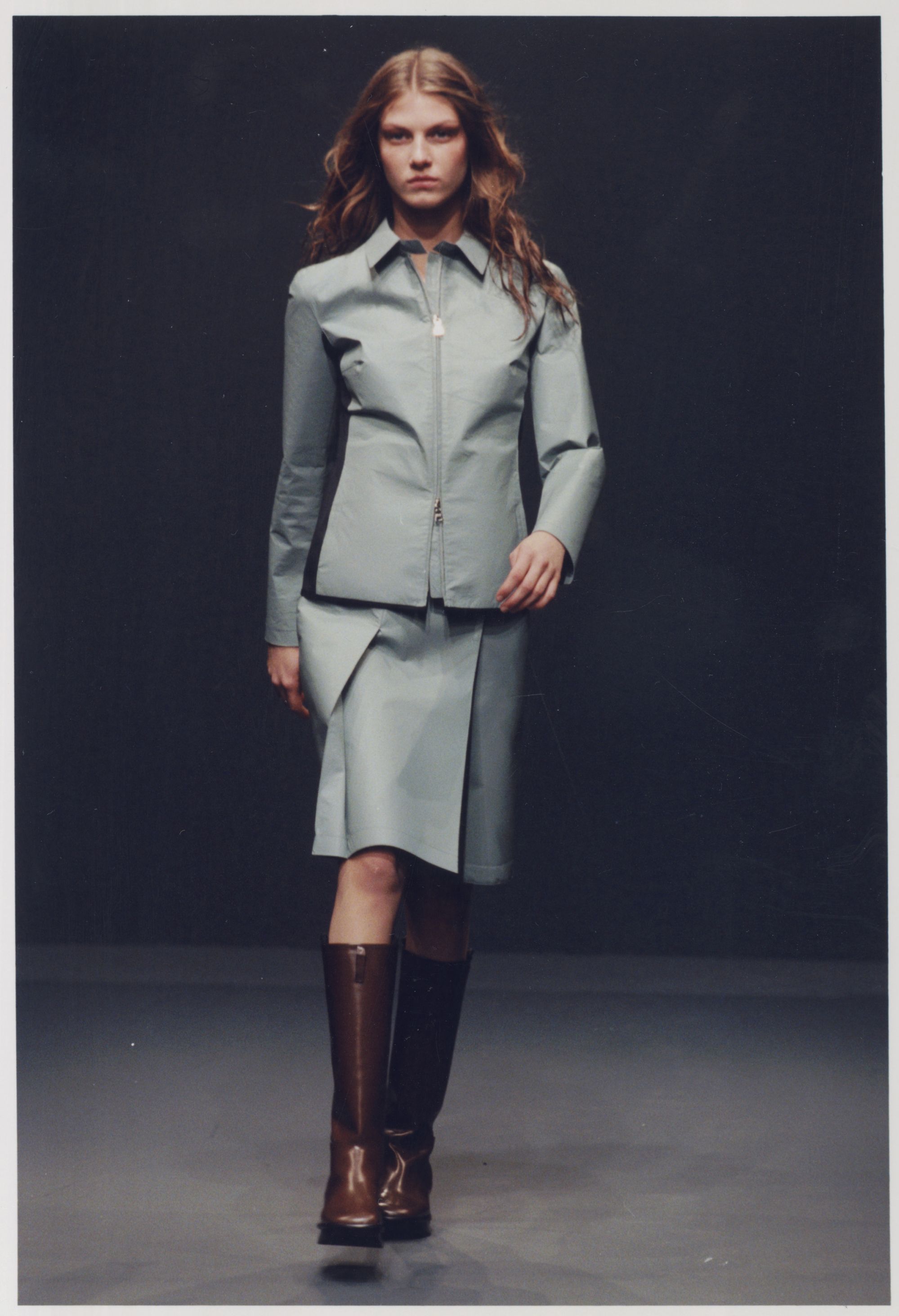 It took a few more years, with the FW94 collection, for the material to make the "jump" from accessories to actual clothes. It was that collection that came close to fulfilling a concept that, in order to truly complete itself, would need a step more: the introduction of a menswear line. In 1993, the men's collection debuted, presenting for the first time the "monochrome look" - the kind of dark-coloured minimalism born in response to the maximalism of the 80s.
