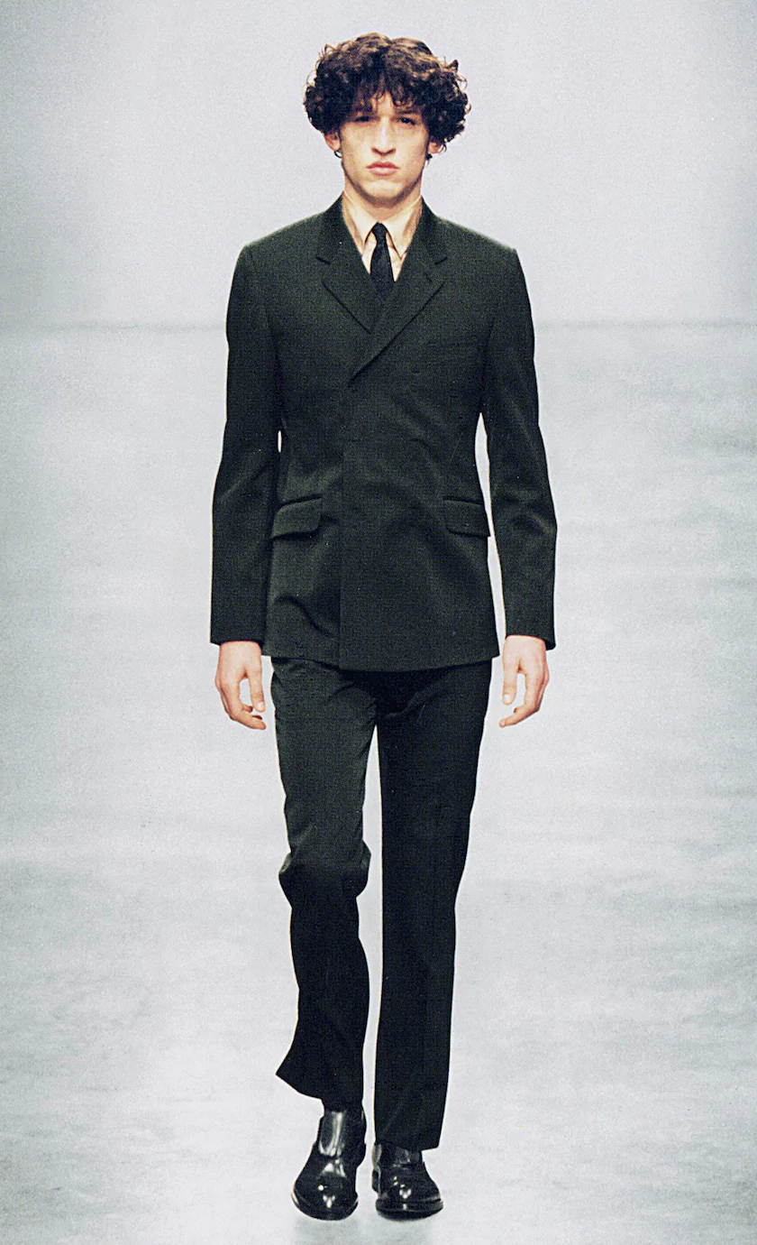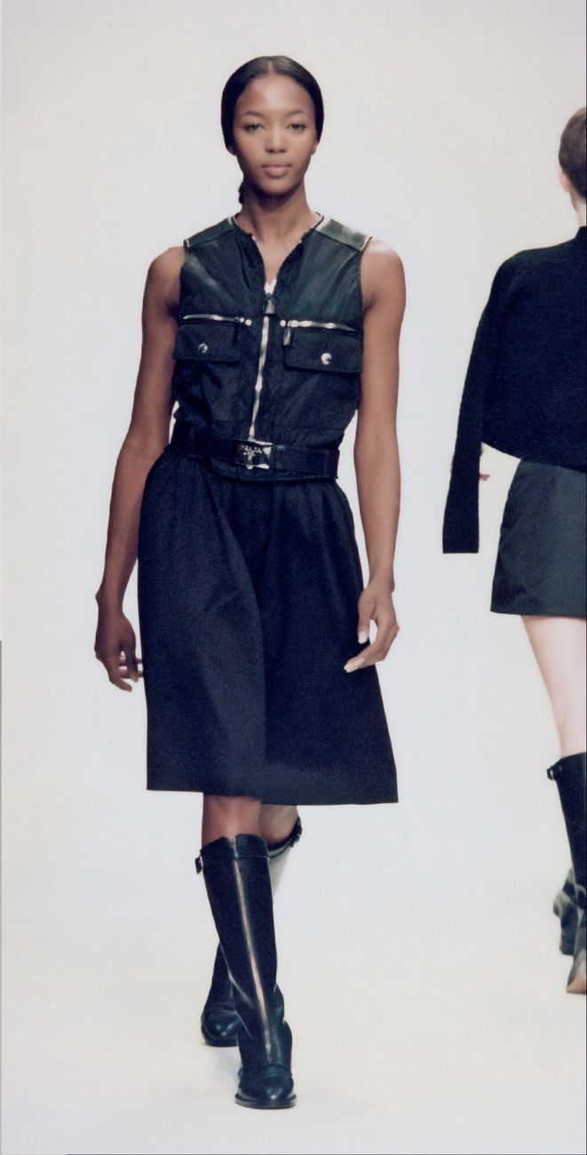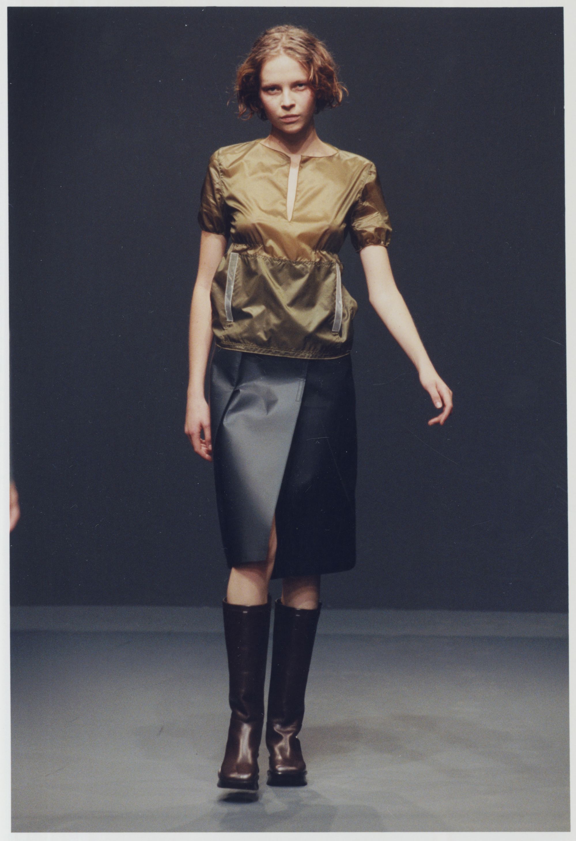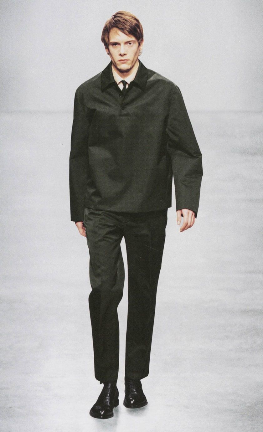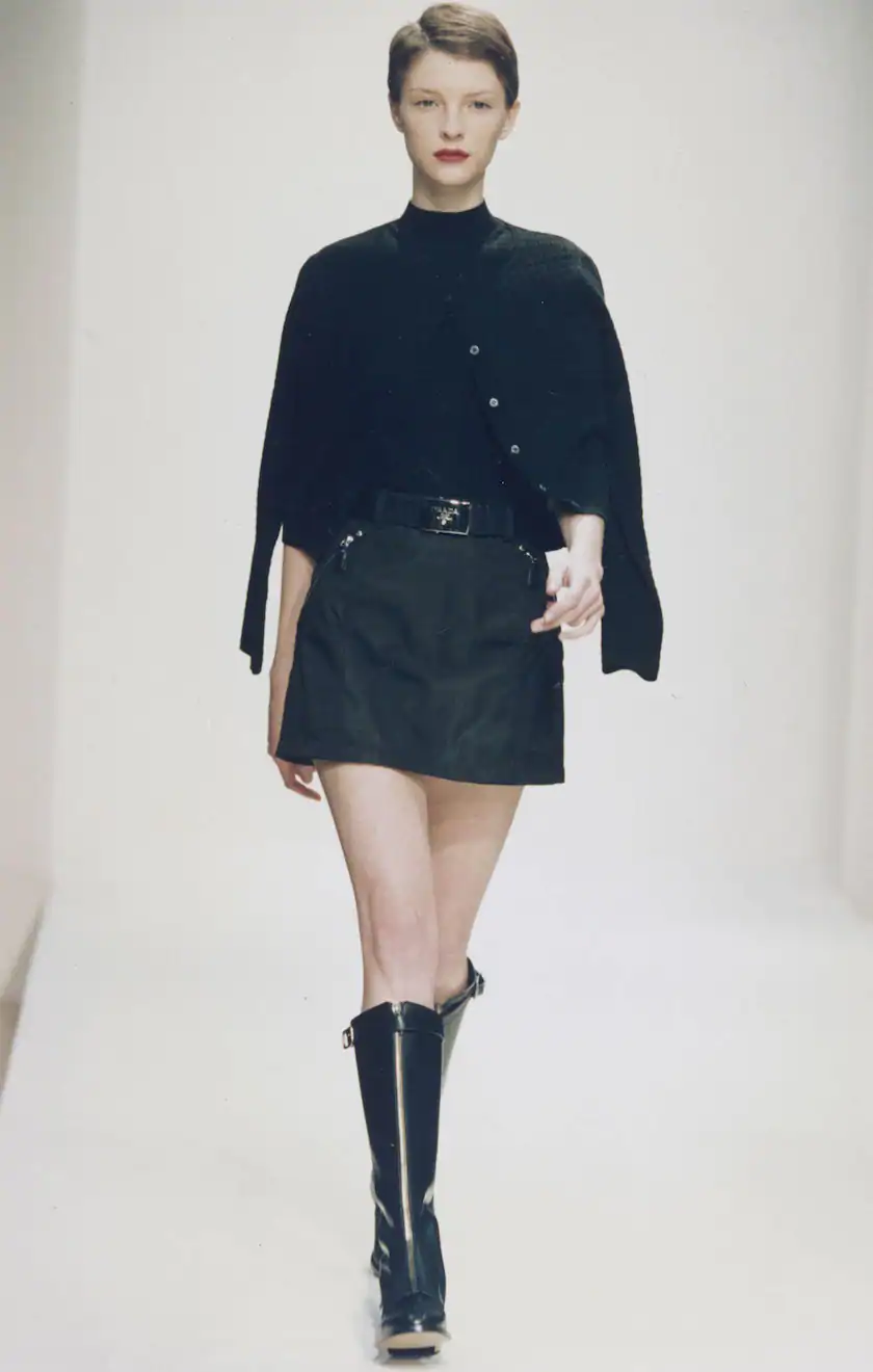 It took a few more years, with the FW94 collection, for the material to make the "jump" from accessories to actual clothes. It was that collection that came close to fulfilling a concept that, in order to truly complete itself, would need a step more: the introduction of a menswear line. In 1993, the men's collection debuted, presenting for the first time the "monochrome look" - the kind of dark-coloured minimalism born in response to the maximalism of the 80s.
