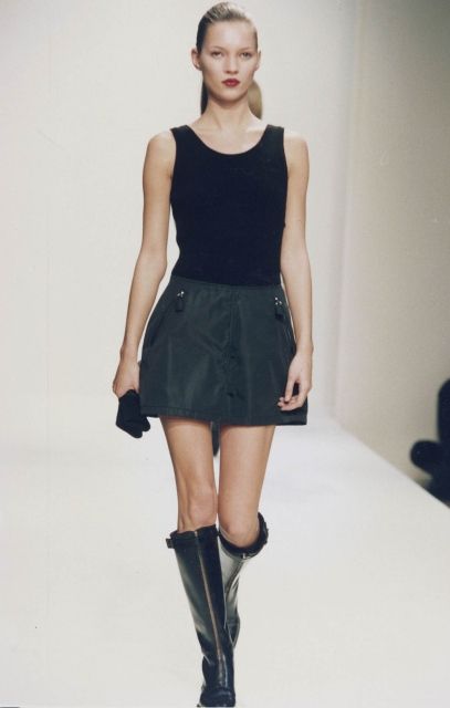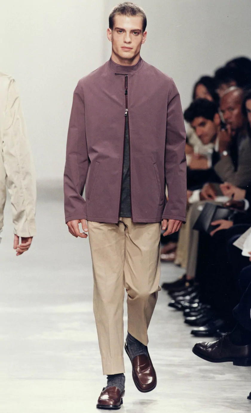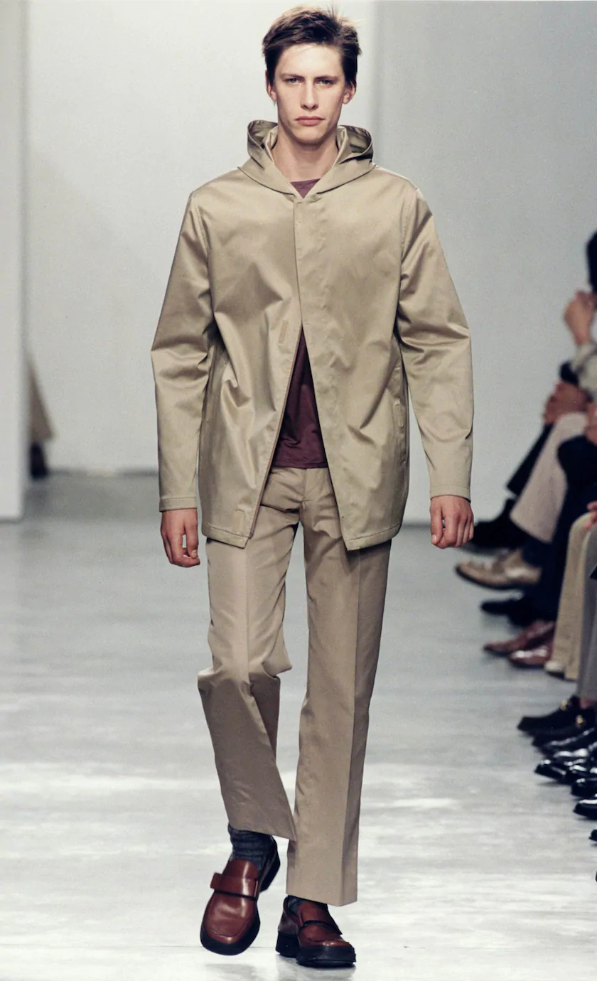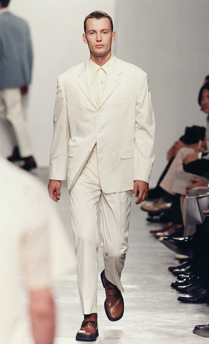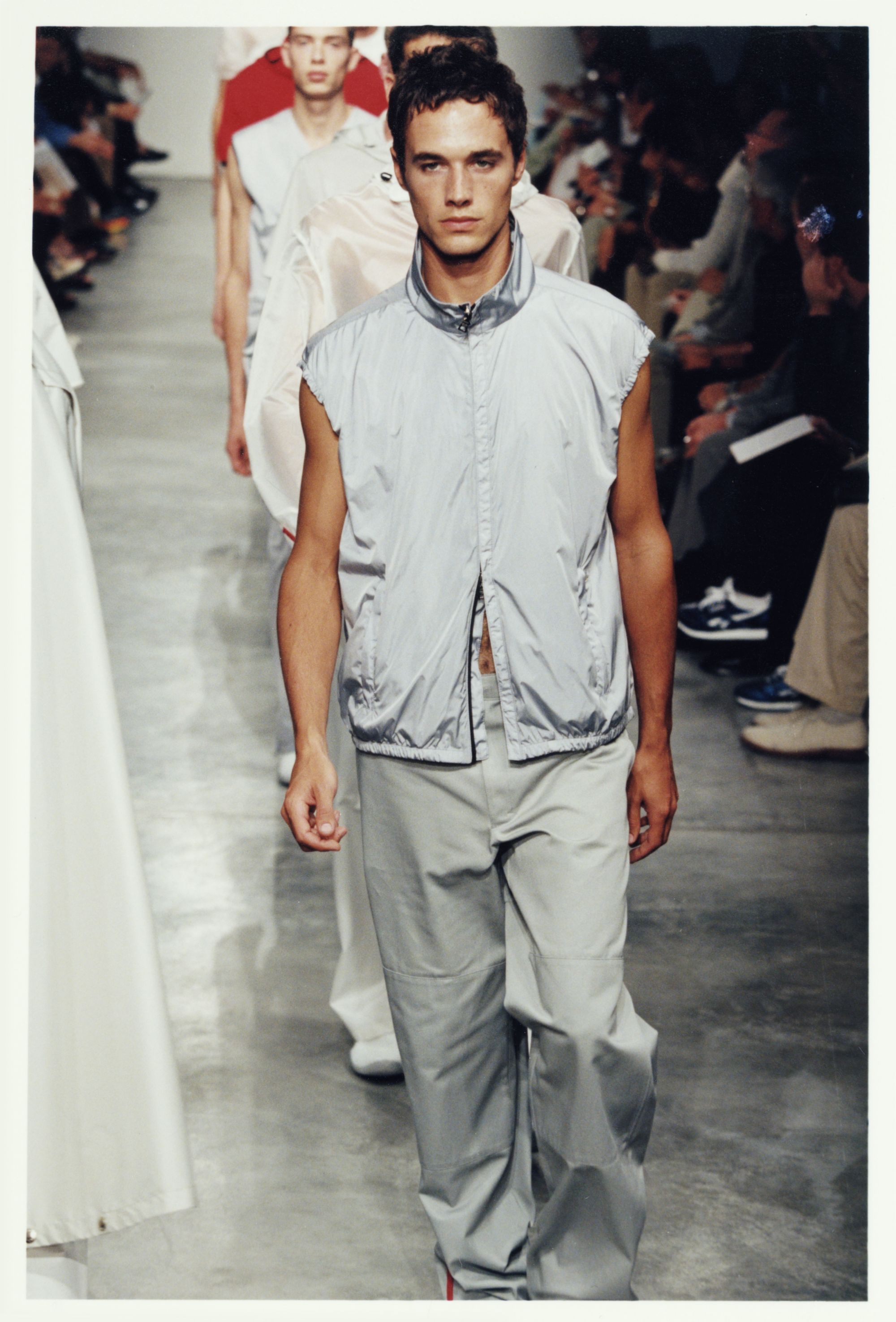 It took a few more years, with the FW94 collection, for the material to make the "jump" from accessories to actual clothes. It was that collection that came close to fulfilling a concept that, in order to truly complete itself, would need a step more: the introduction of a menswear line. In 1993, the men's collection debuted, presenting for the first time the "monochrome look" - the kind of dark-coloured minimalism born in response to the maximalism of the 80s.