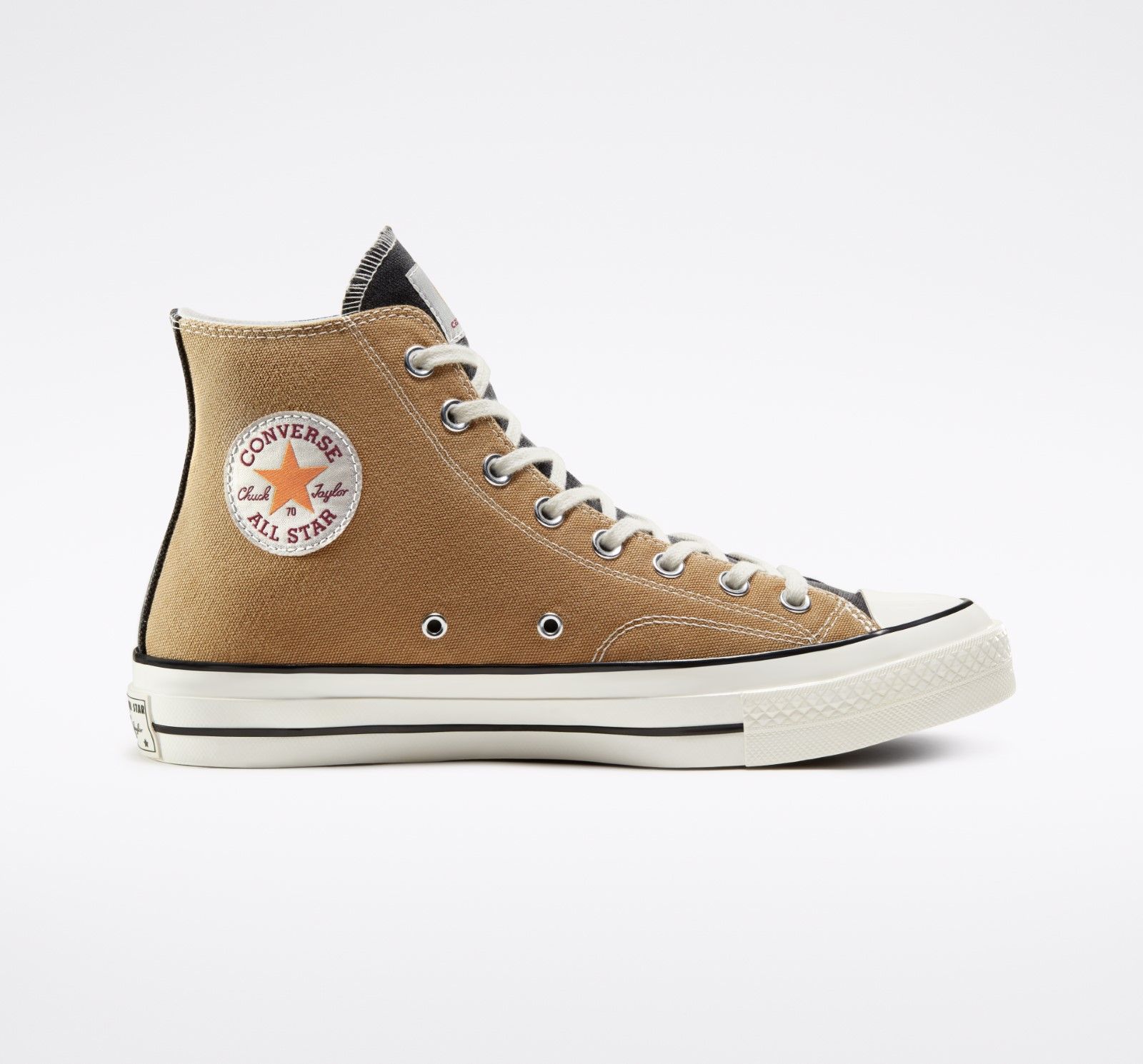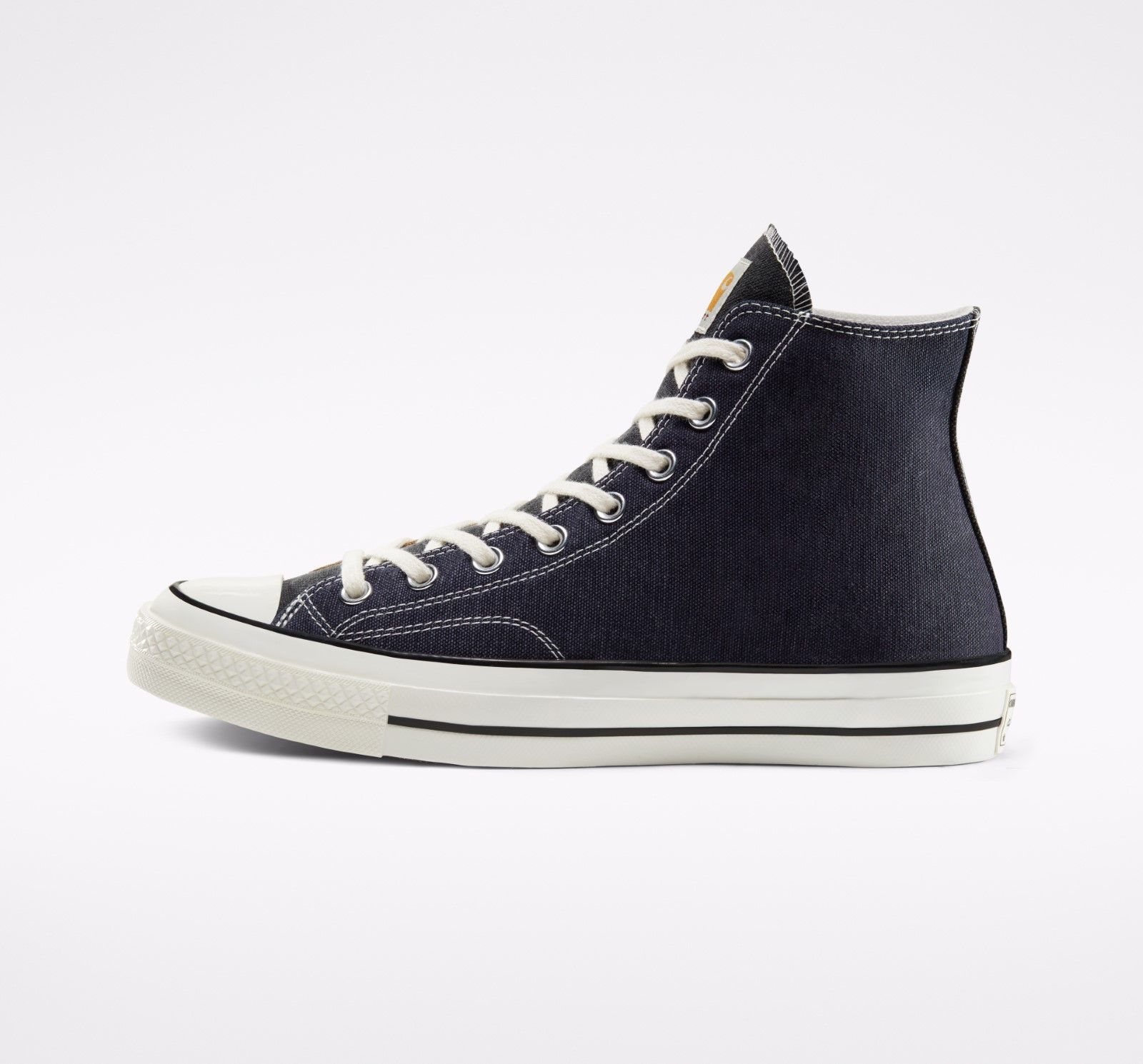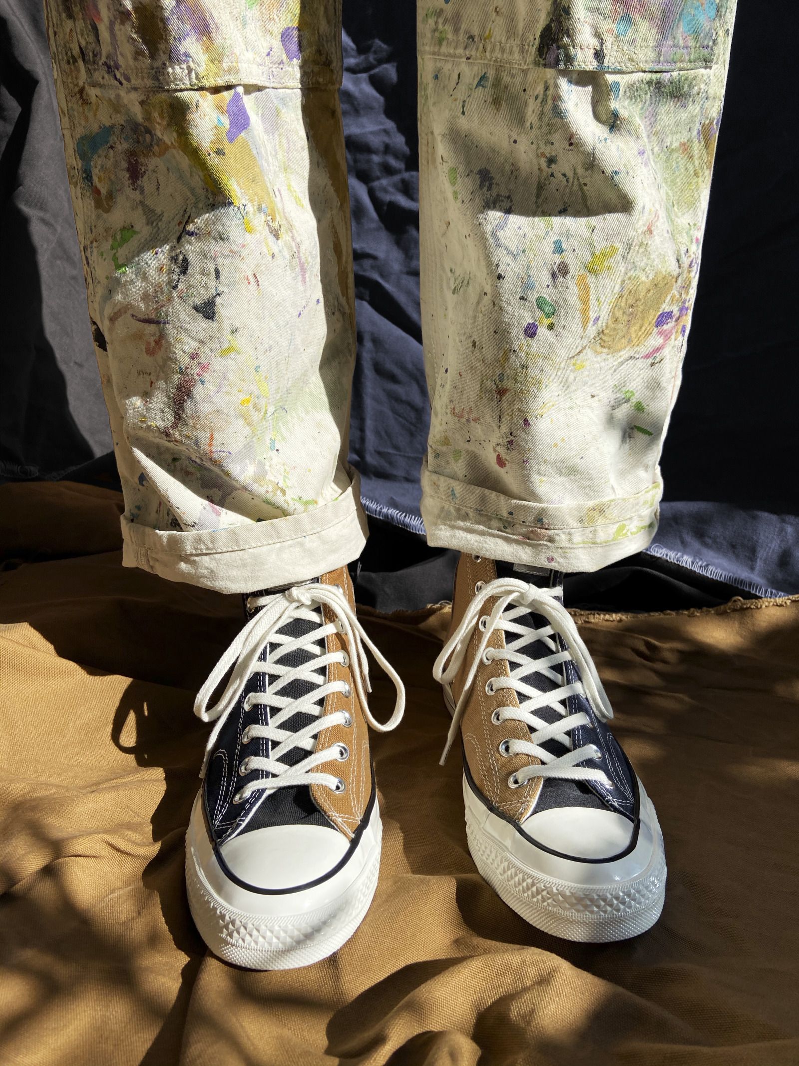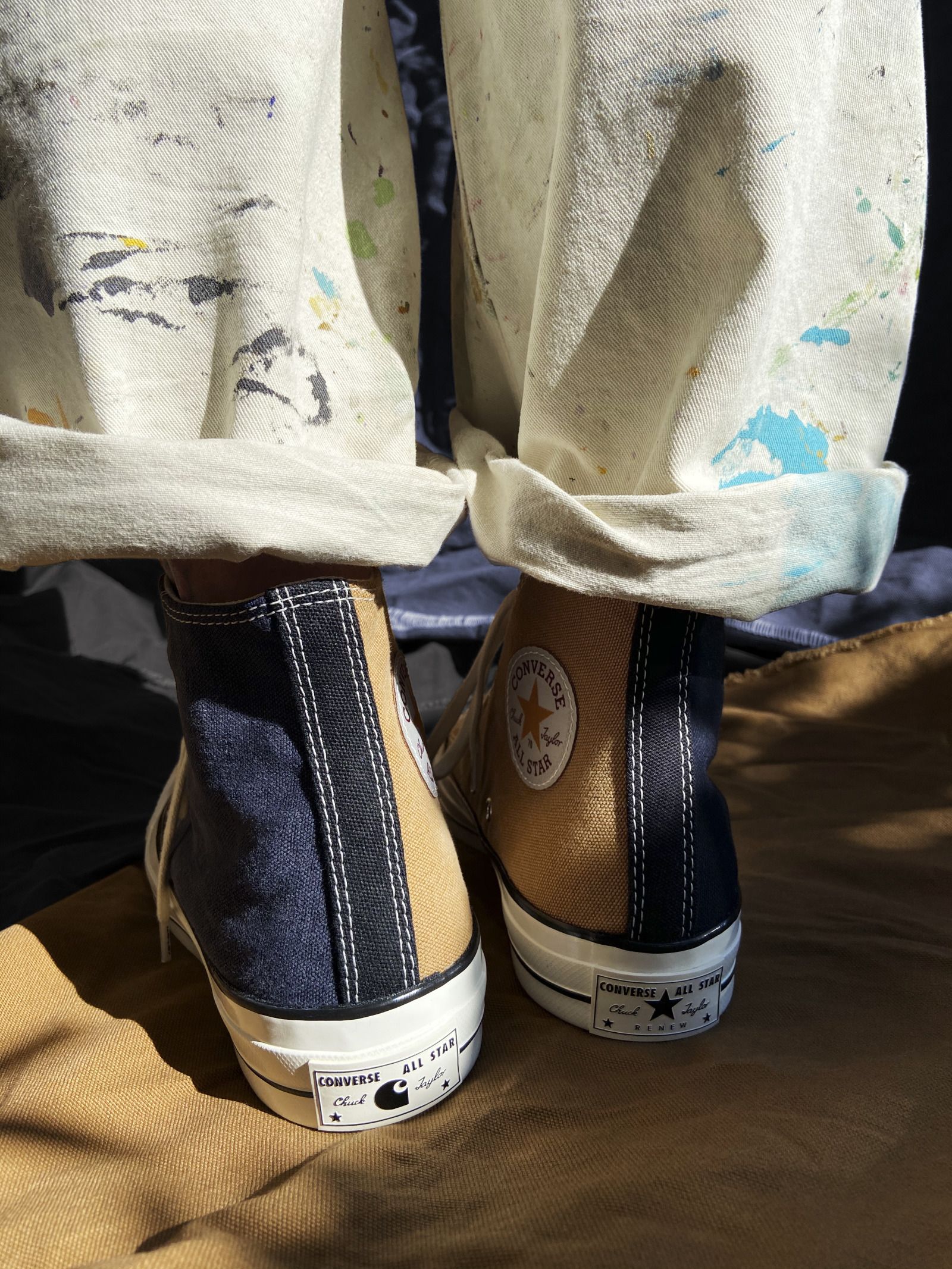 Carhartt WIP's work jackets, trousers and overalls, recovered from vintage British retailer Beyond Retro, were organized according to the three colorways of navy, black and brown and transformed into the canvas panels of the Chuck 70. The result is that no sneaker is the same as another one. With the introduction of its Renew initiative, Convers and Carhartt WIP were able to prevent 108,000 textile products from ending up in a landfill.