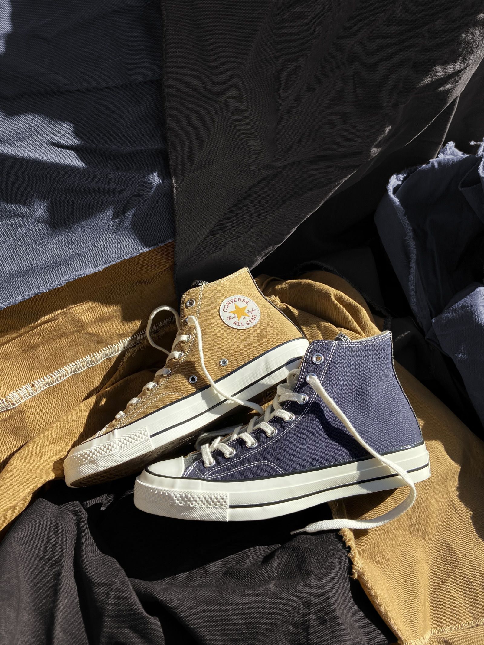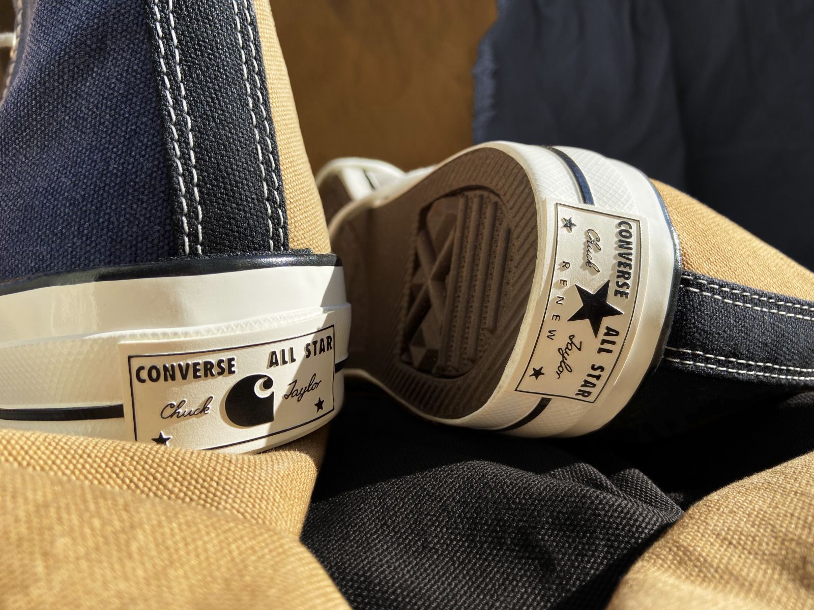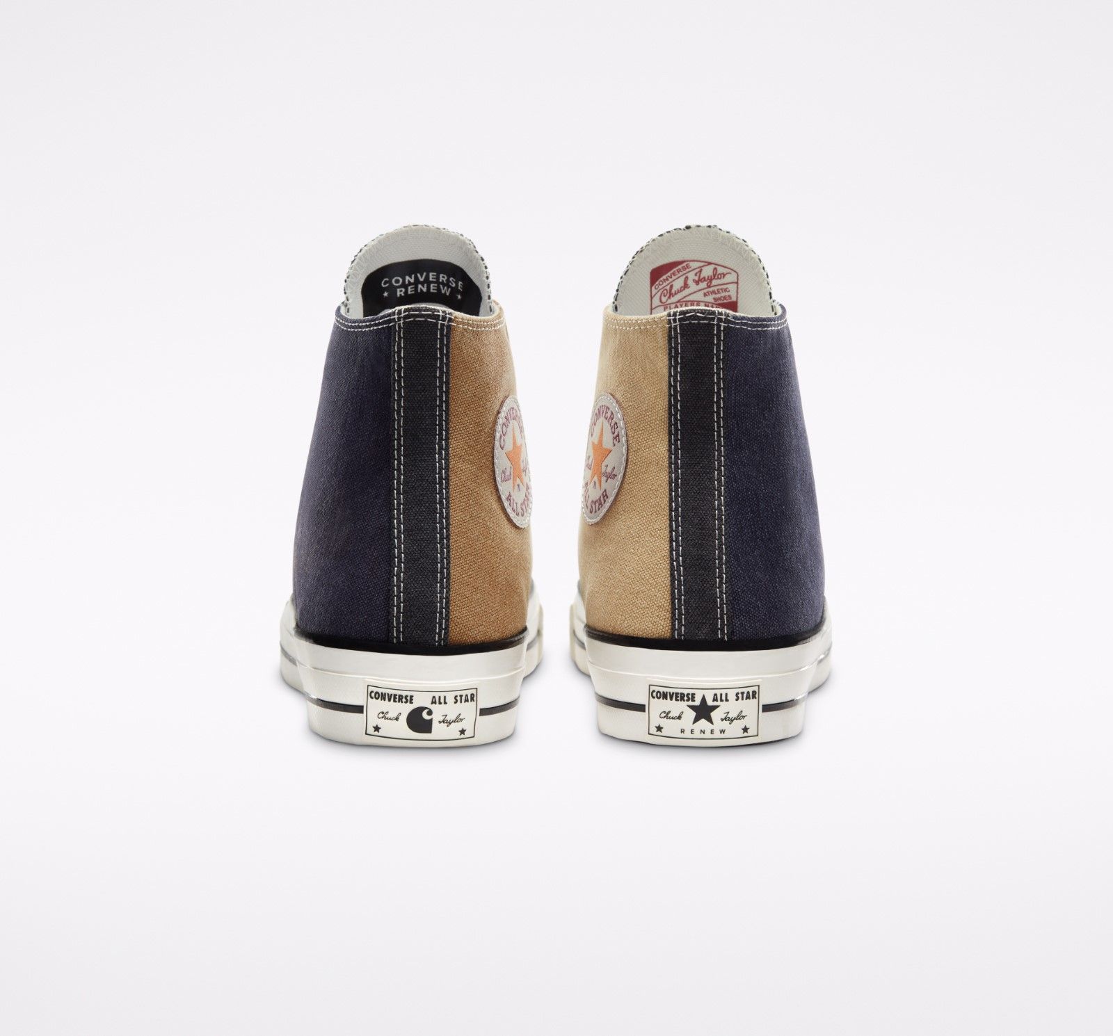 Converse Renew is Converse's new initiative that addresses the challenge of creating products with materials made from the upcycling of industrial waste and second-hand clothes to develop new and more sustainable ways to create their own silhouettes. The collaboration between Converse and Carhartt WIP, renewed again this season, has employed textile materials made from Carhartt garments used to create its new range of Chuck 70.