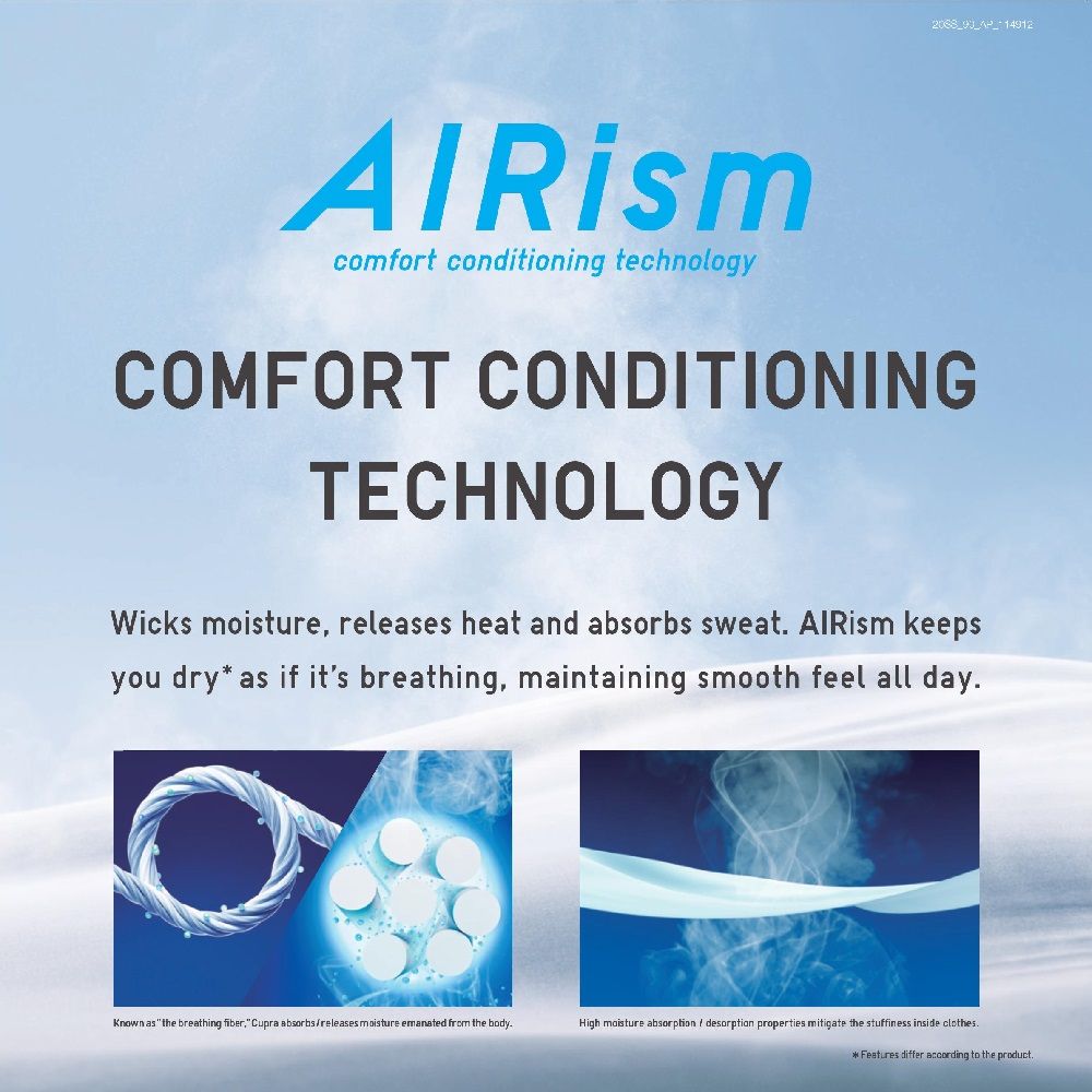 Uniqlo's AIRism fabrics are made by Toray using ultra-thin polyester fibers twelve times smaller than a human hair and free of superficial irregularities. Thanks to their structure, they prevent a build-up of body moisture at the skin level and the formation of microbes and precisely because, in addition to naturally absorbing the smells, their subtlety result in having an elasticity and adaptability much greater than those of natural cotton - which compared to the microfiber of Toray, for example, can retain moisture but not release it in a short time.