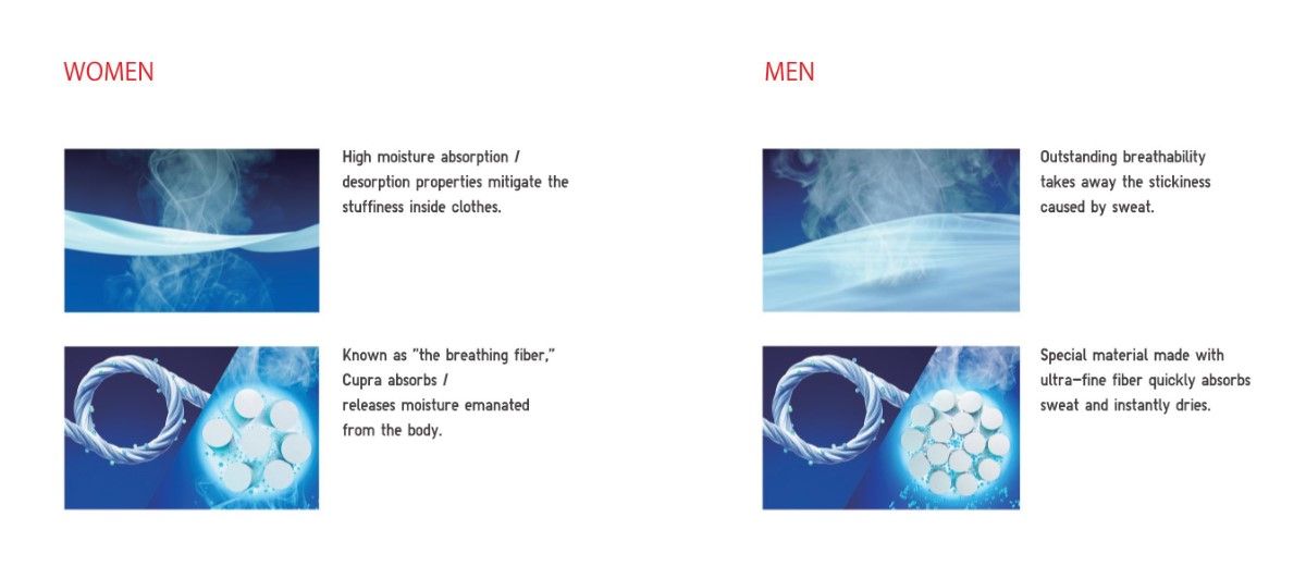The powerful drying capacity of the fibers is precisely what allows a constant adjustment of heat, functioning exactly like a second skin. The size of the fiber, then, are as important as the texture of its surface: the smoother the surface of the cloth, the easier it will be for the body heat and moisture of the wearer to transfer to the dress and then disperse outside. The composition of the garments varies between the men's and women's collections: the garments in the men's collection are aimed at eliminating sweat more quickly, while those of the woman's collection, composed in a cupra produced by Ashai Kasei, possess a silkier texture that prevents the fabric from sticking to the skin.