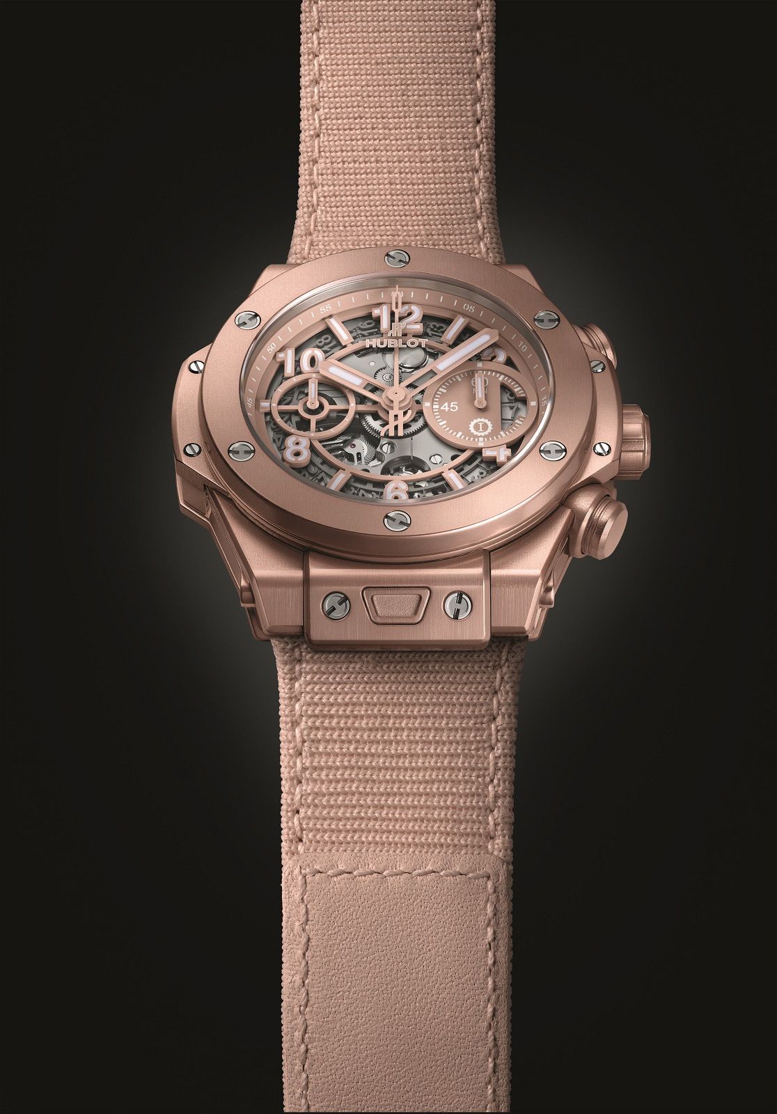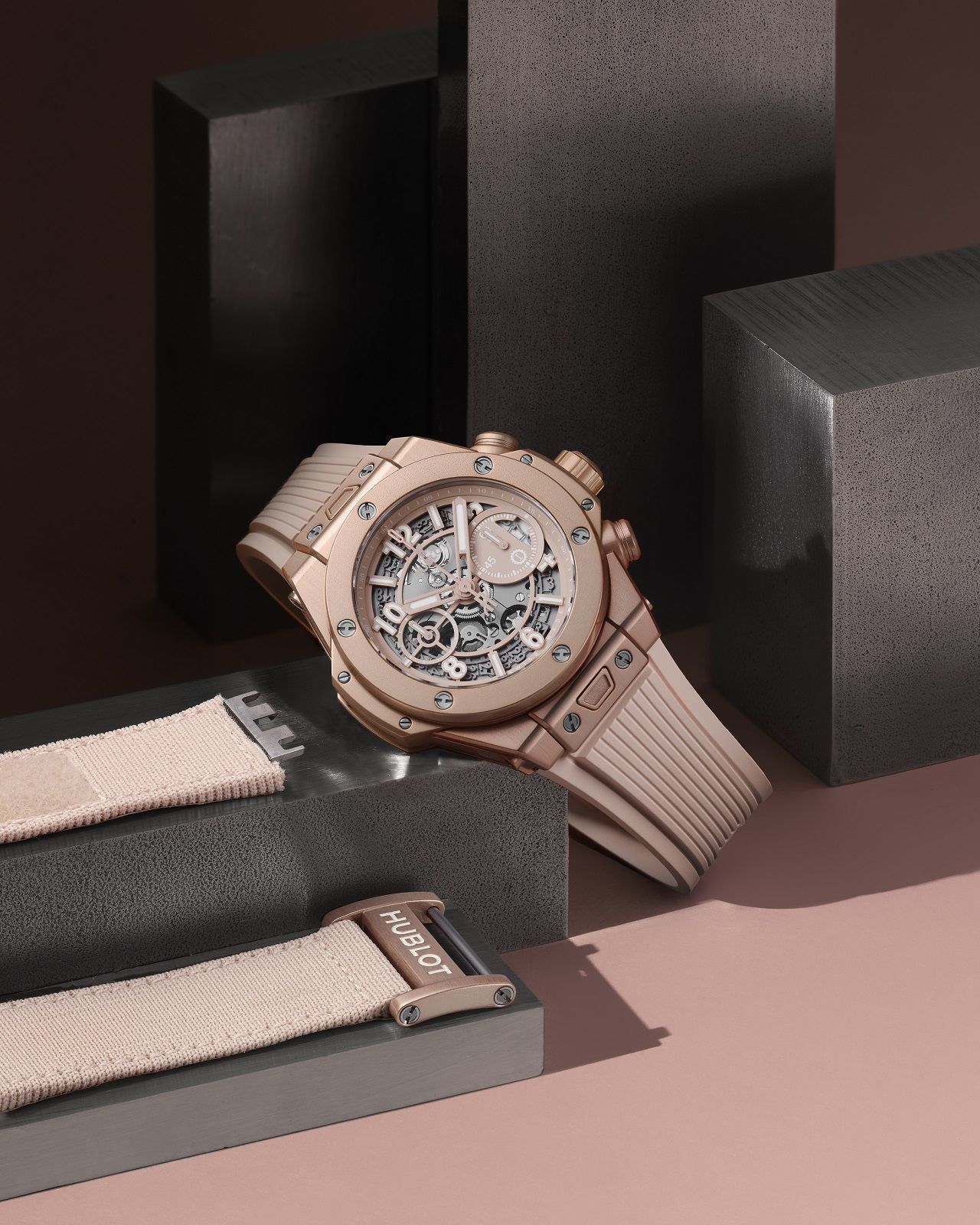 The Big Bang Millennial Pink comes in a limited edition of only 200 pieces and is available including two interchangeable straps: a rubber option finished with a titanium clasp and a velcro/PES knit blend counterpart.