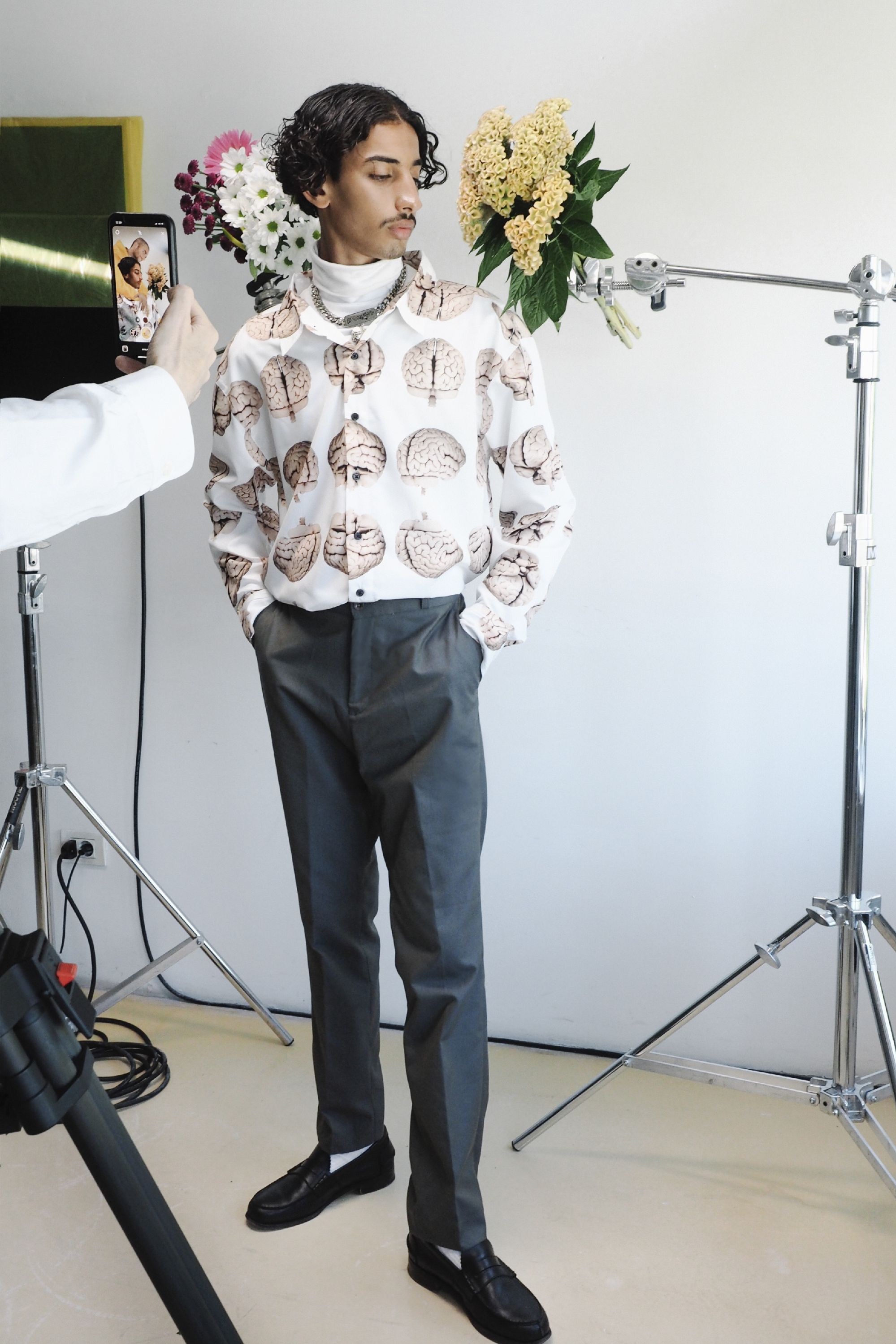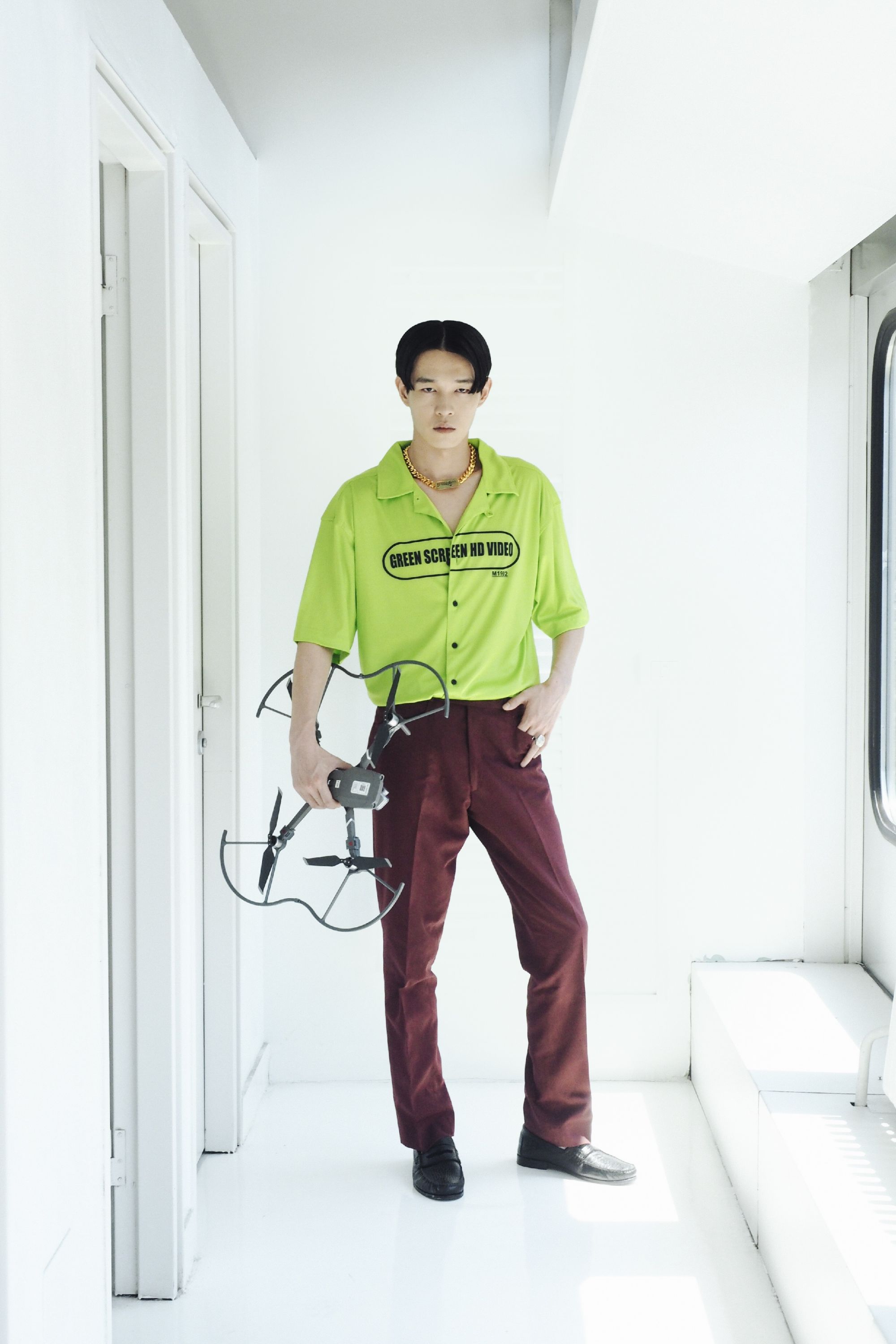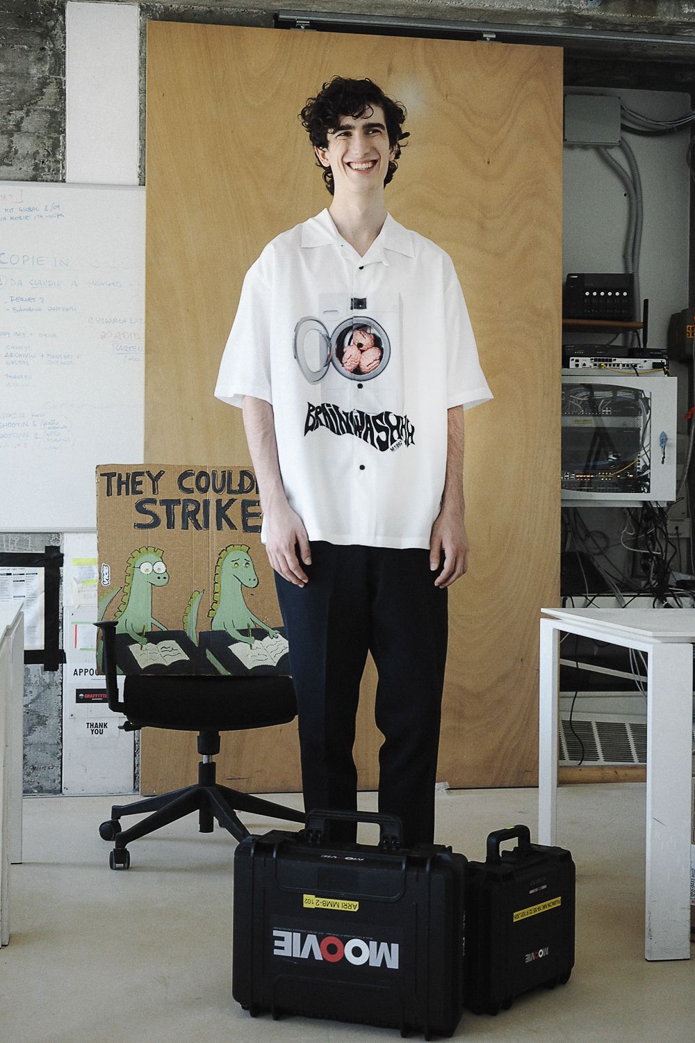 But the cult piece of the collection is undoubtedly the green screen shirt, used in the short film to transform feelings into images and project them on the outfits of the protagonists. The structure of the shirt follows that of the hardcore concert merchandise of the Nineties, made of materials such as viscose and light nylon, sensitive to colour and prints. With short boxy sleeves or formally accolades, they have all the signs and iconography of the present, to be worn rigorously with classic cigarette trousers in the colours of the British-mod imagery and polished moccasins.