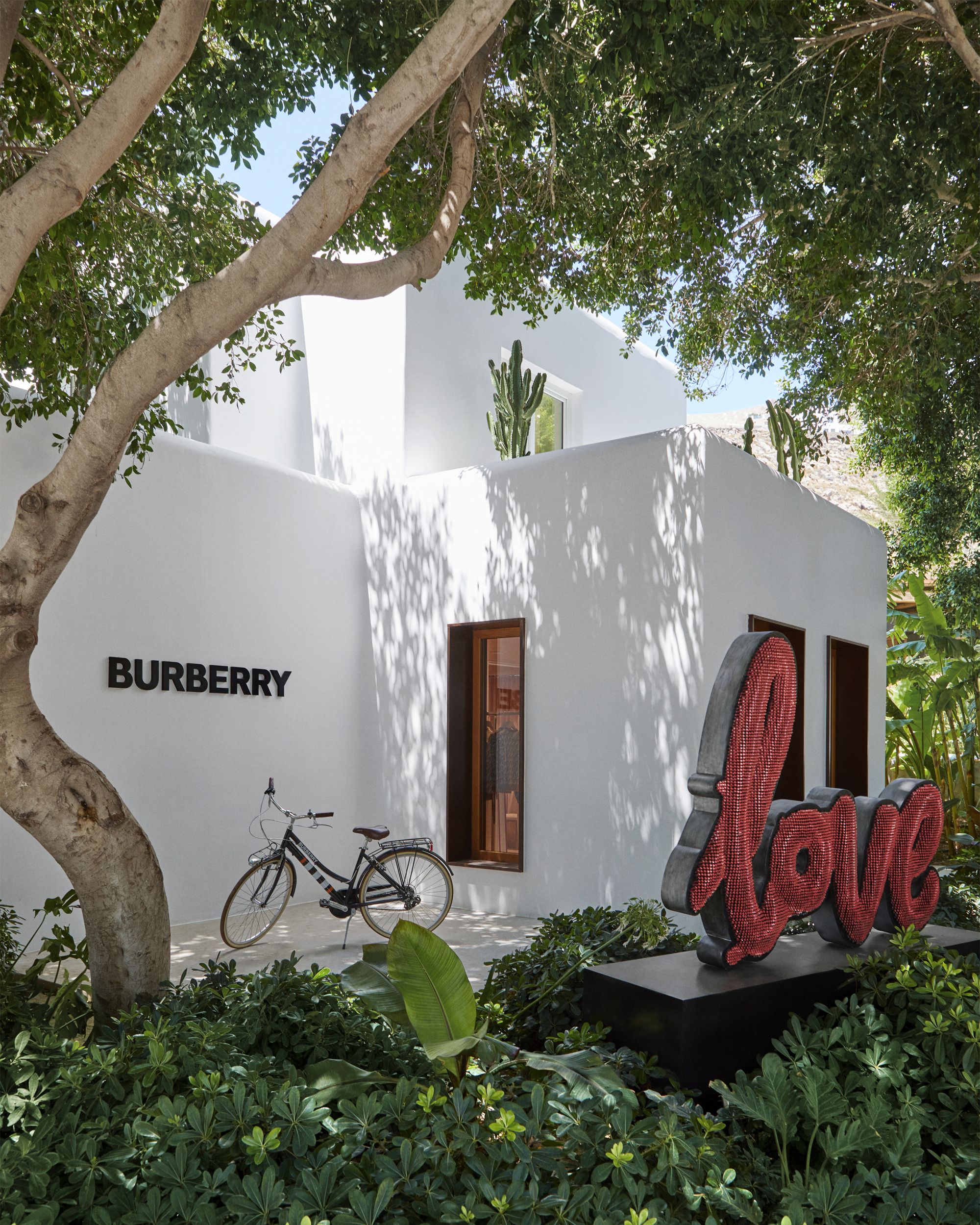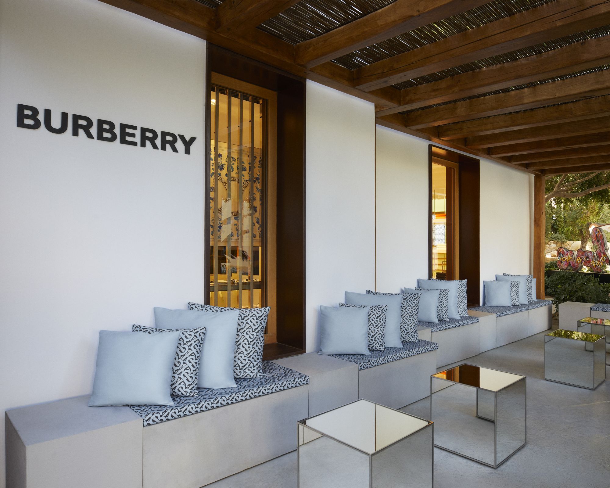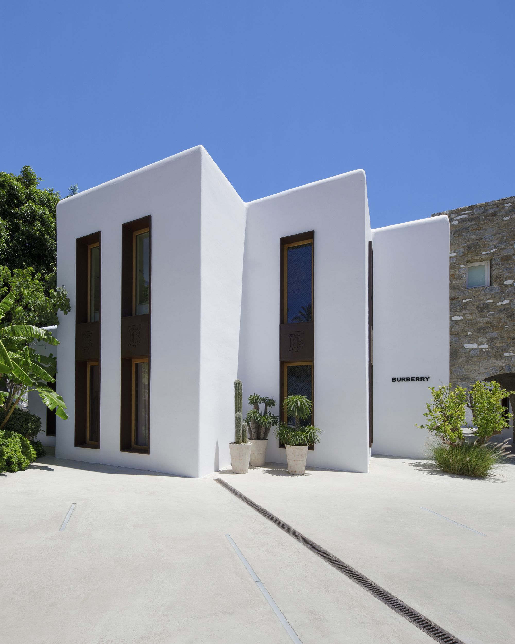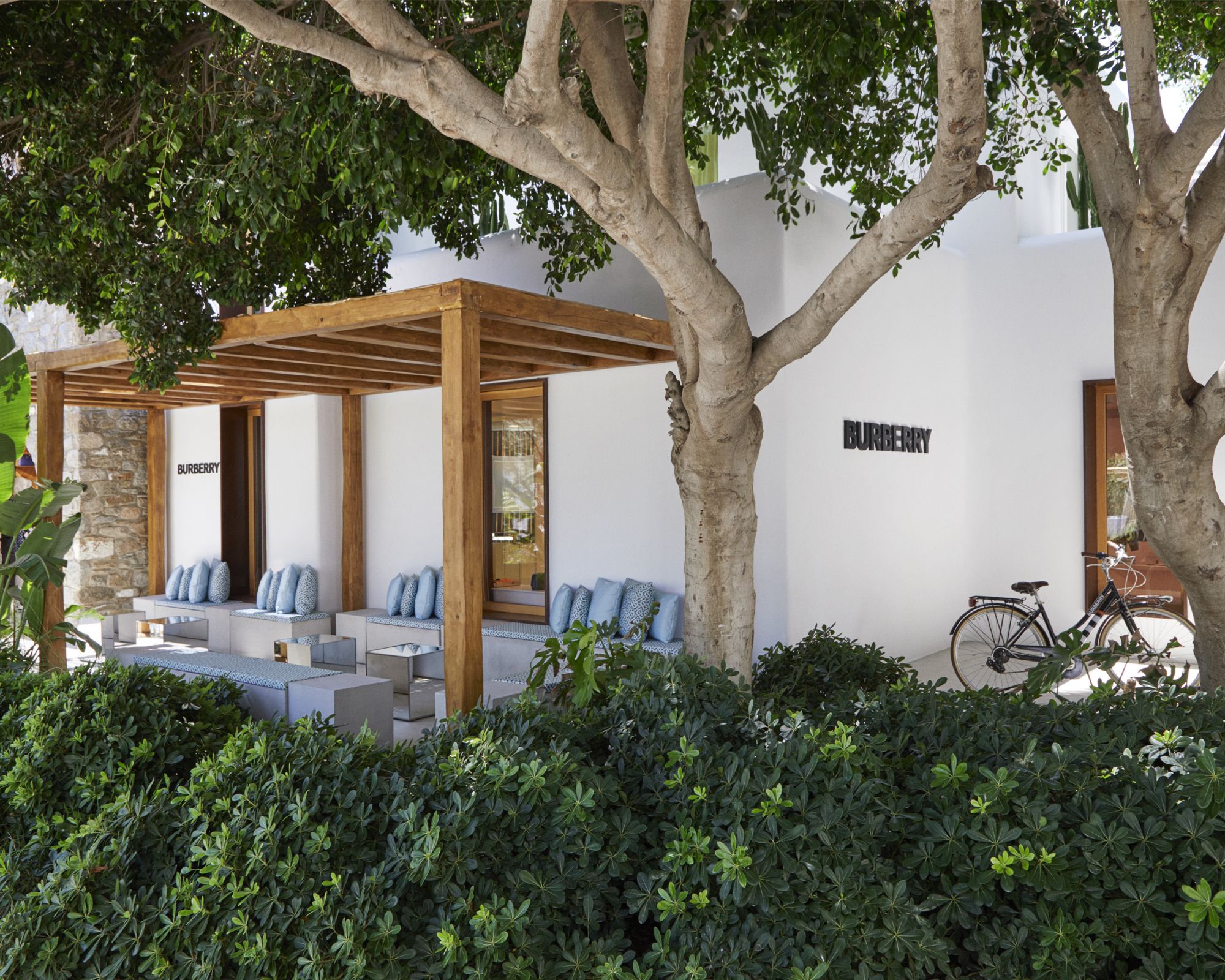 Despite being inspired by the spirit and attitude of the Regent Street store in London, the Burberry pop-up store in Nammos Village, Mykonos is a dip in the Mediterranean aesthetic. Immersed in nature, the structure is presented with a palette of pistachio and beige colors, enriched with blue and pink summer shades. Throughout the store, fixtures and details are built with a variety of materials and textures, from plywood to mirrored and glossy finishes. The outdoor terrace features a wooden pergola inspired by traditional Mykonos buildings, with TB Summer Monogram blue blue siding. The shop will be open until October 2020.