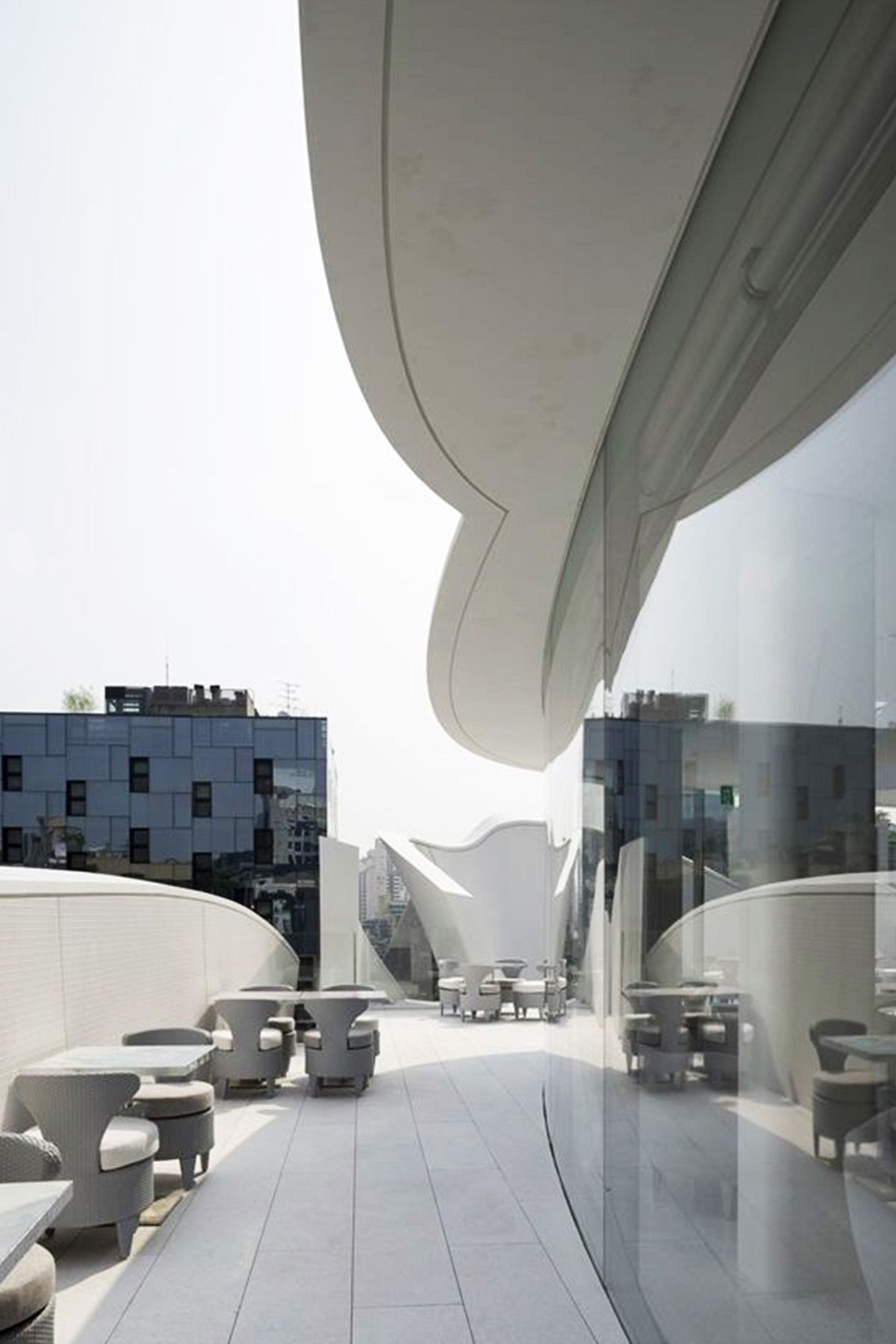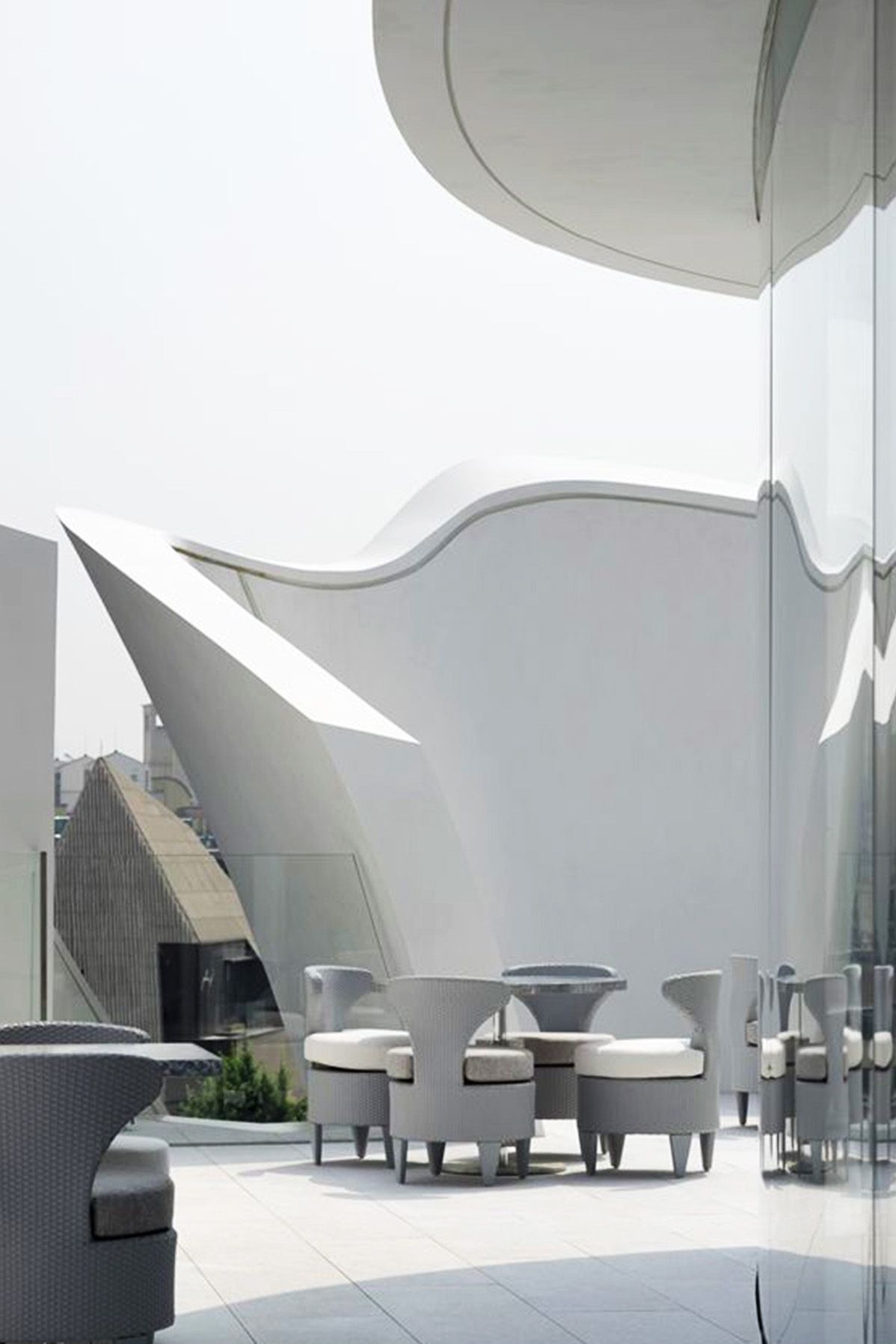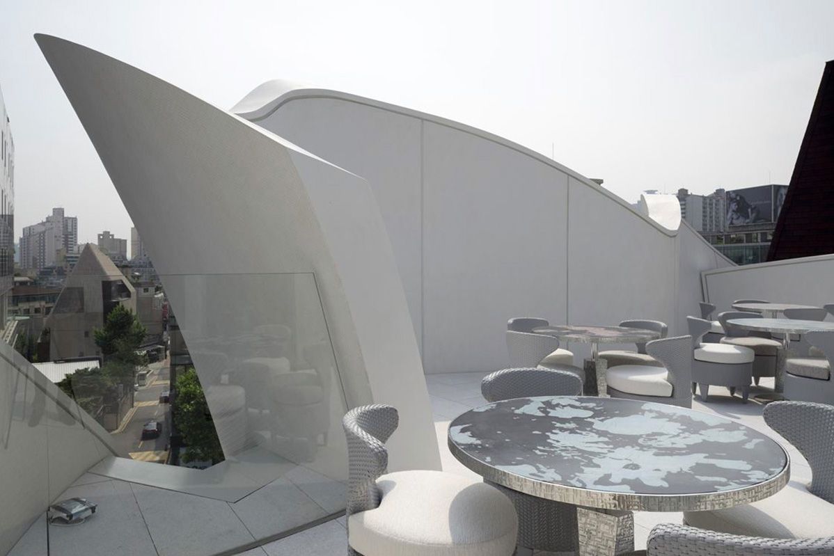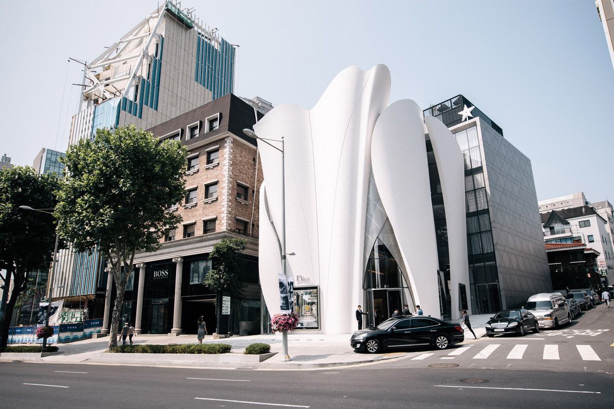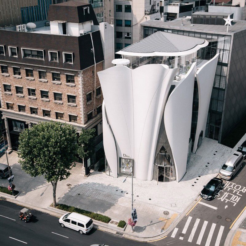 The Dior flagship store in Seoul, South Korea could not be more different from the summer shop in Capri, which manages to blend in among the creepers of the Mediterranean scrub. On the contrary, it is a decidedly more sumptuous and imposing building. Inaugurated in the summer of 2015, the store has a white sculptural facade built on a sail-shaped structure, made of resin glass and fiberglass. Inside, a staircase guides customers through the various collections, up to the top floor, where the shopping day ends with a drink at Café Dior.