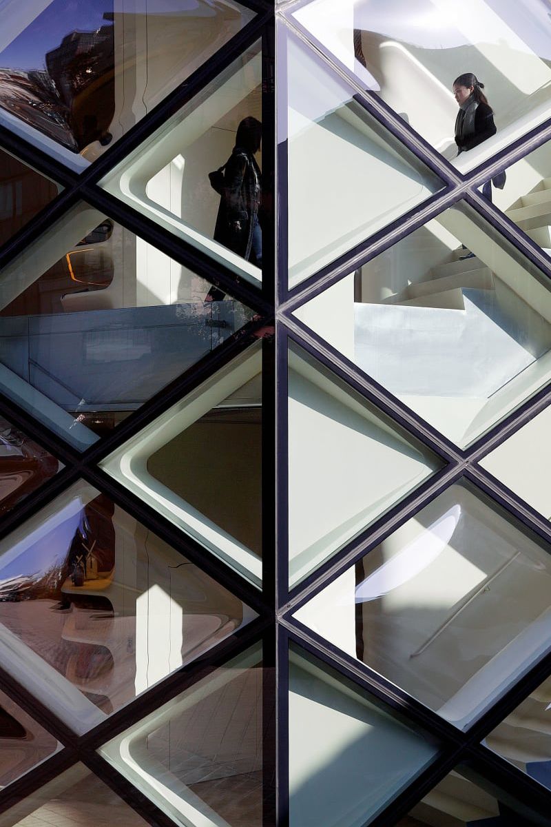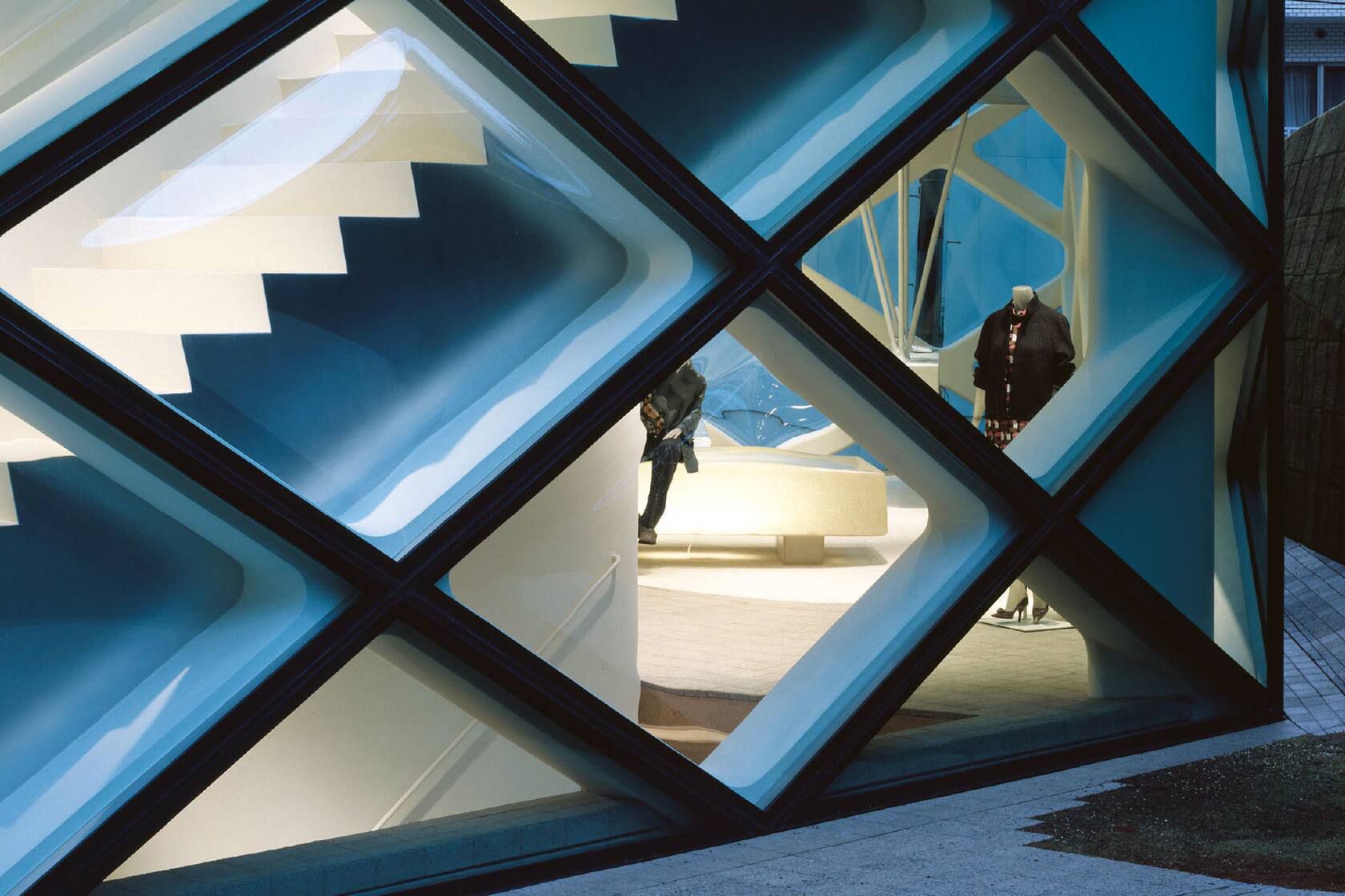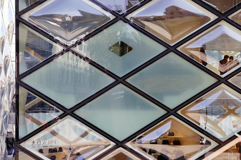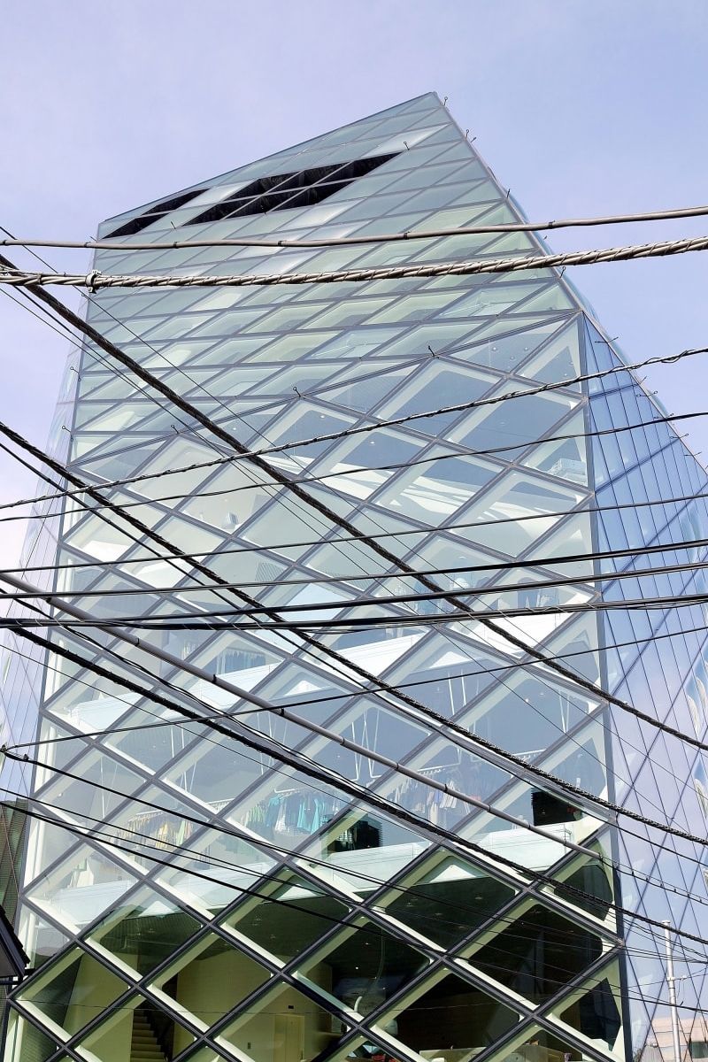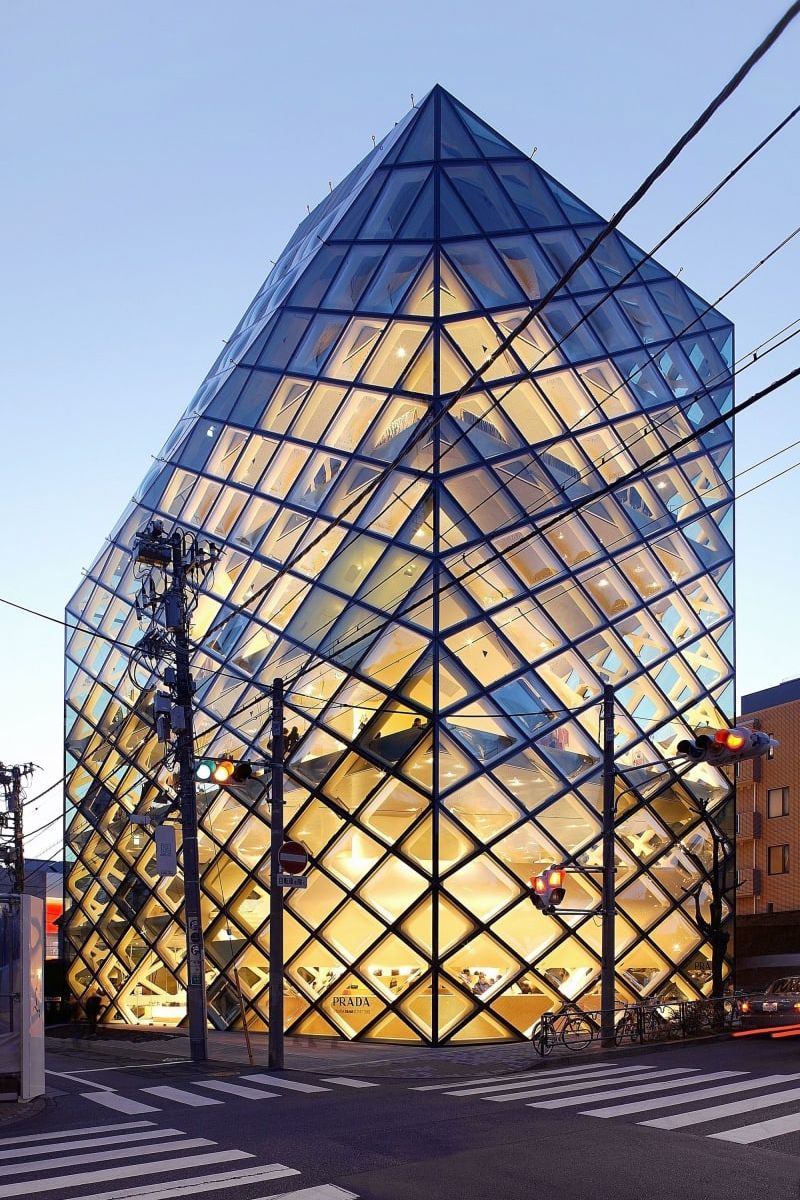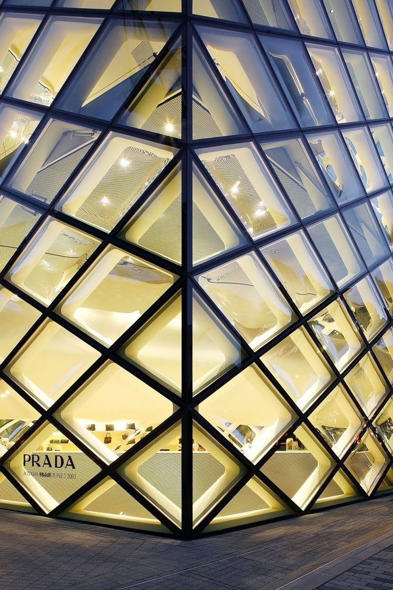 In 2001, almost simultaneously with the opening of the Epicenter in New York, Prada together with the Swiss architects Herzog & de Meuron designed its second Epicenter, this time in Tokyo. The building, built on six floors, is located in the district of Aoyama and is one of the most recognizable architectural works of the city: in particular it is characterized by a diagonal grid that intertwines under the eyes of the public, covered by a glass facade green that focuses on various optical phenomena between the outside and the inside.