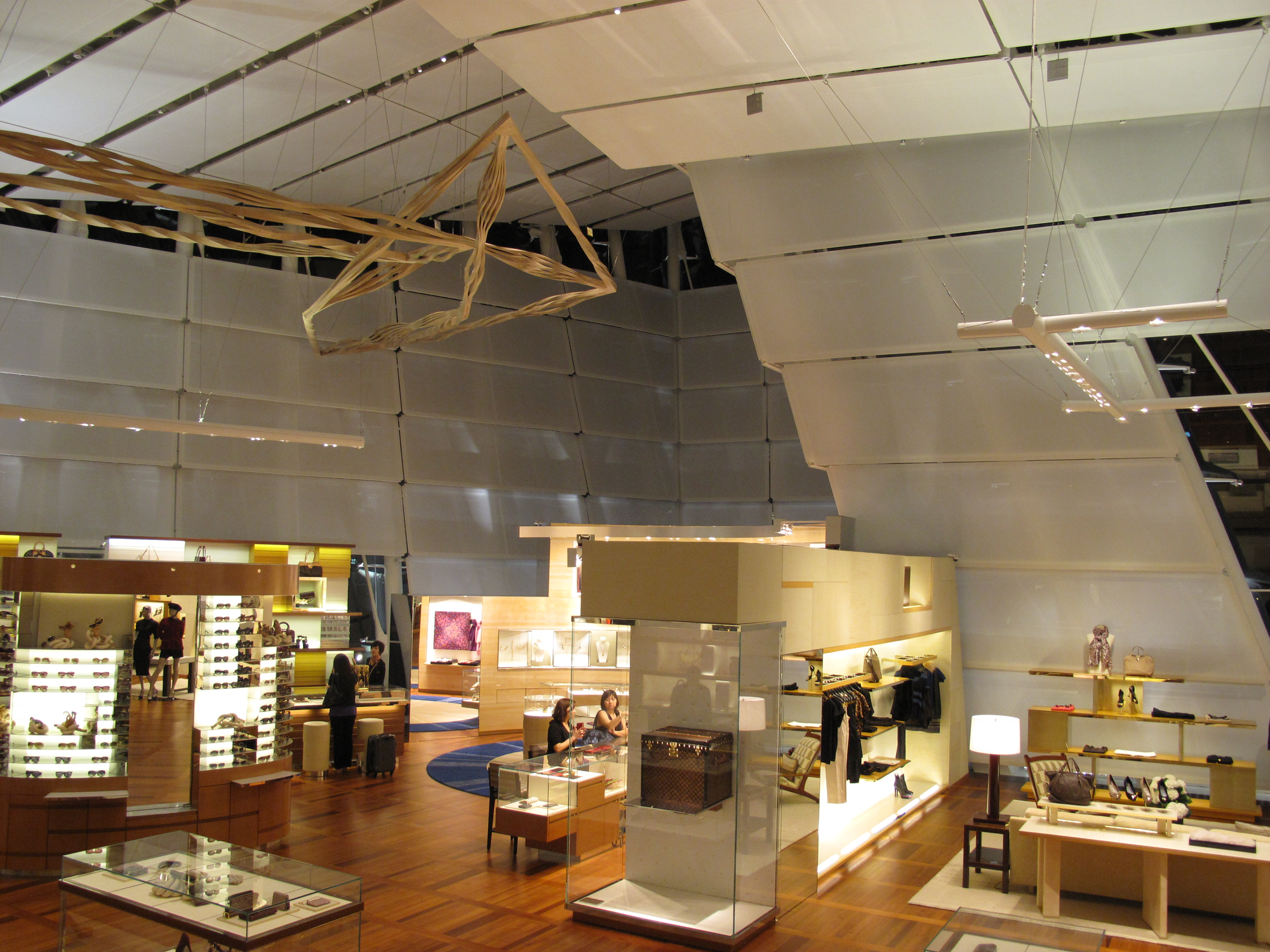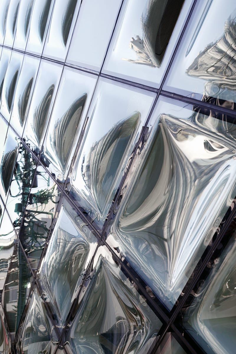Louis Vuitton's new boutique building in Tokyo, signed by architects Jun Aoki and Peter Marino, was officially unveiled in early 2021. Located in the historic location of Ginza, in the same street corner that the brand's boutique has occupied since 1981, the new building has an external glass surface that imitates the waves of water with iridescent reflections, the same aquatic and wavy theme is reproduced in the interiors, decorated by the giant sculpture of a jellyfish and equipped with a staircase with the same wavy style. Inside, the store is spread over four floors and at the last there is a lounge for VIP customers.