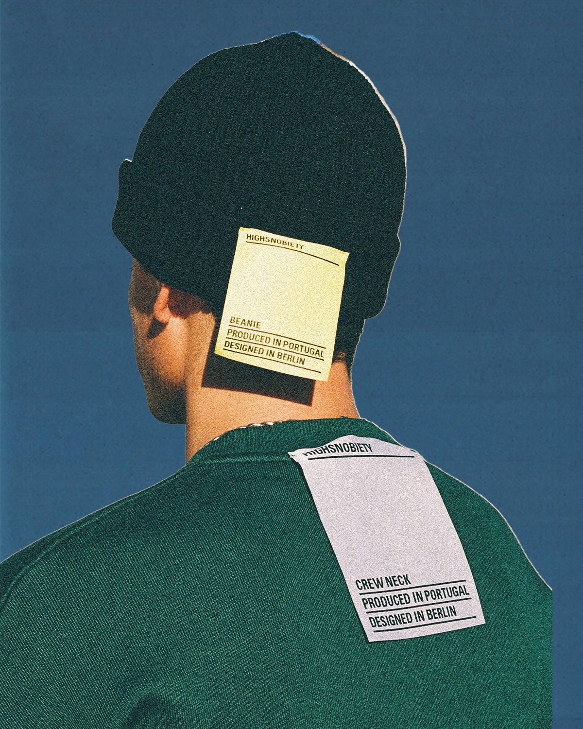 Focusing on the product, the Staples Collections consists of six hoodies and six t-shirts, five crewnecks and five baseball hats, four wool caps in the colorsways of white, black, burgundy, green and blue – as well as a pair of white sponge socks. The quality of the materials and the clean design trace the aesthetics of the new normcore that takes up the fit of Yeezy and the typical Berlin style with a soft color palette. The oversized label sewn on each garment best represents the essentiality of the collection "Produced in Portugal, designed in Berlin".
