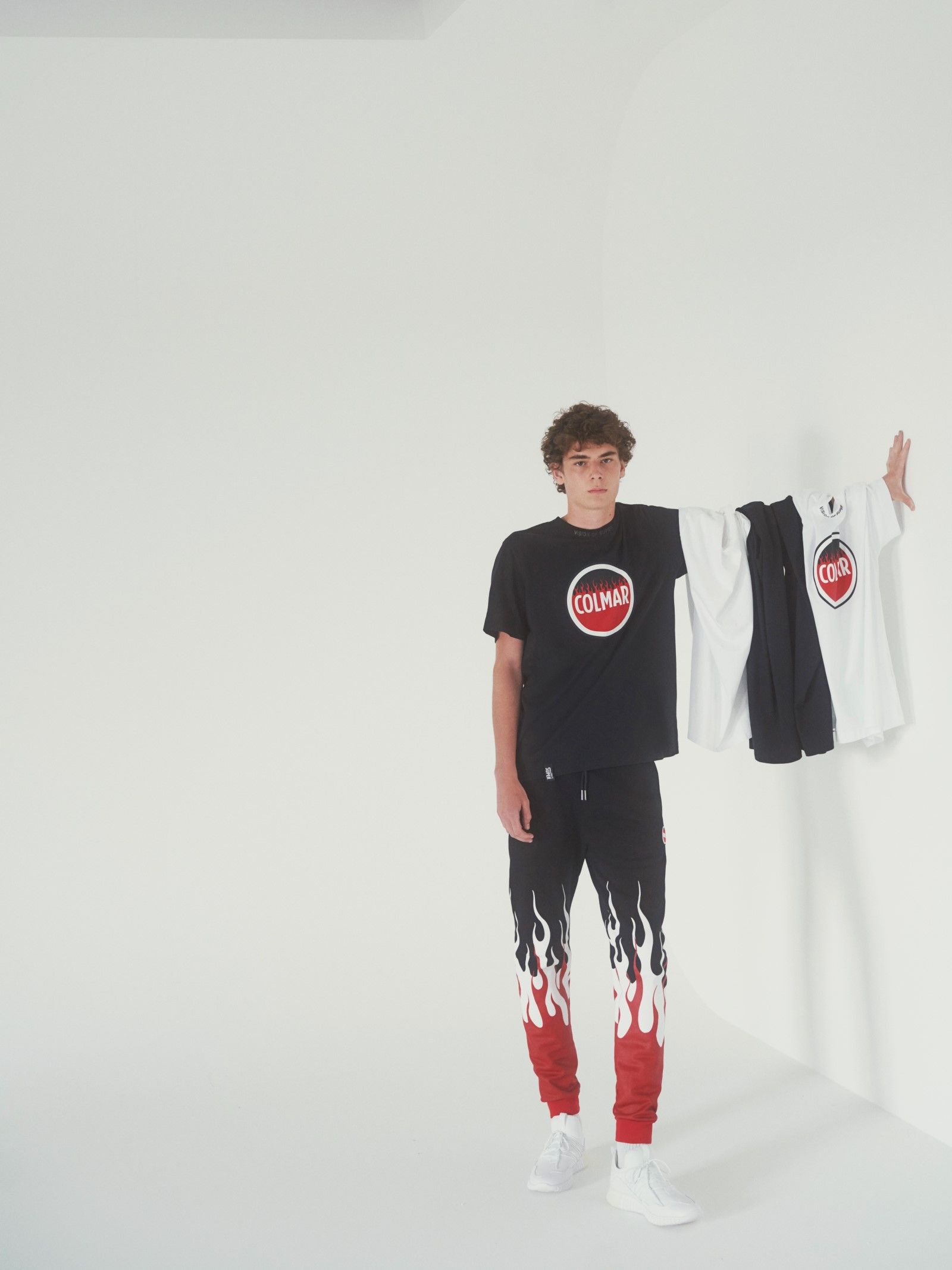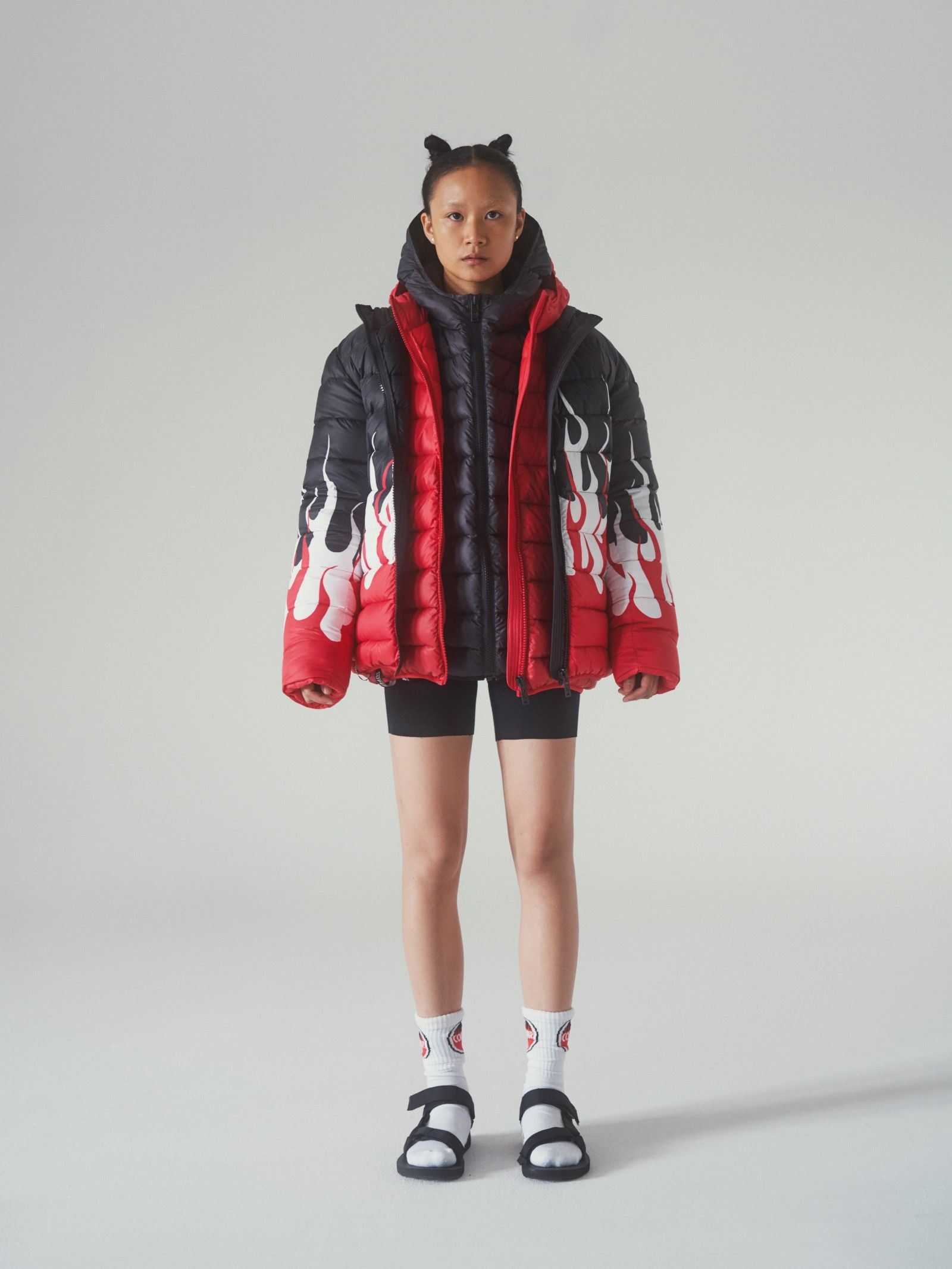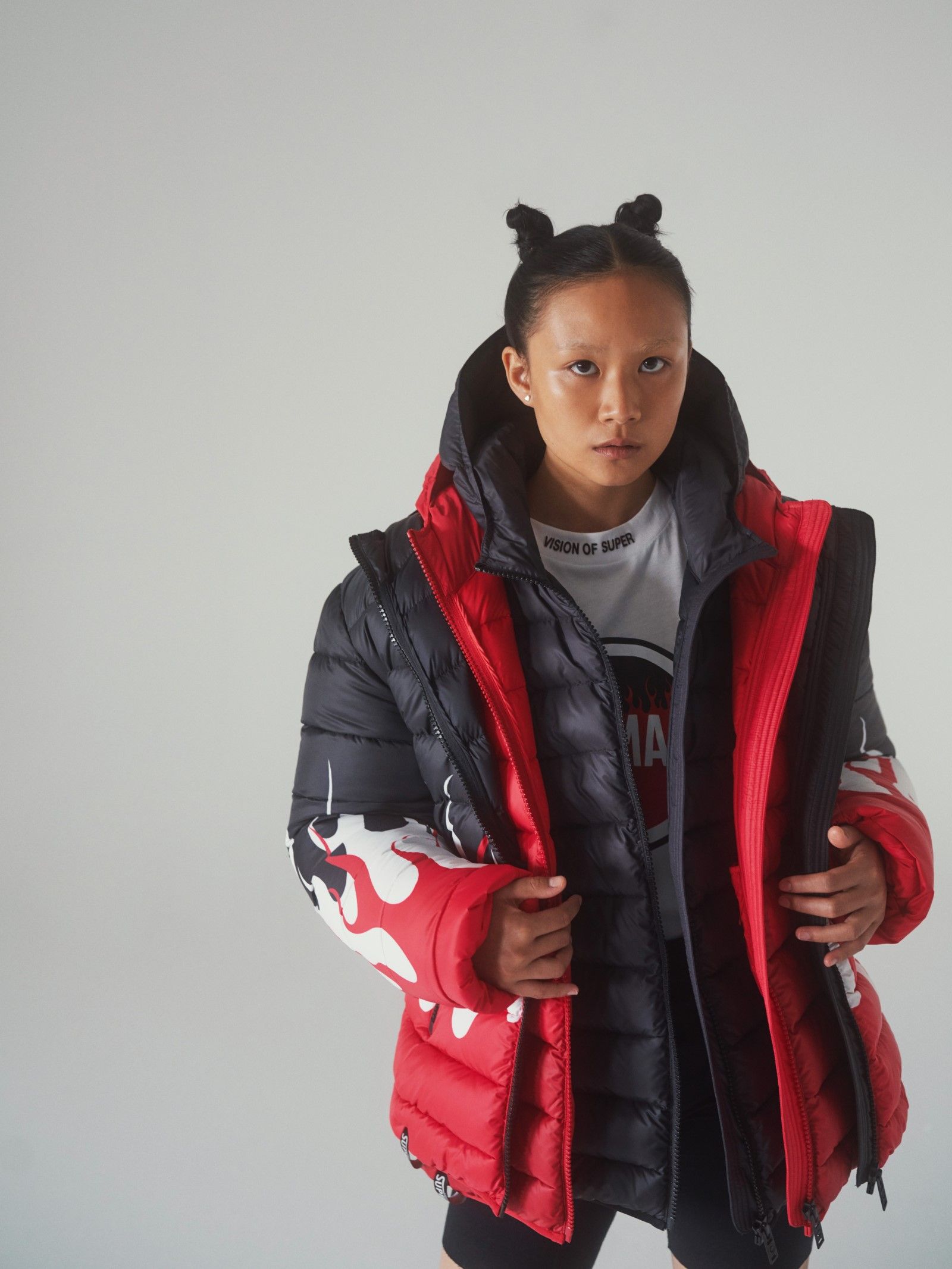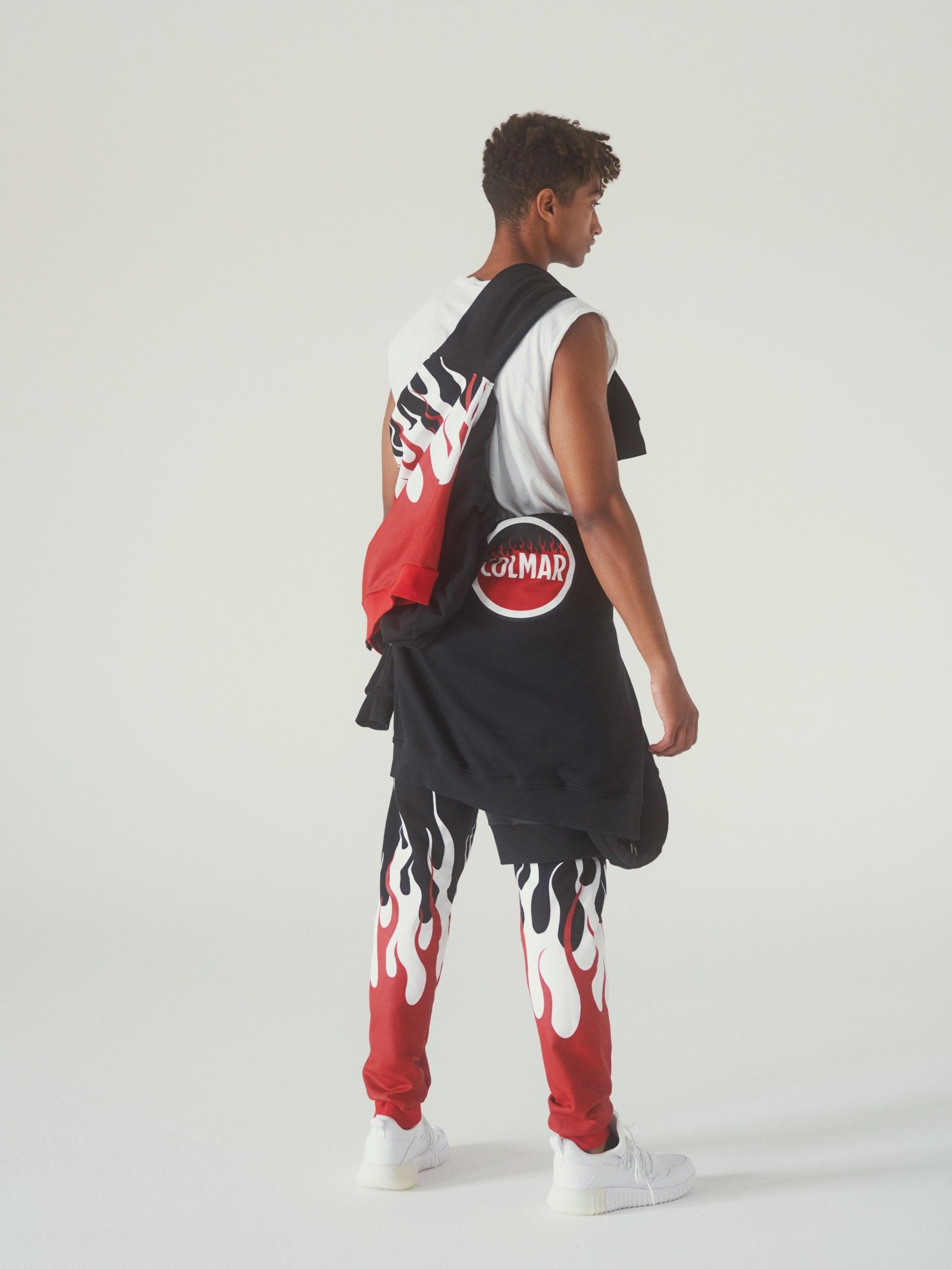 The apparel range, which includes, in addition to the classic puffer jacket, also t-shirts, sweatshirts, pants and accessories, is declined in the colorways of red, black and white. The flames made in glossy and opaque prints are the hallmark of Vision Of Super, and represent the visual letimotiv of the collection, also decorating the Colmar logo.
