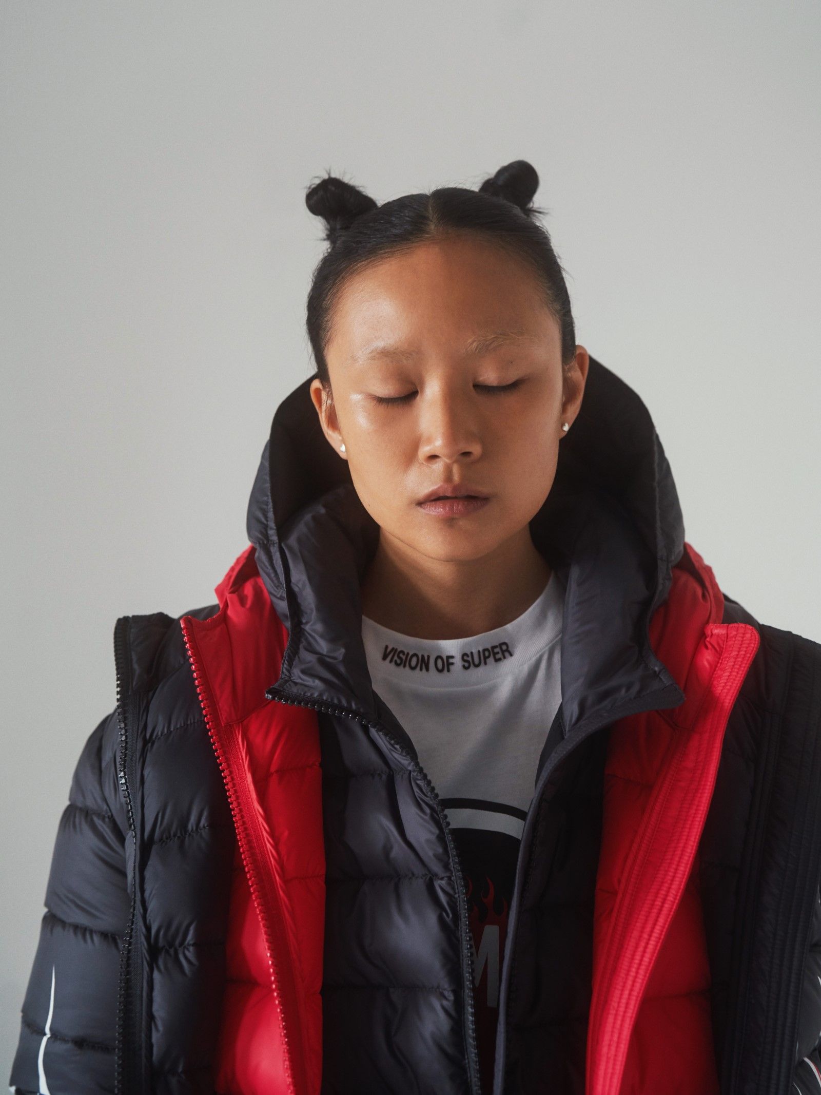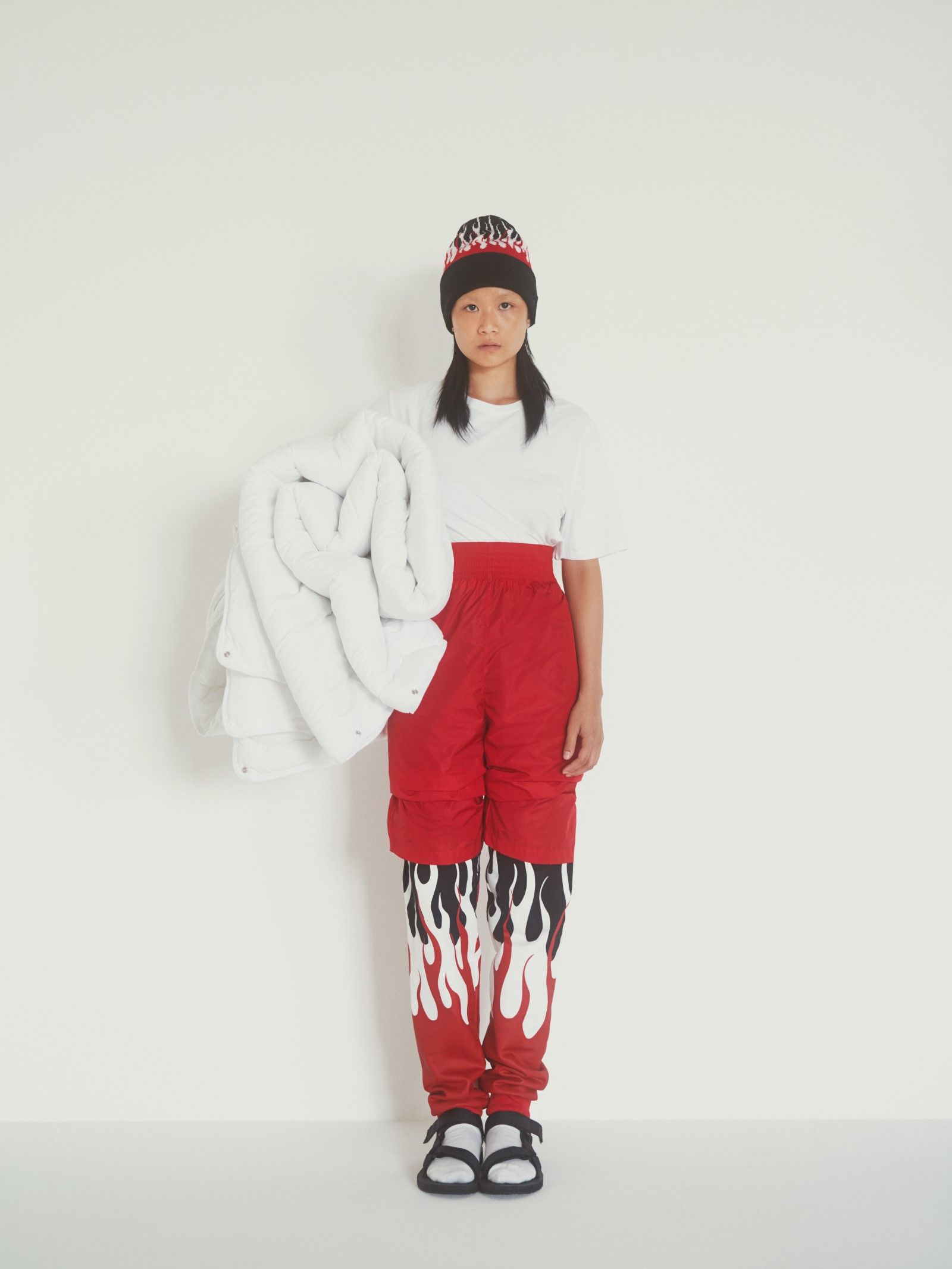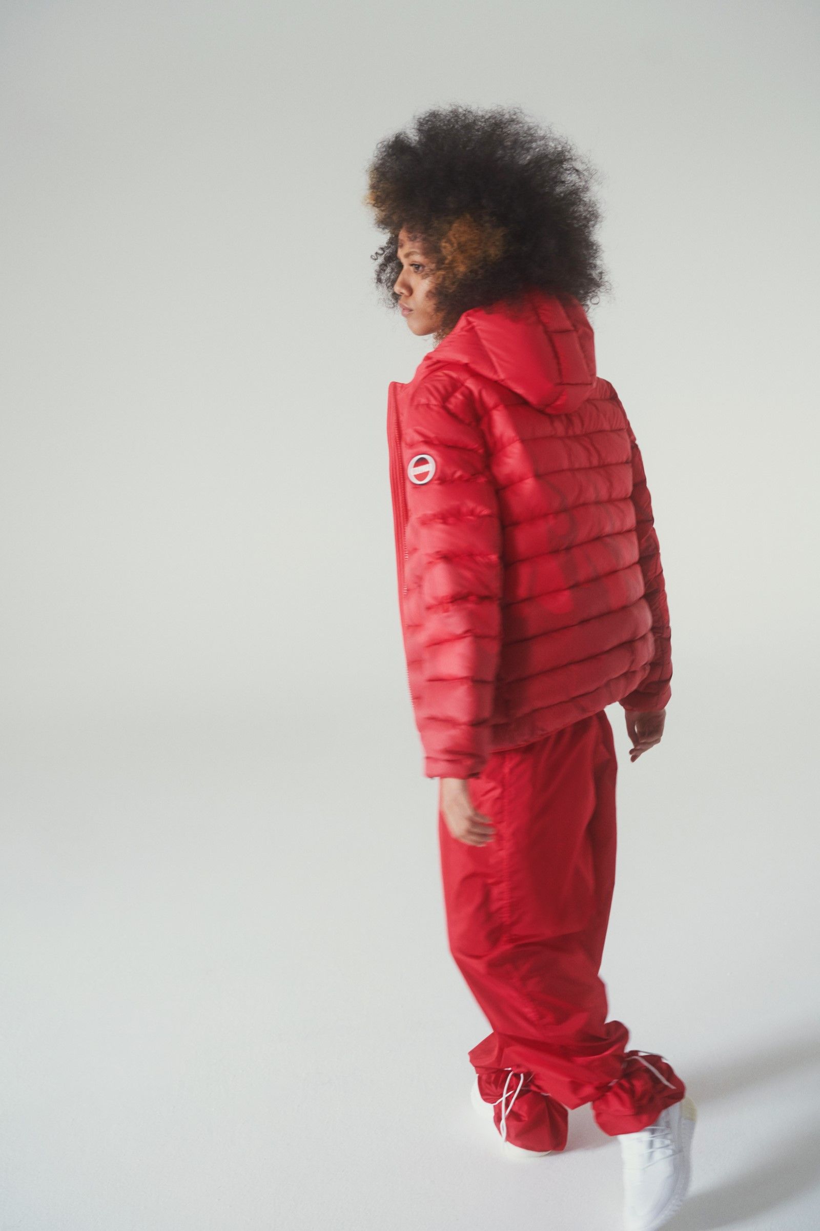 The apparel range, which includes, in addition to the classic puffer jacket, also t-shirts, sweatshirts, pants and accessories, is declined in the colorways of red, black and white. The flames made in glossy and opaque prints are the hallmark of Vision Of Super, and represent the visual letimotiv of the collection, also decorating the Colmar logo.