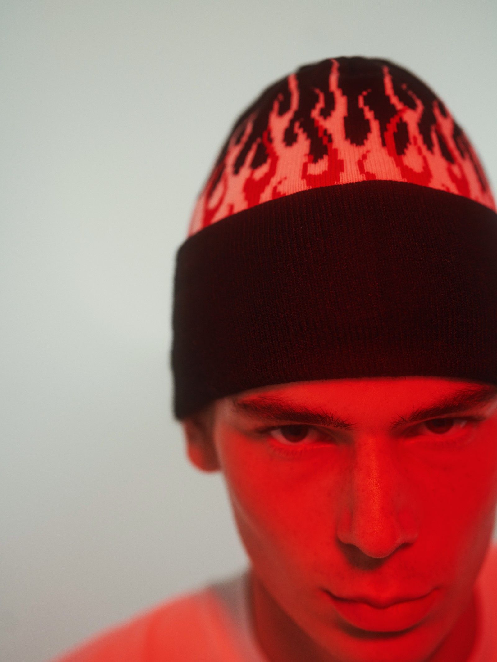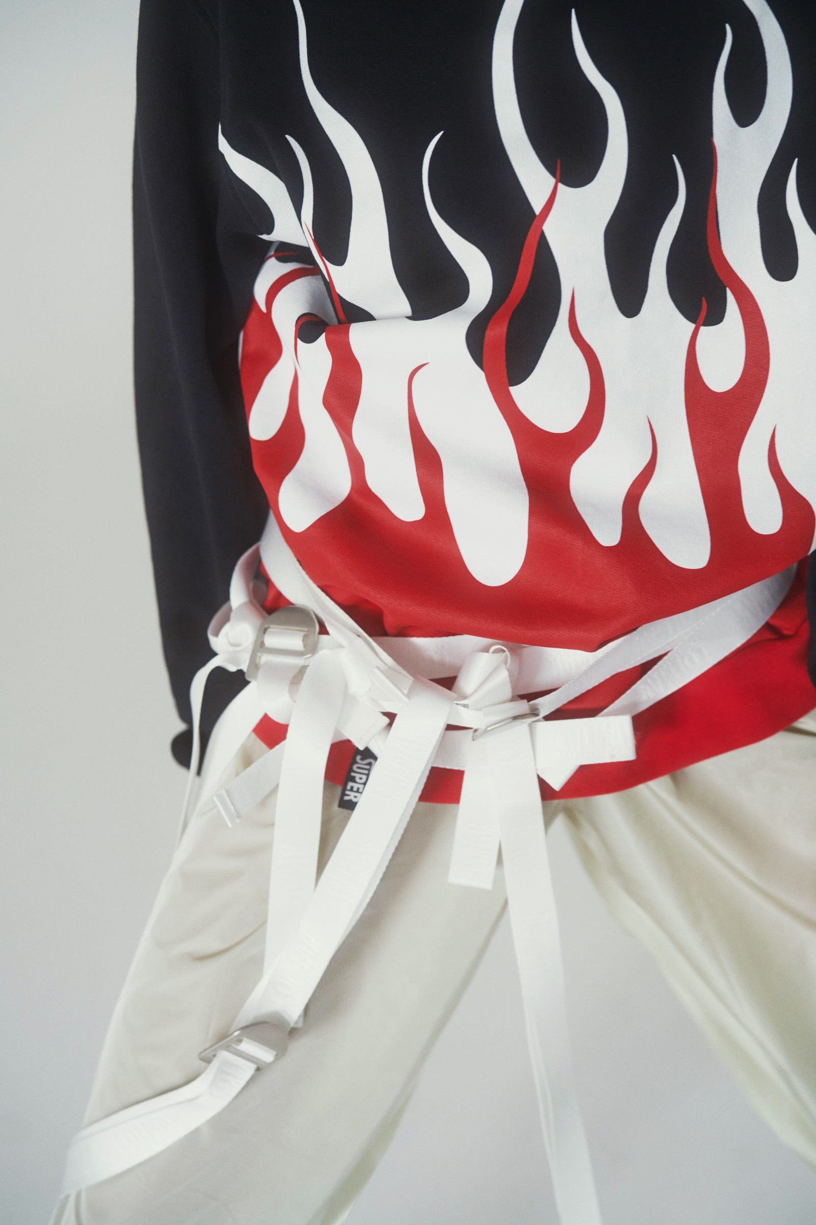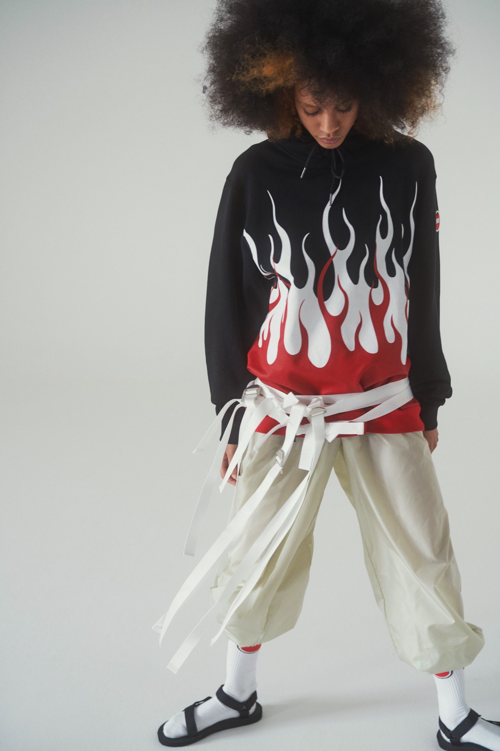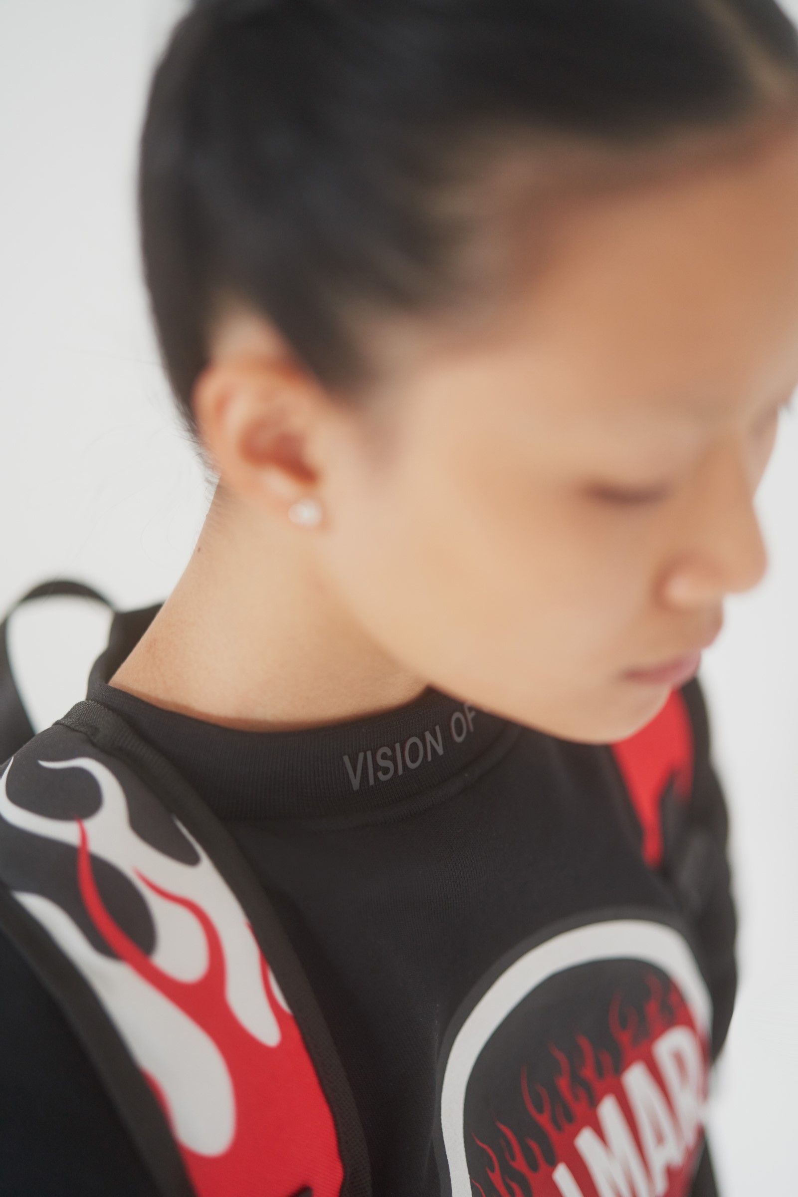 The apparel range, which includes, in addition to the classic puffer jacket, also t-shirts, sweatshirts, pants and accessories, is declined in the colorways of red, black and white. The flames made in glossy and opaque prints are the hallmark of Vision Of Super, and represent the visual letimotiv of the collection, also decorating the Colmar logo.