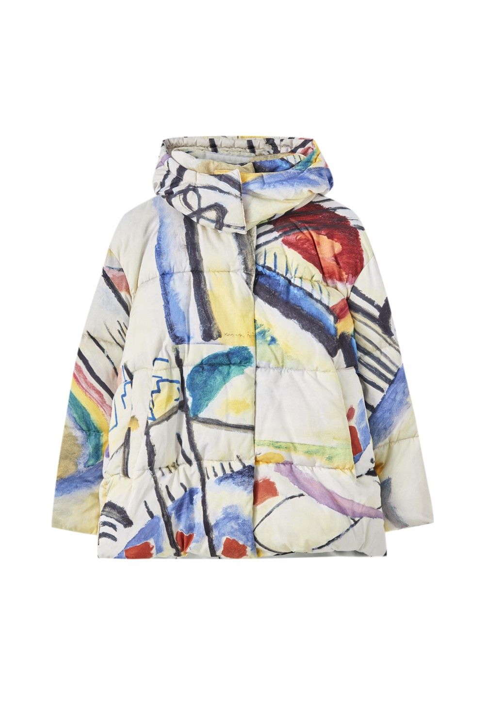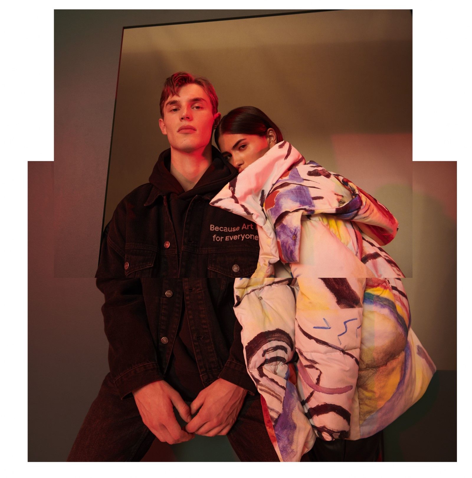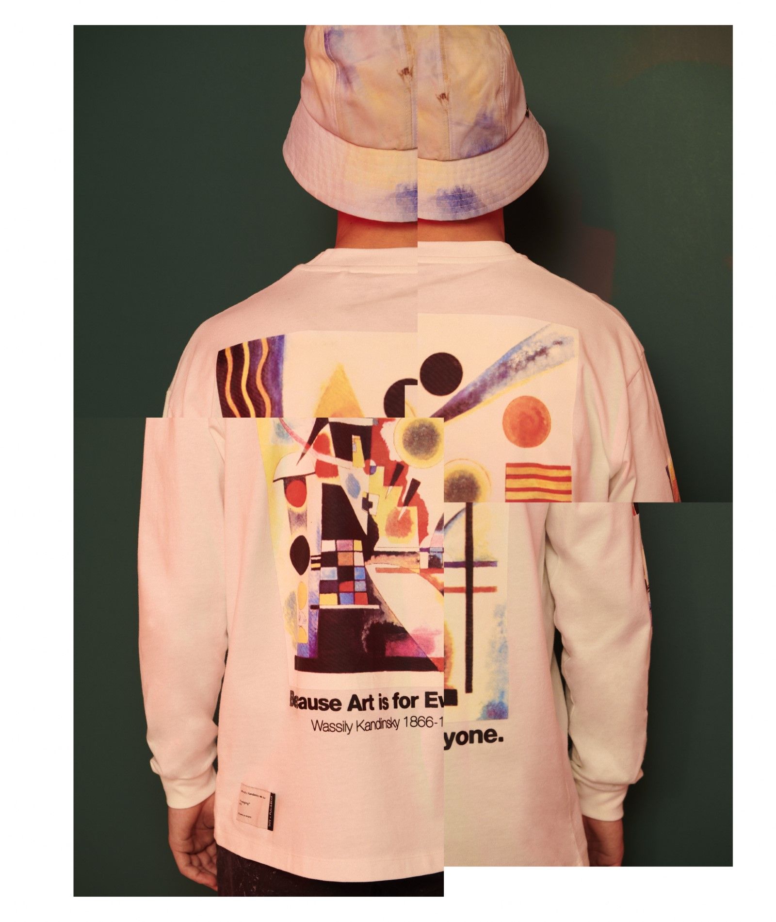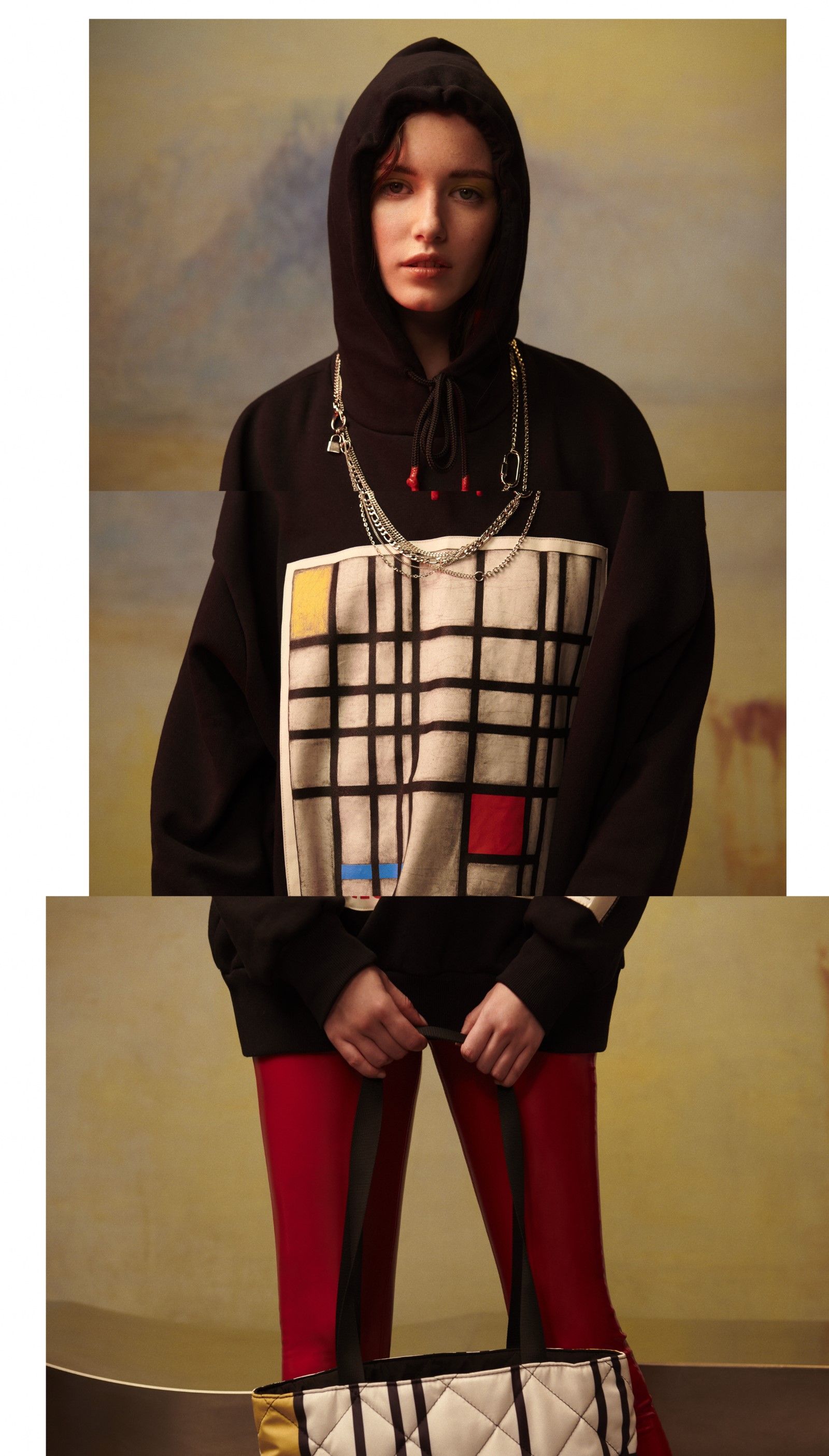 A series of colorful prints reinterpreting the works of Kandinsky and Turner cover the puffer jackets, T-shirts and accessories of the womanswear collection. The works of Mondrian and Malevich, on the other hand, inspire the graphics of t-shirts, hoodies and trousers. In the menswear collection, hoodies and trousers are covered with the works of J. M. W. Turner, while a series of denim jackets is decorated with drawings and watercolors by the poet-painter William Blake. To this is added a wide selection of accessories with tote bags inspired by the emblematic painting Kossacks by Kandinsky, crossbody bags with the works of Sir John Everett Millais and hats that reinterpret one of George Stubbs' most representative horse paintings.