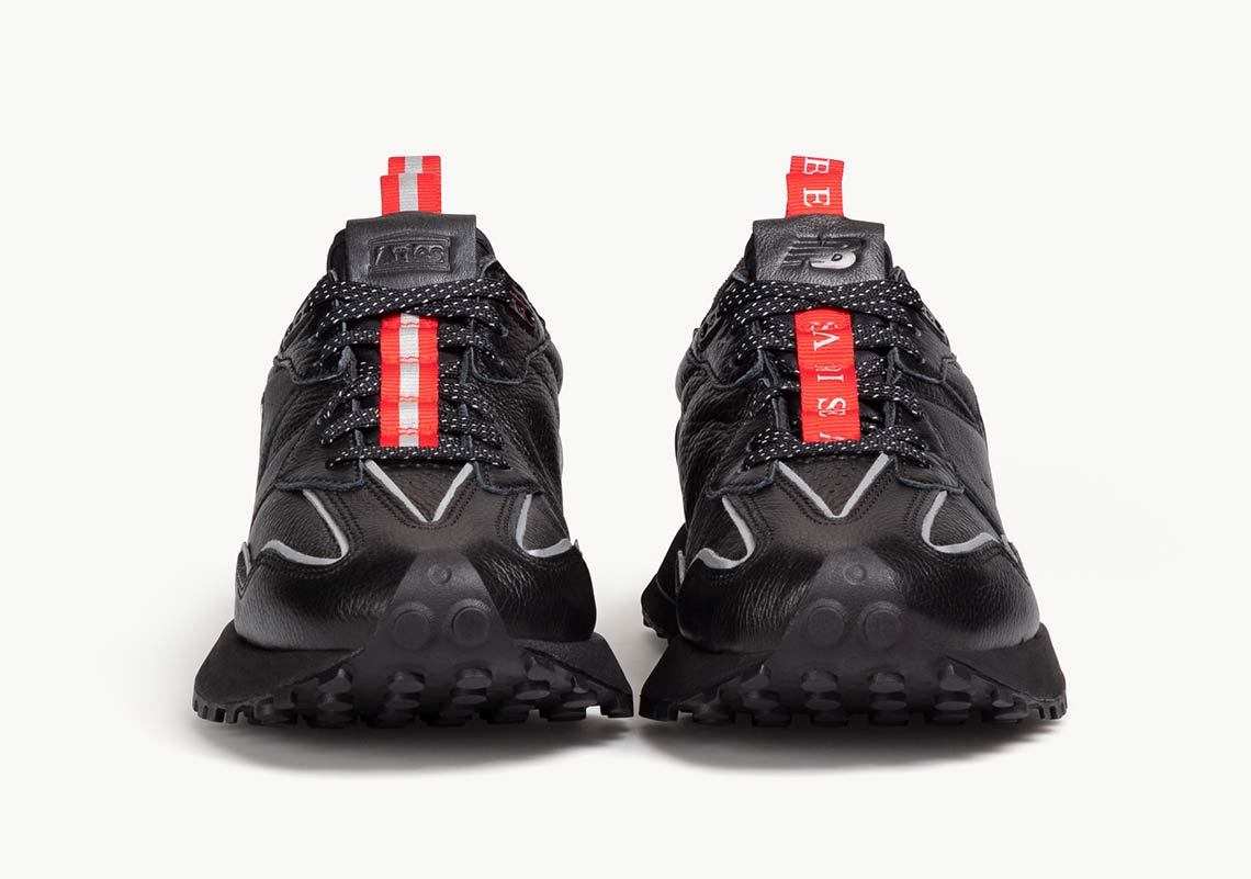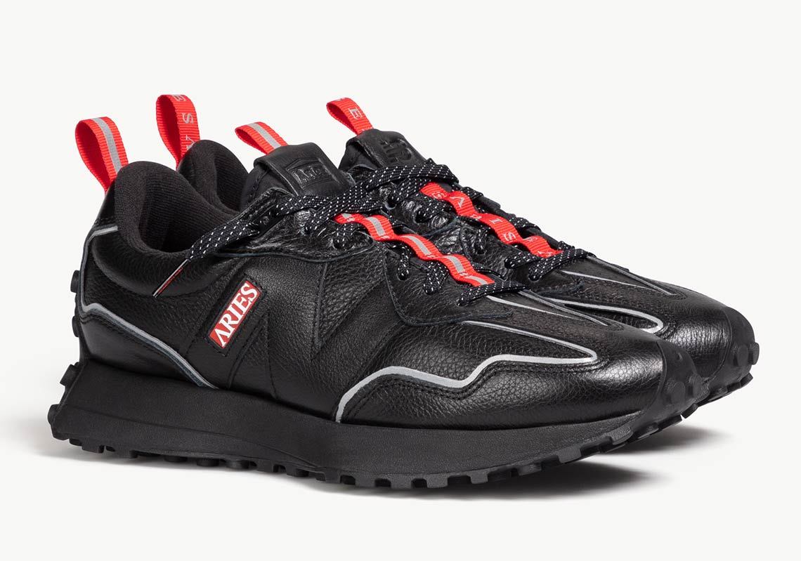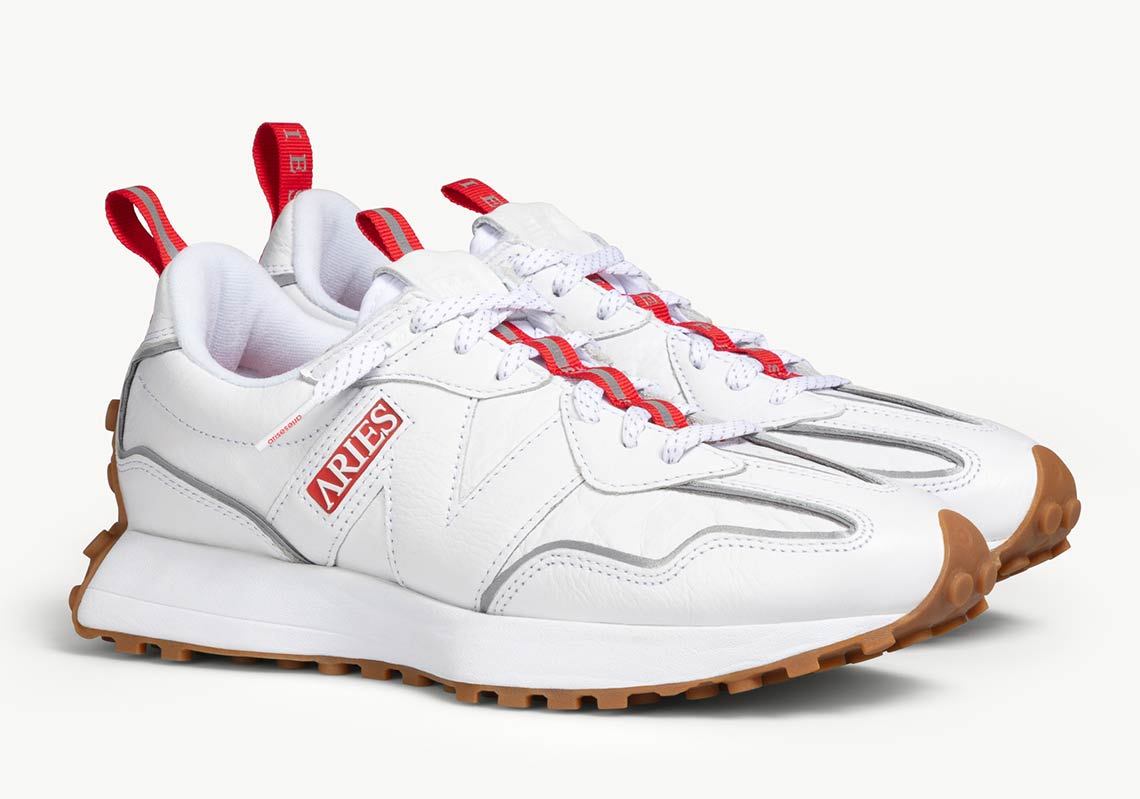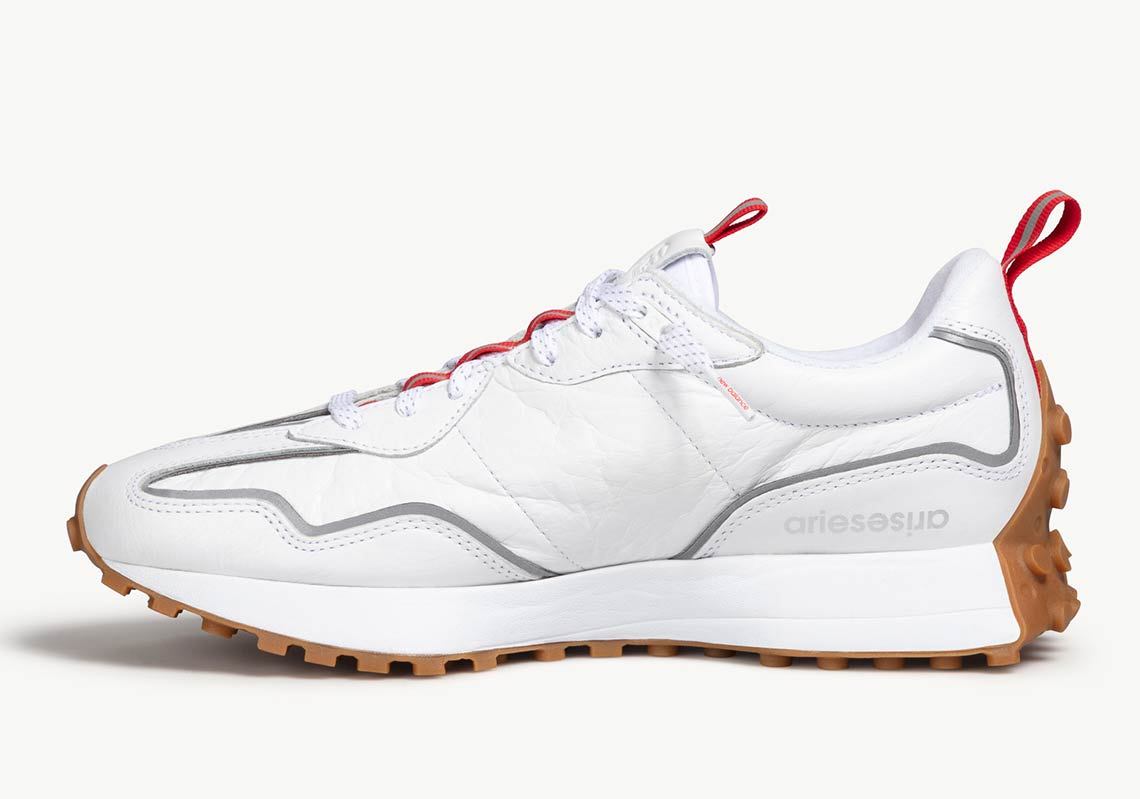 Aries now signs the new iteration of the New Balance NB 327, enriching the original vintage running look of the shoe from the early nineties with its own touch. Made with a leather upper and characterized by reflective profiles and graphics, the shoe is available in two different colours, total white and total black, both enriched by red details and writings.
