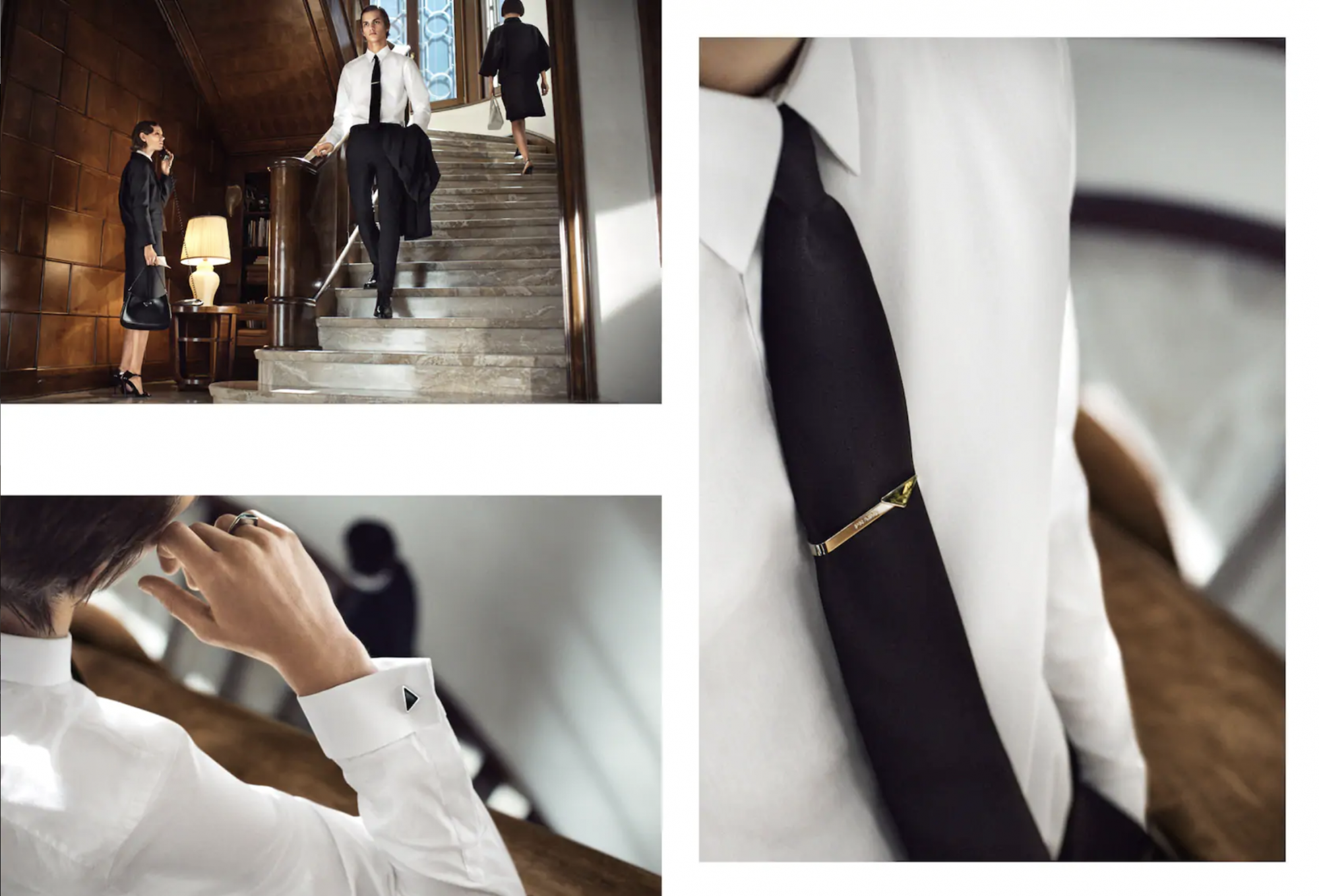 The perfect synthesis between classicism and futurism, the new Prada Cleo bag after its debut during the Prada Multiple Views SS21 fashion show now becomes the focal point of the campaign. The Prada triangle, emblem of the brand, serves instead as a source of inspiration for the creation of women's jewels in gold and tourmaline or silver, like facets of an abstract gem.