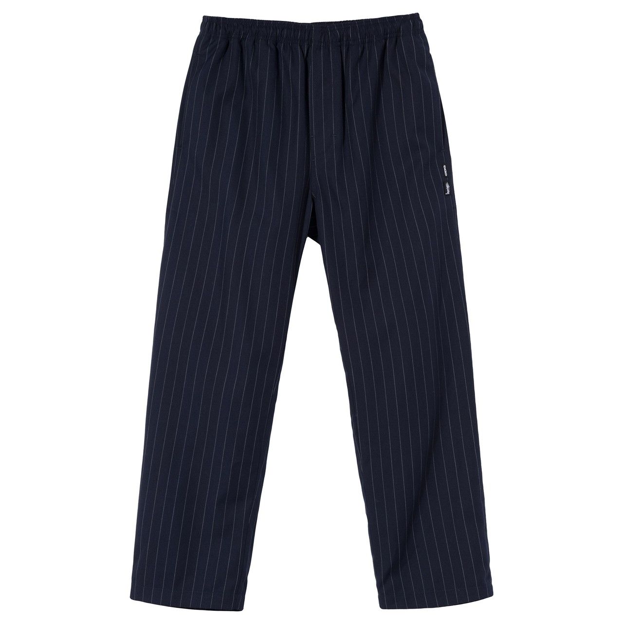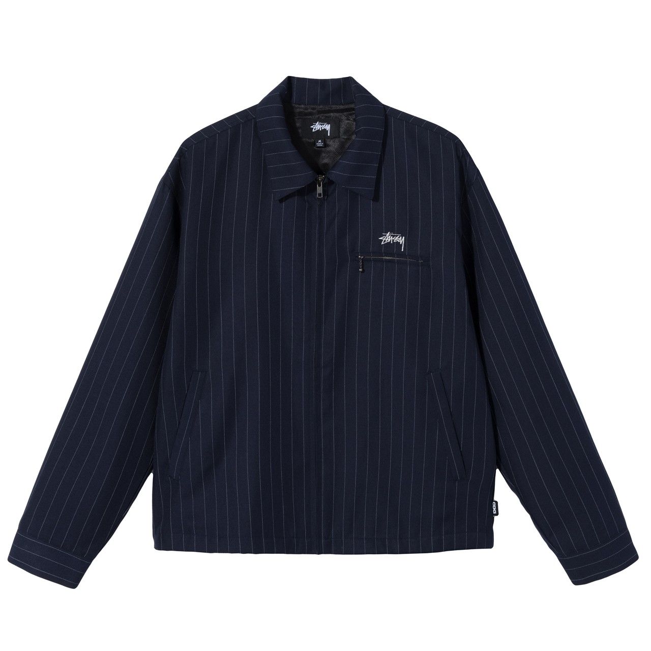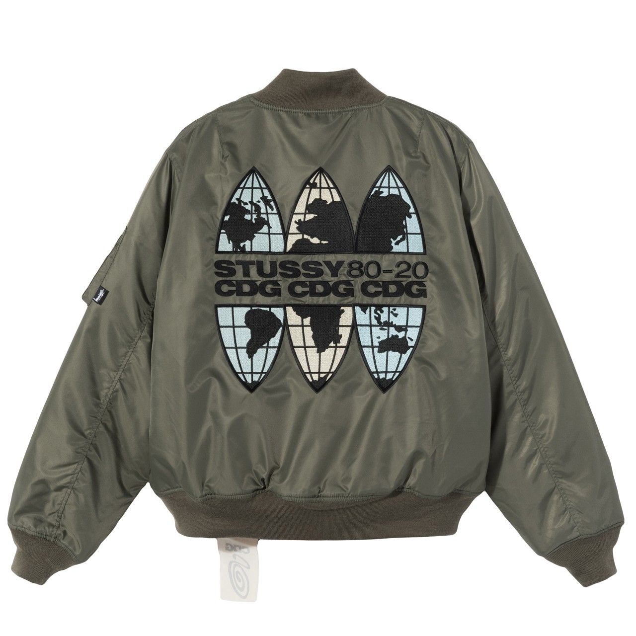 A capsule that does not boil down to only graphic items and that includes a set of pinstripe jacket and sports pants and also an olive green bomber jacket with embroidery on the back. T-shirts, long sleeves and accessories decorated with other classic Stussy logos complete the capsule with a new graphic depicting four stylized surfers.