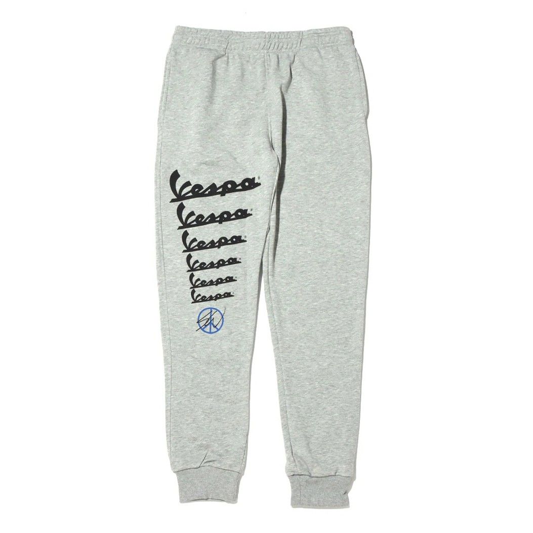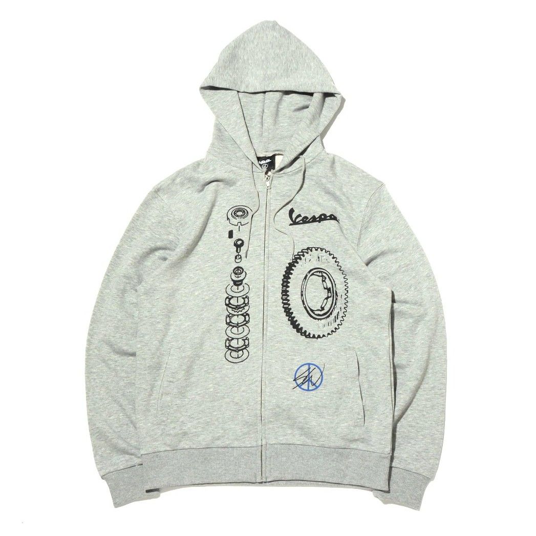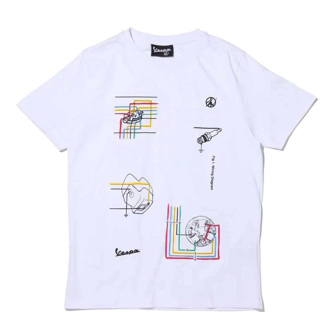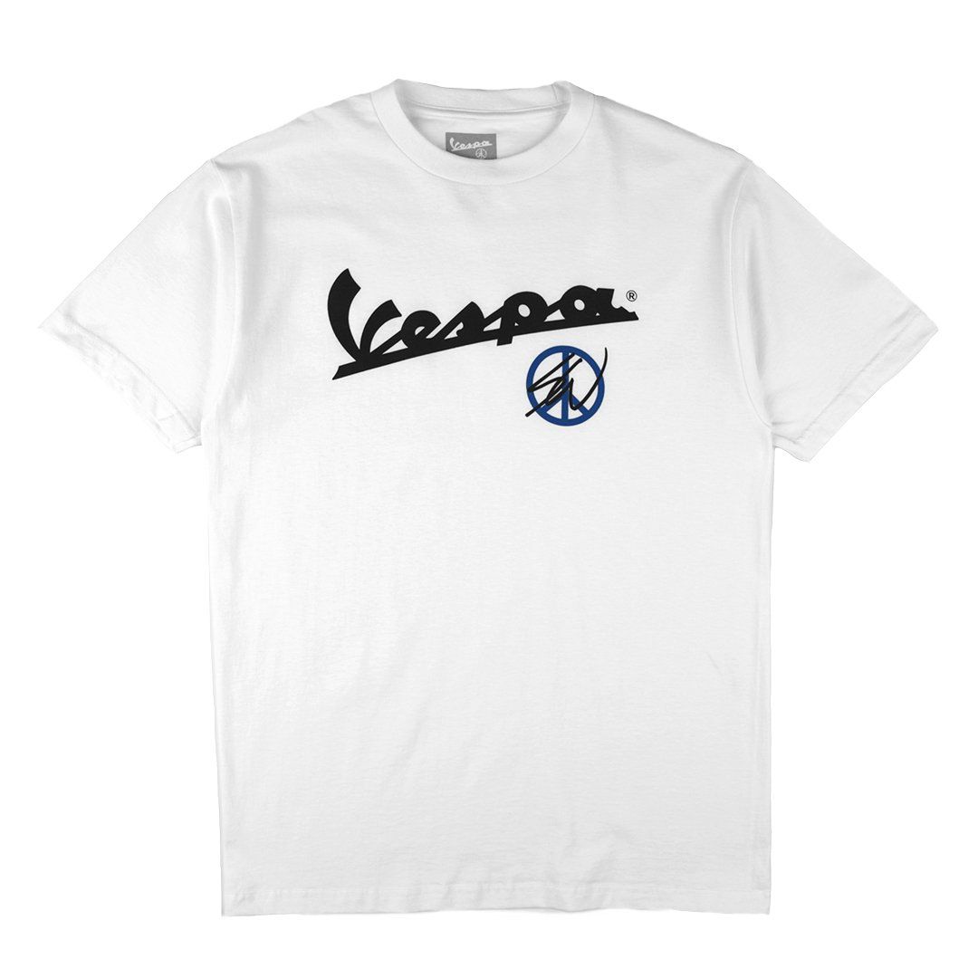 The collection includes a sweatsuit consisting of grey sweatshirt and tracksuit pants decorated with the renderings of mechanical parts of the scooter and the name of stylized Vespa reproduced on the back. Wotherspoon's signature appears to be printed on a symbol of peace. More colourful appear the graphics of the various t-shirts, also of retro taste.