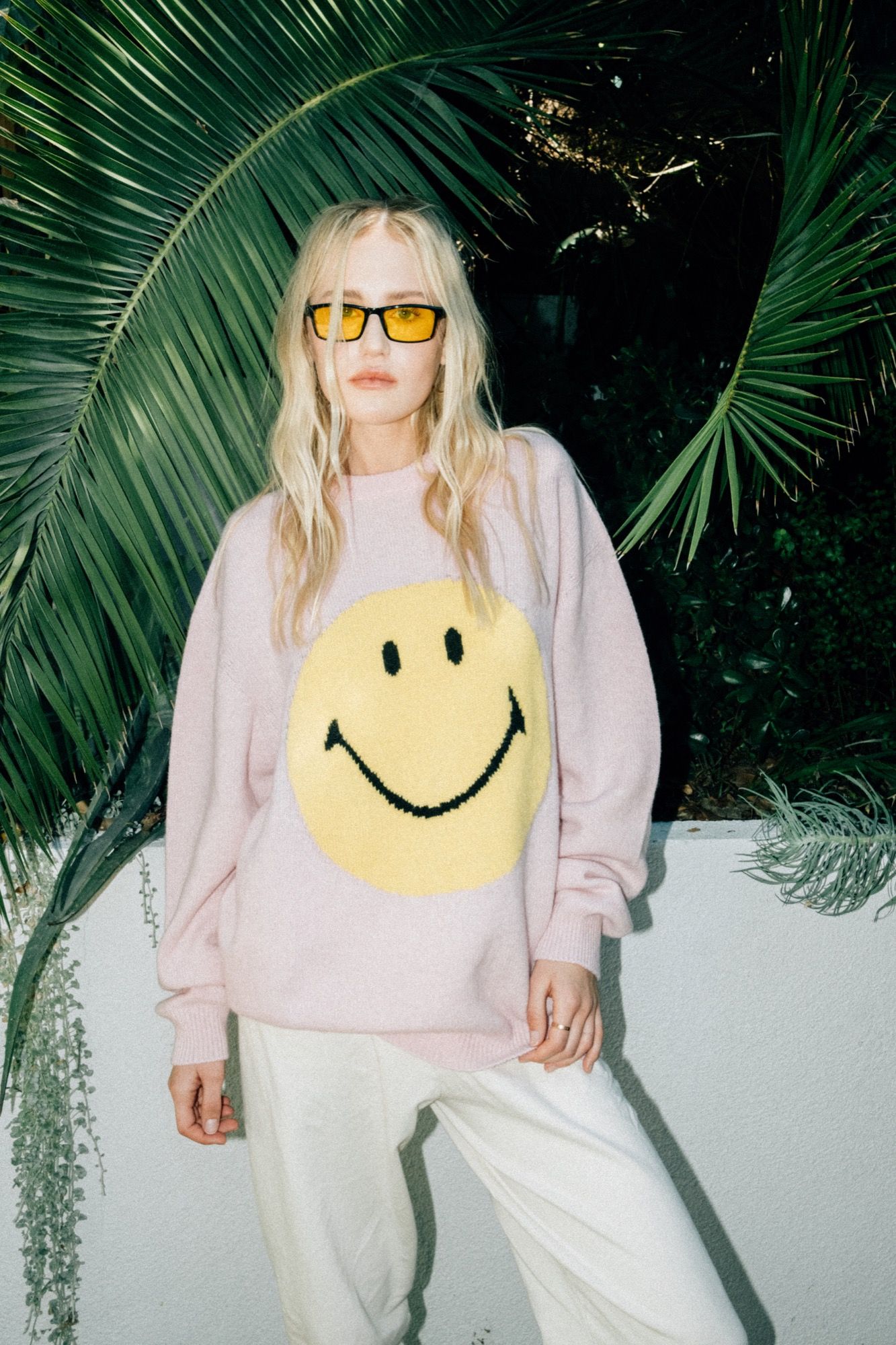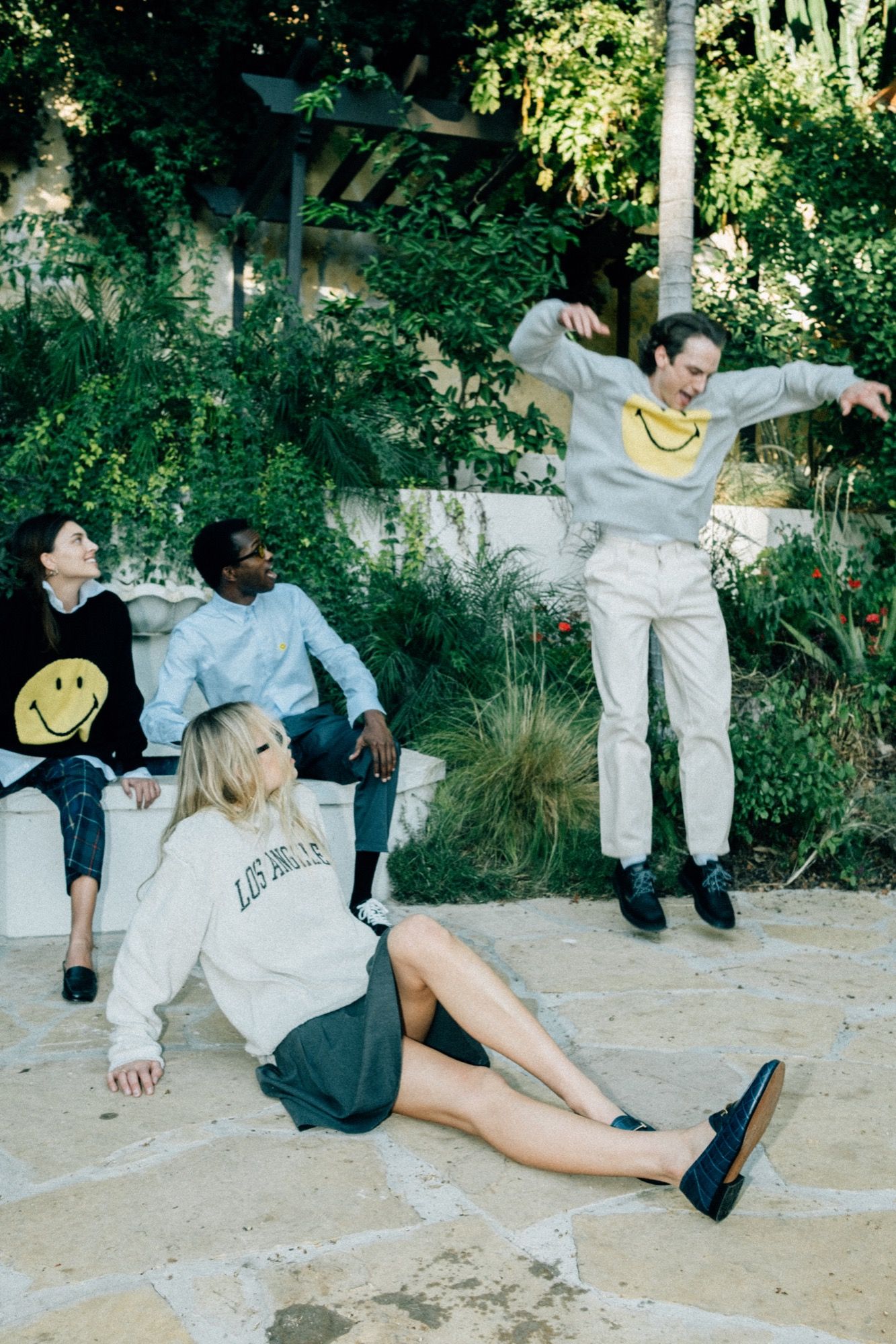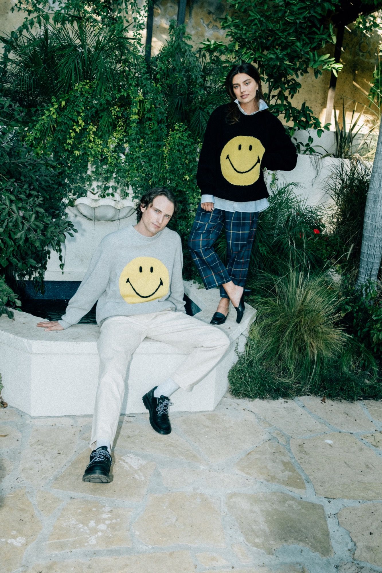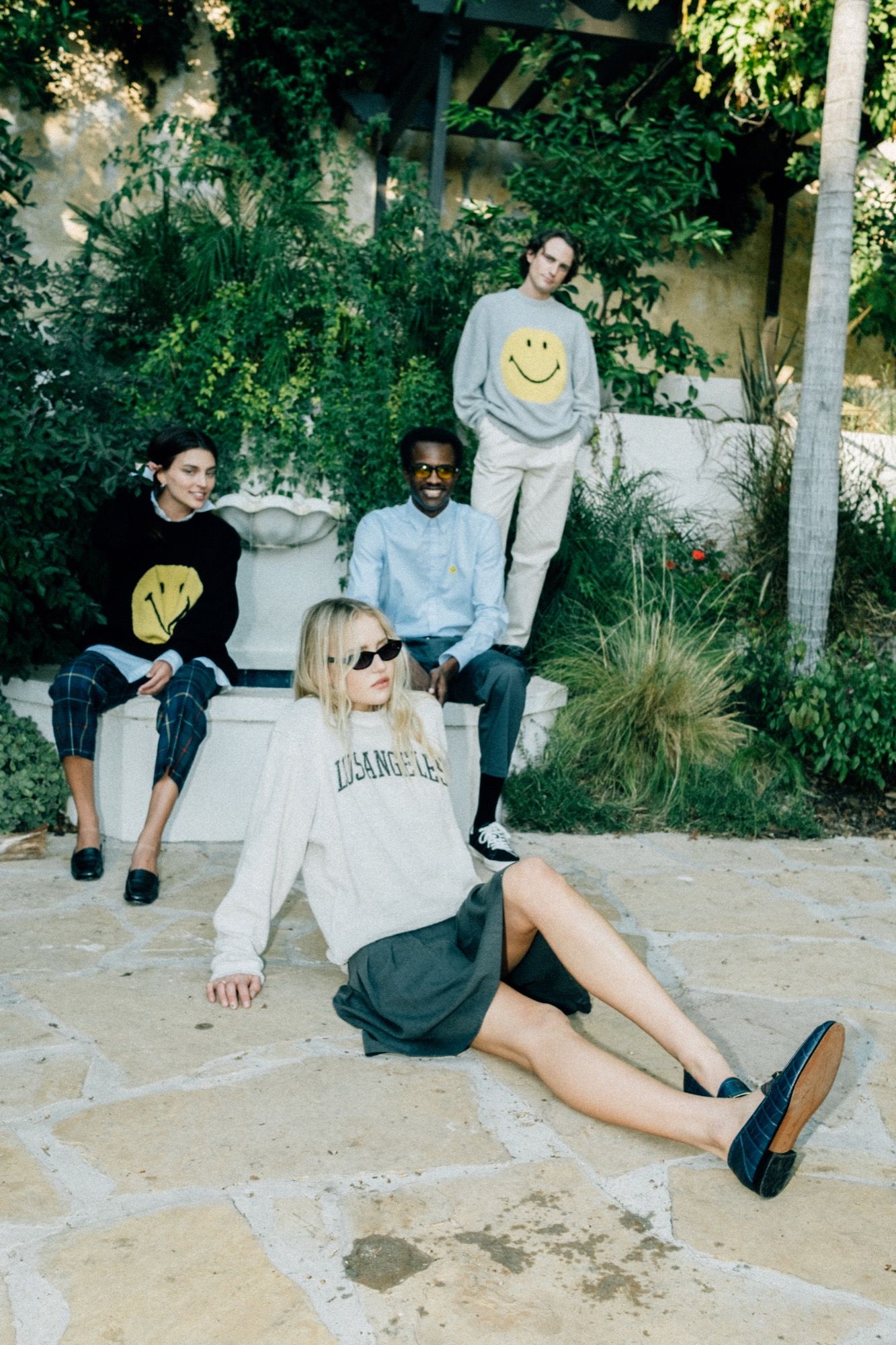 This first capsule collection (the first of a series of collections that will feature the Smiley icon) consists of ten items and includes shirts, cashmere mixed sweaters decorated with large smiley and embroidered sweatshirts that evoke the cities of New York and Los Angeles. Los Angeles is moreover the scenario chosen for the lookbook that evokes the cheerful mood of the collection by imagining a student party in the garden of a Hollywood villa.