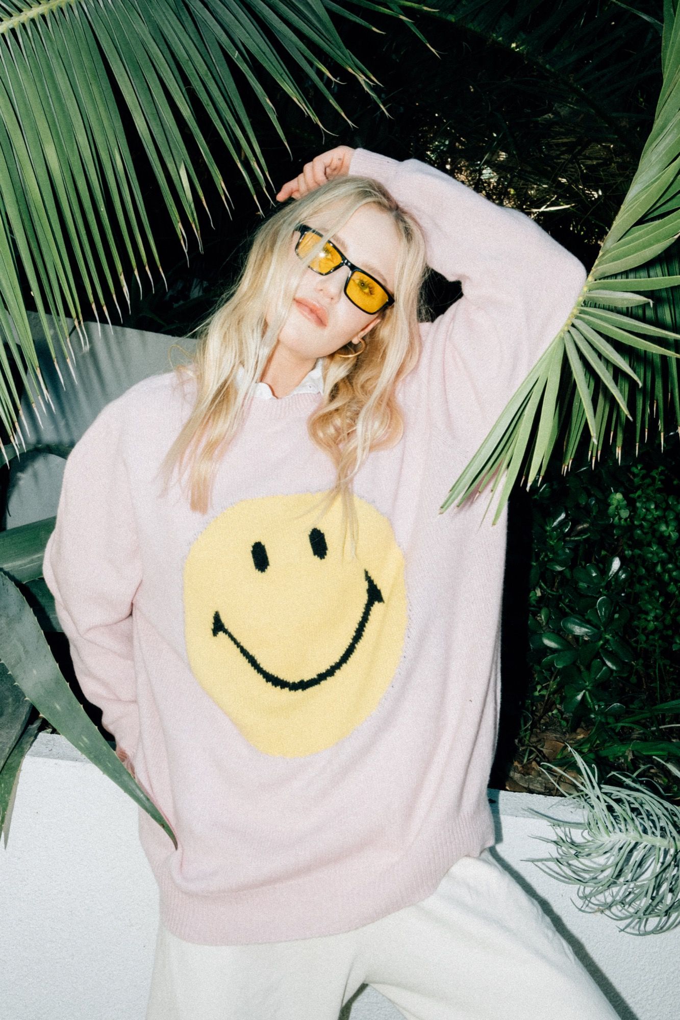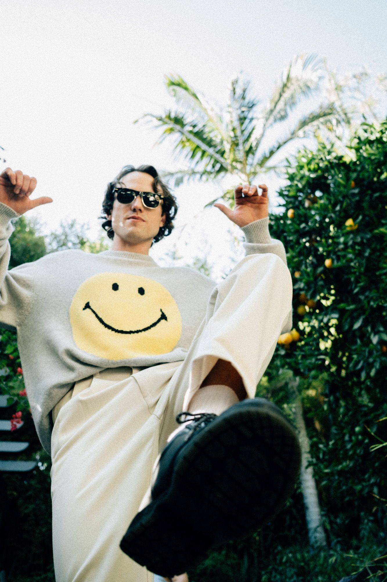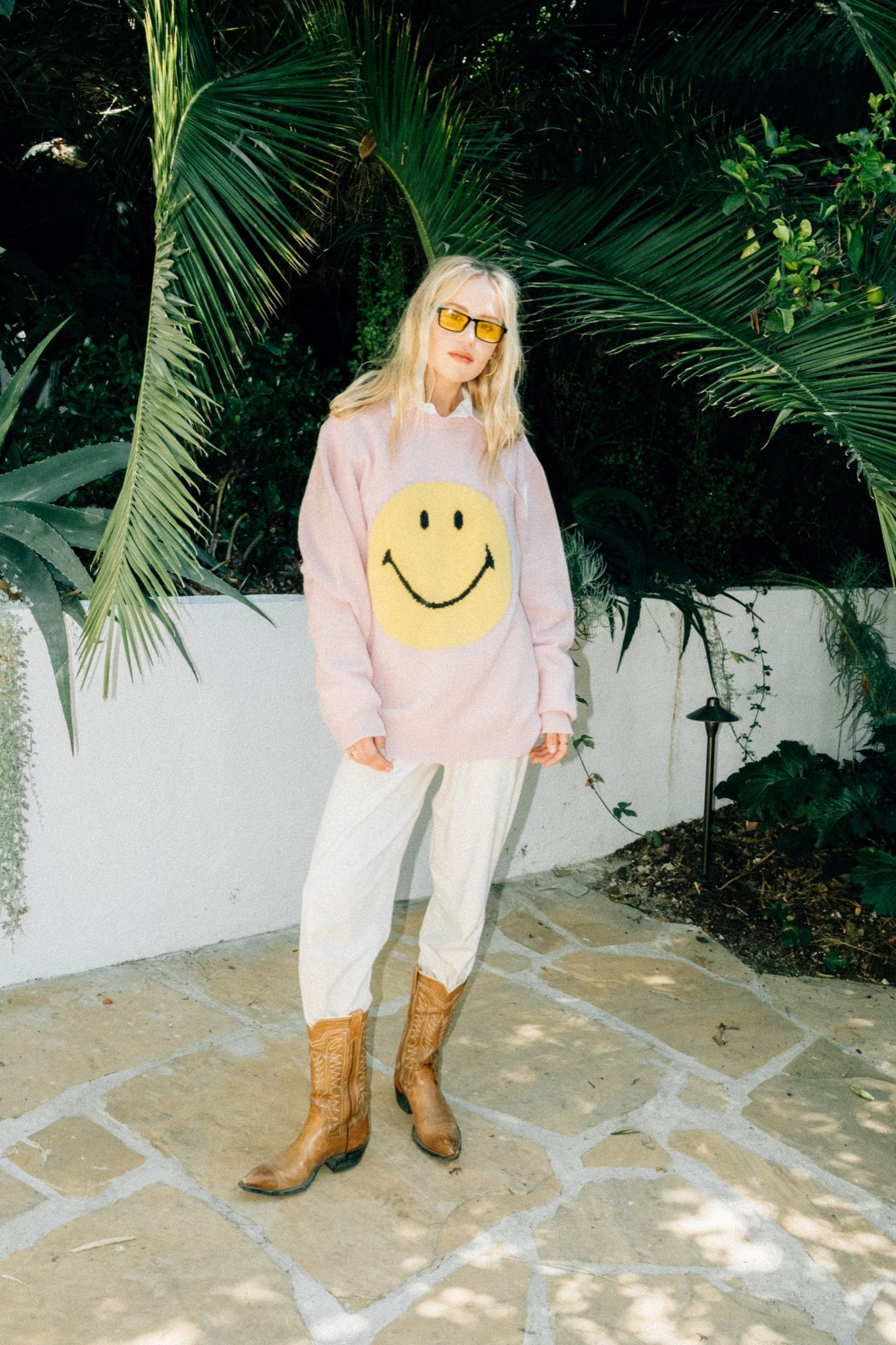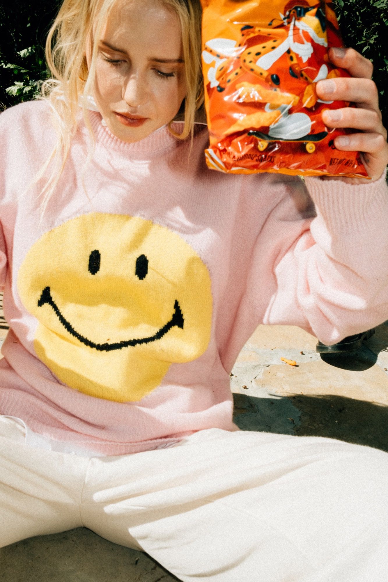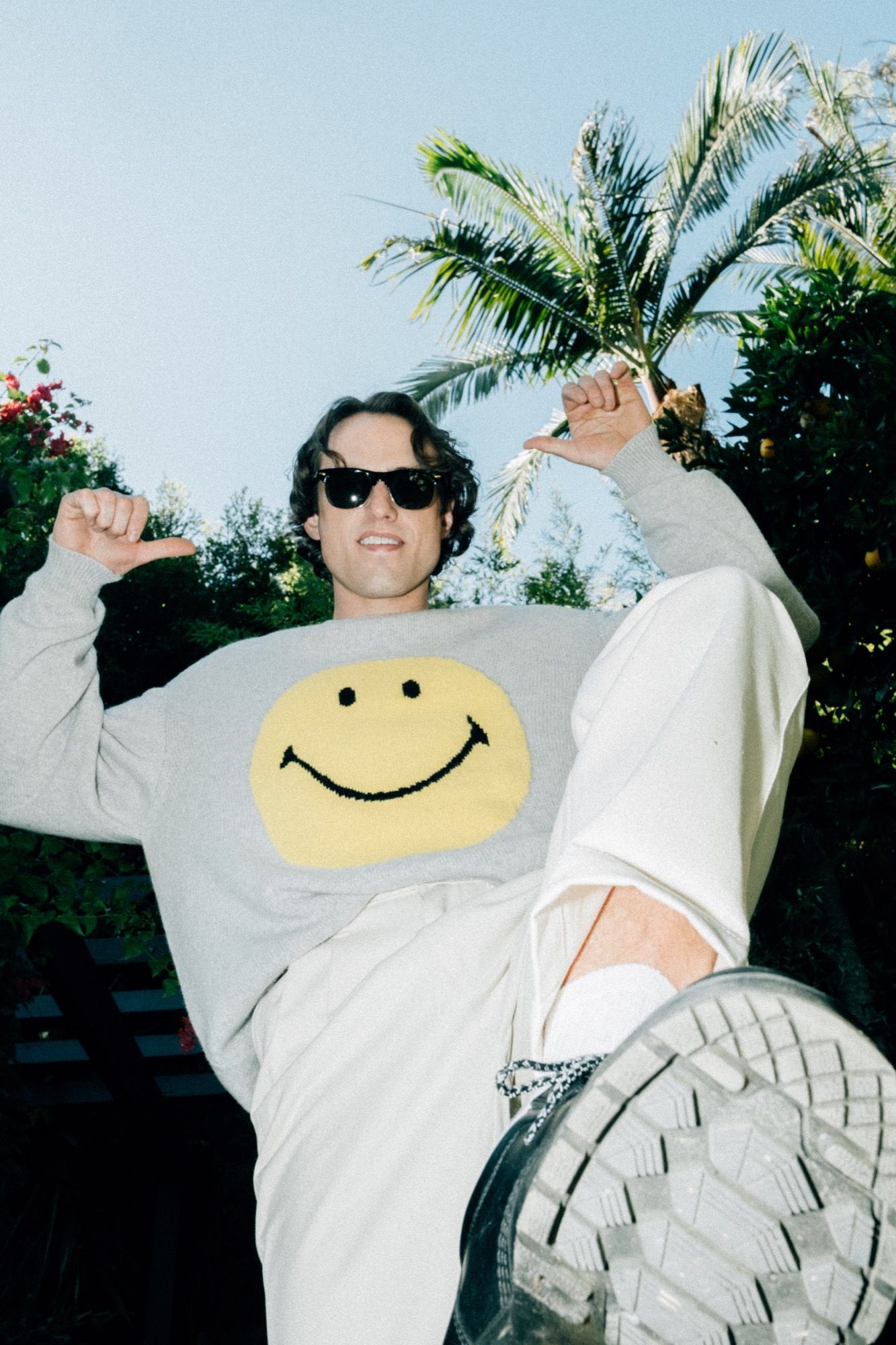 This first capsule collection (the first of a series of collections that will feature the Smiley icon) consists of ten items and includes shirts, cashmere mixed sweaters decorated with large smiley and embroidered sweatshirts that evoke the cities of New York and Los Angeles. Los Angeles is moreover the scenario chosen for the lookbook that evokes the cheerful mood of the collection by imagining a student party in the garden of a Hollywood villa.