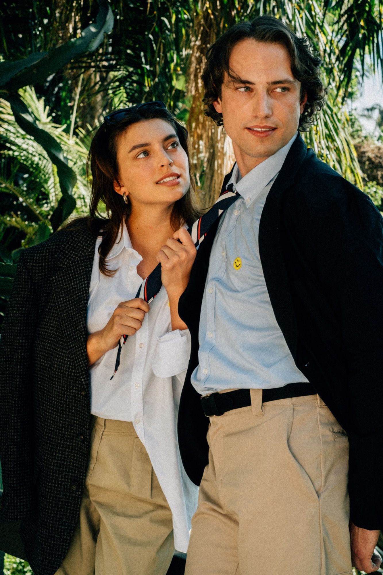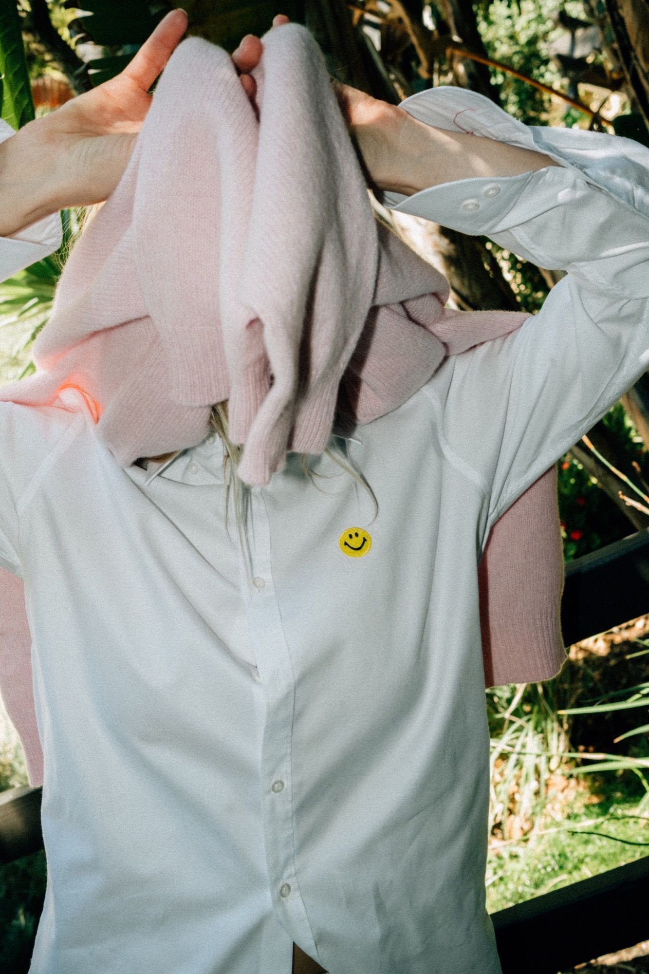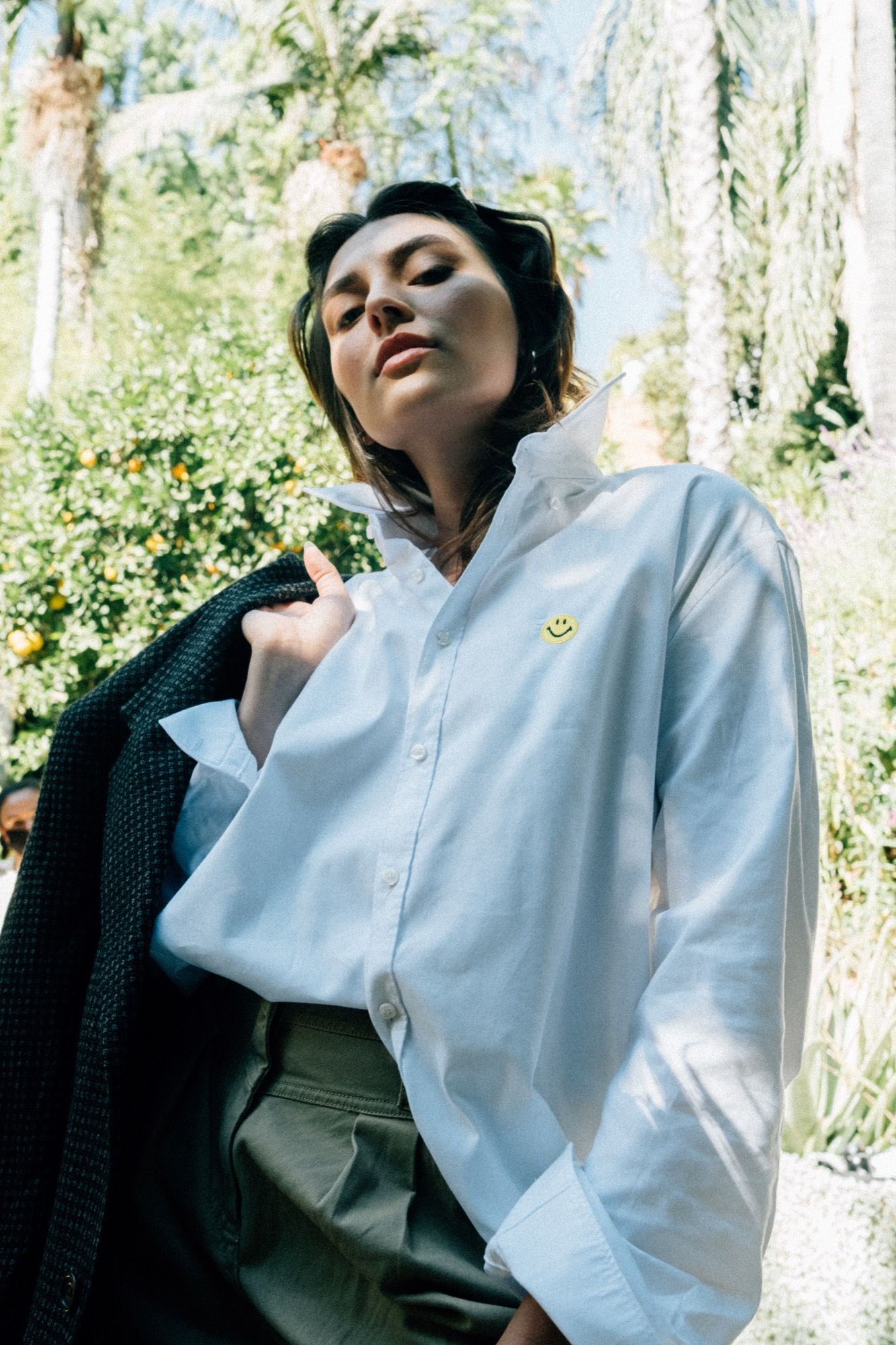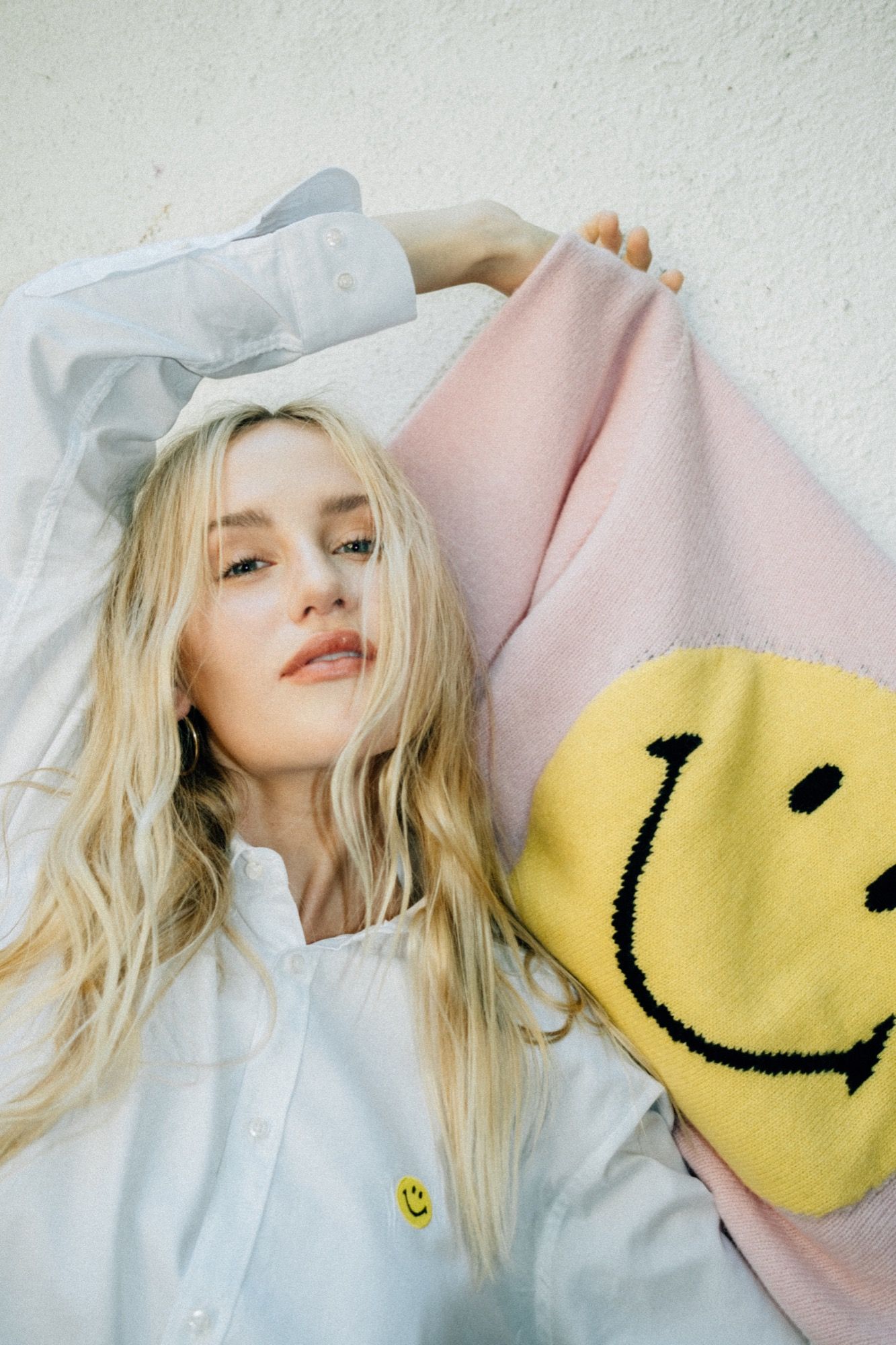 This first capsule collection (the first of a series of collections that will feature the Smiley icon) consists of ten items and includes shirts, cashmere mixed sweaters decorated with large smiley and embroidered sweatshirts that evoke the cities of New York and Los Angeles. Los Angeles is moreover the scenario chosen for the lookbook that evokes the cheerful mood of the collection by imagining a student party in the garden of a Hollywood villa.