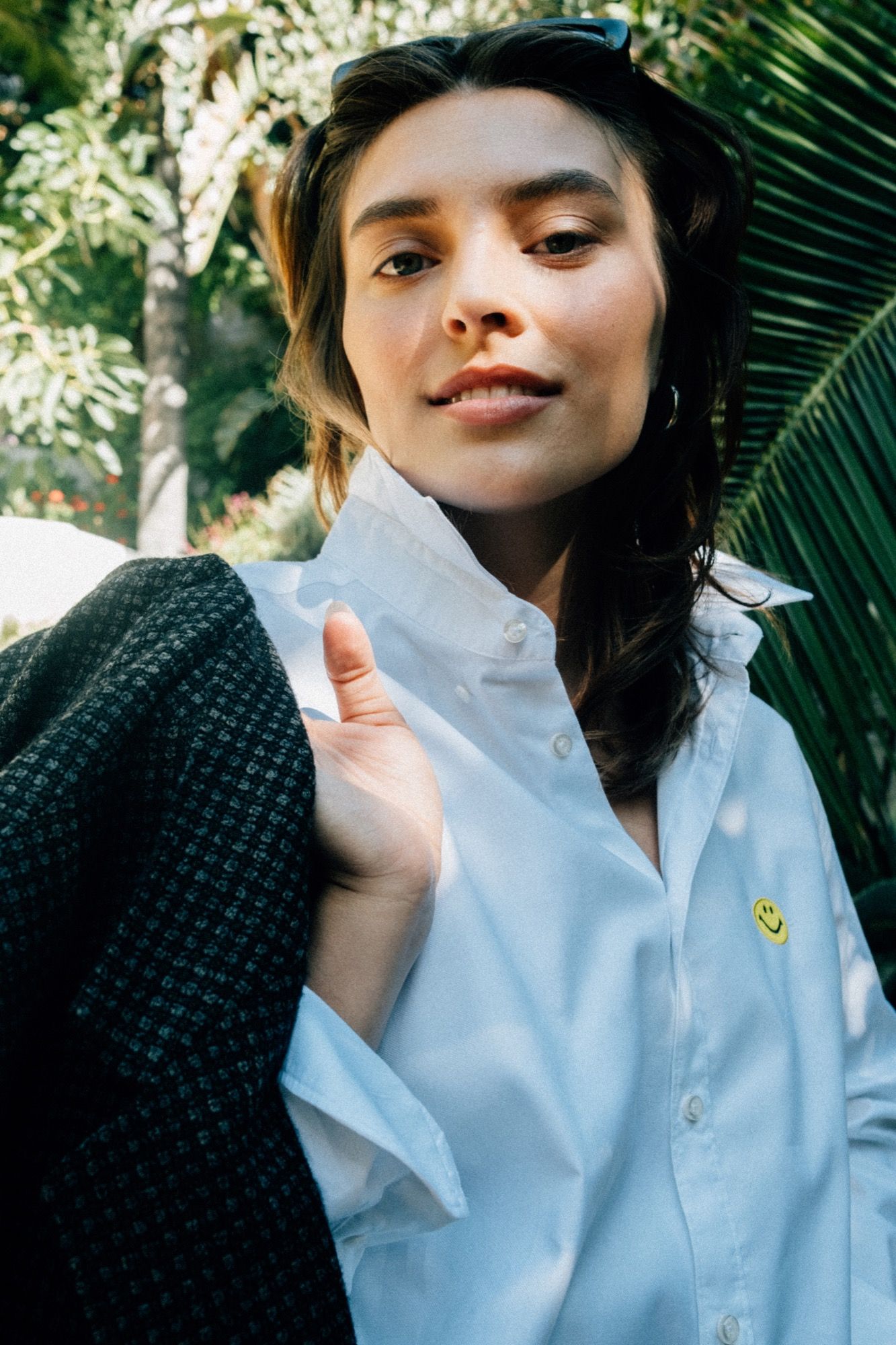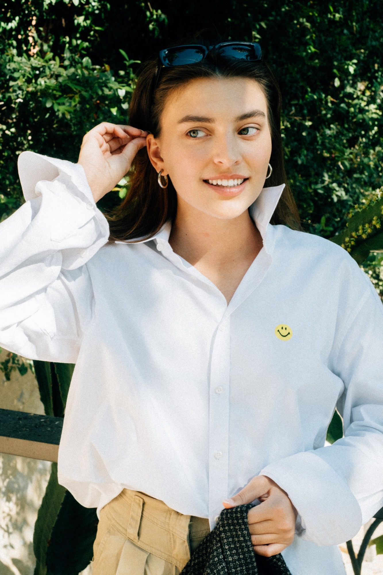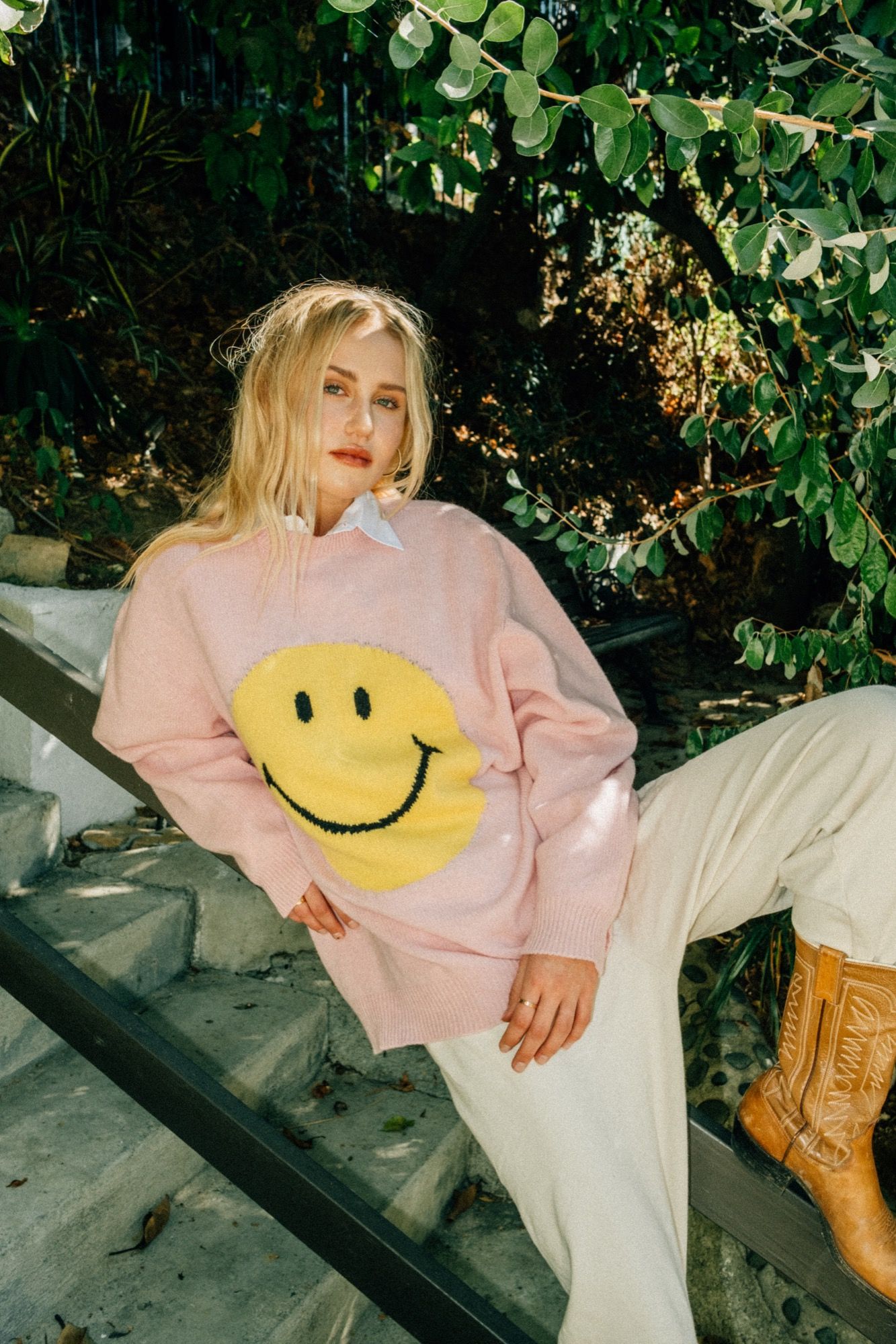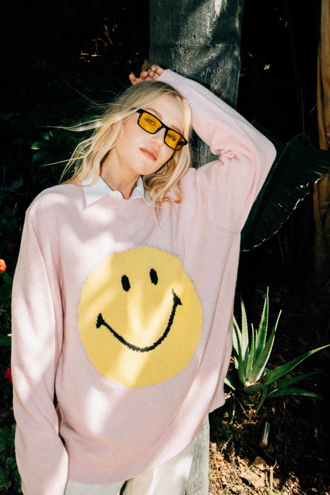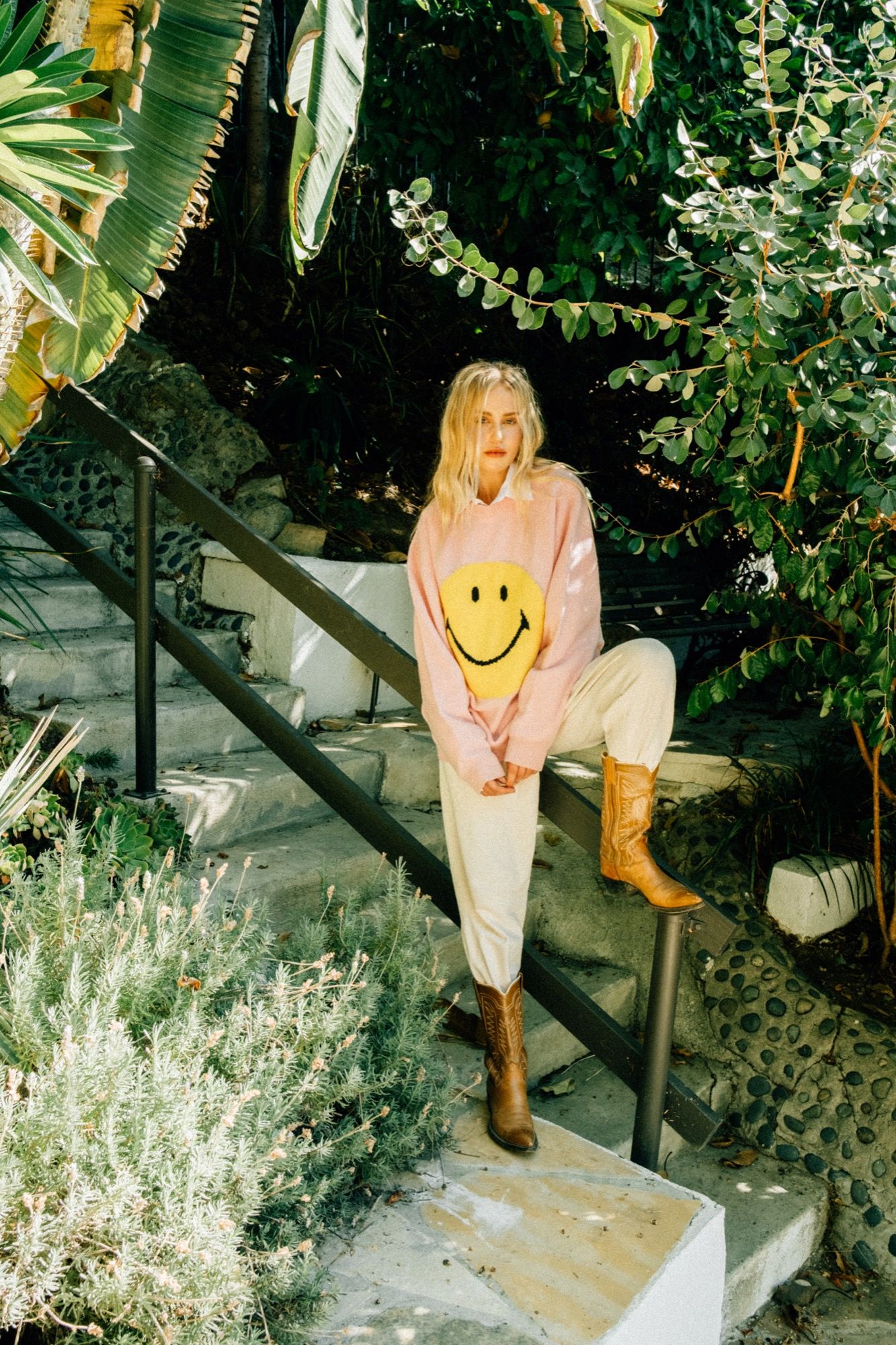 This first capsule collection (the first of a series of collections that will feature the Smiley icon) consists of ten items and includes shirts, cashmere mixed sweaters decorated with large smiley and embroidered sweatshirts that evoke the cities of New York and Los Angeles. Los Angeles is moreover the scenario chosen for the lookbook that evokes the cheerful mood of the collection by imagining a student party in the garden of a Hollywood villa.
