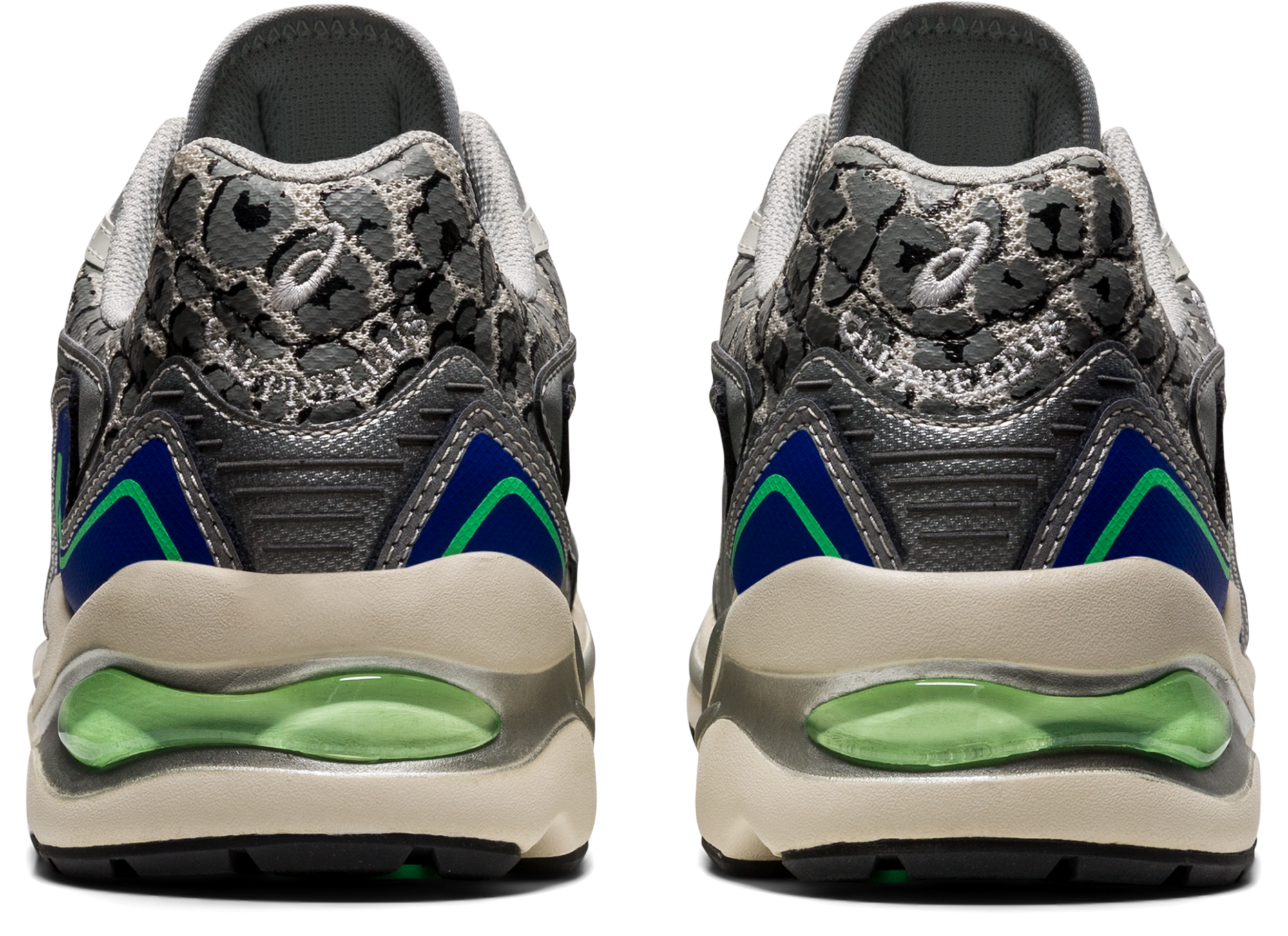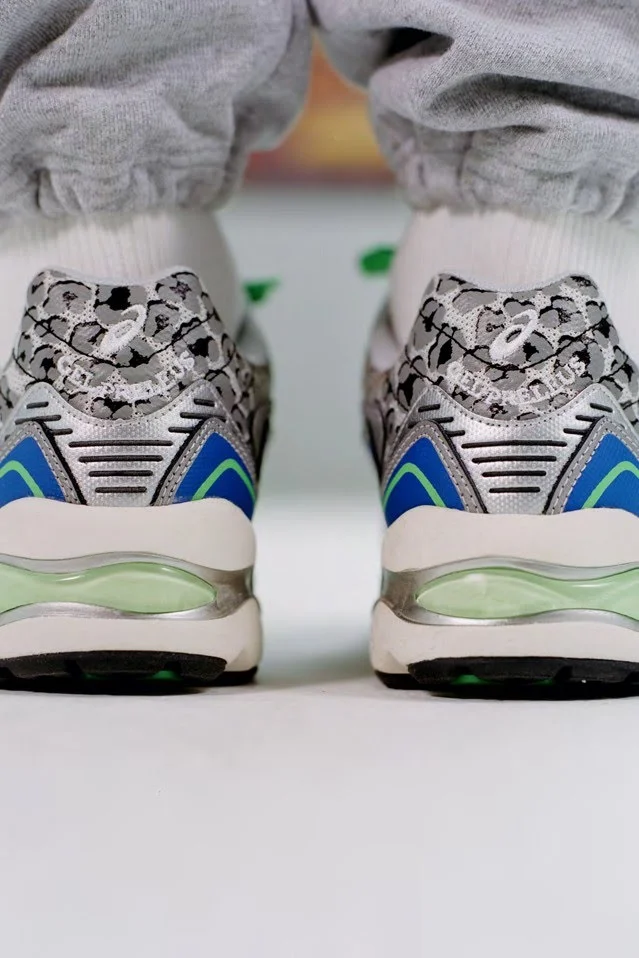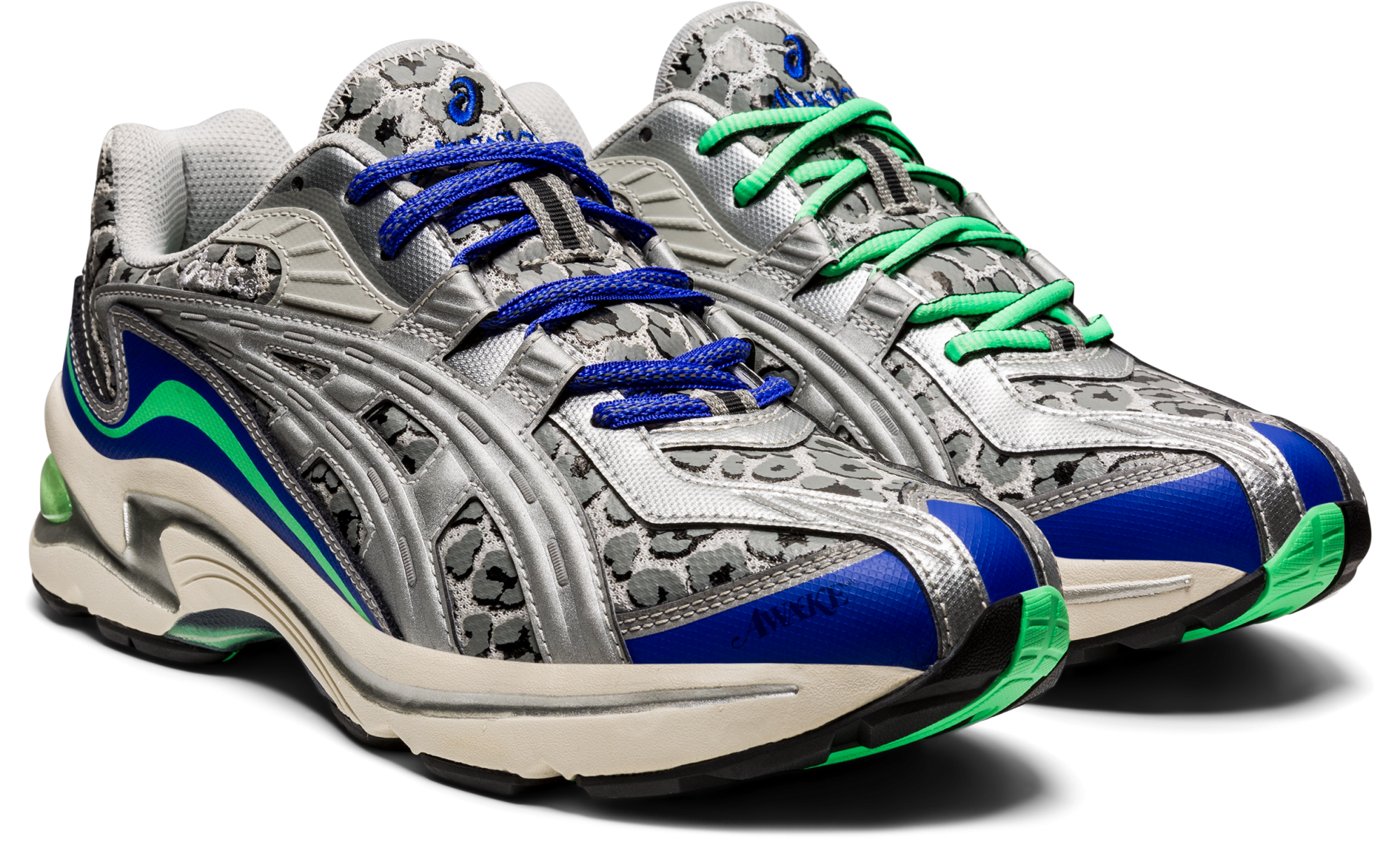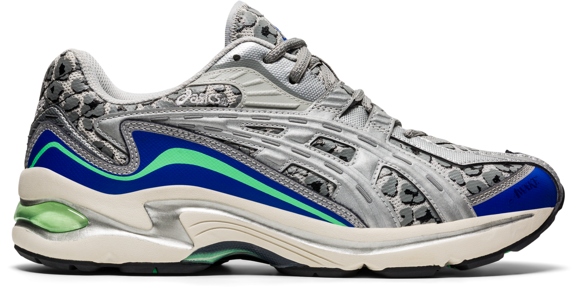 The new collaborative silhouette has a decidedly technical look, thanks to its mix of synthetic materials. The mesh at the base of the upper is covered with an all-over leopard print, while the Asics logo and other elements are made of silver leather. A section, between the blue upper and the wavy sole, adds colour to the sneaker.