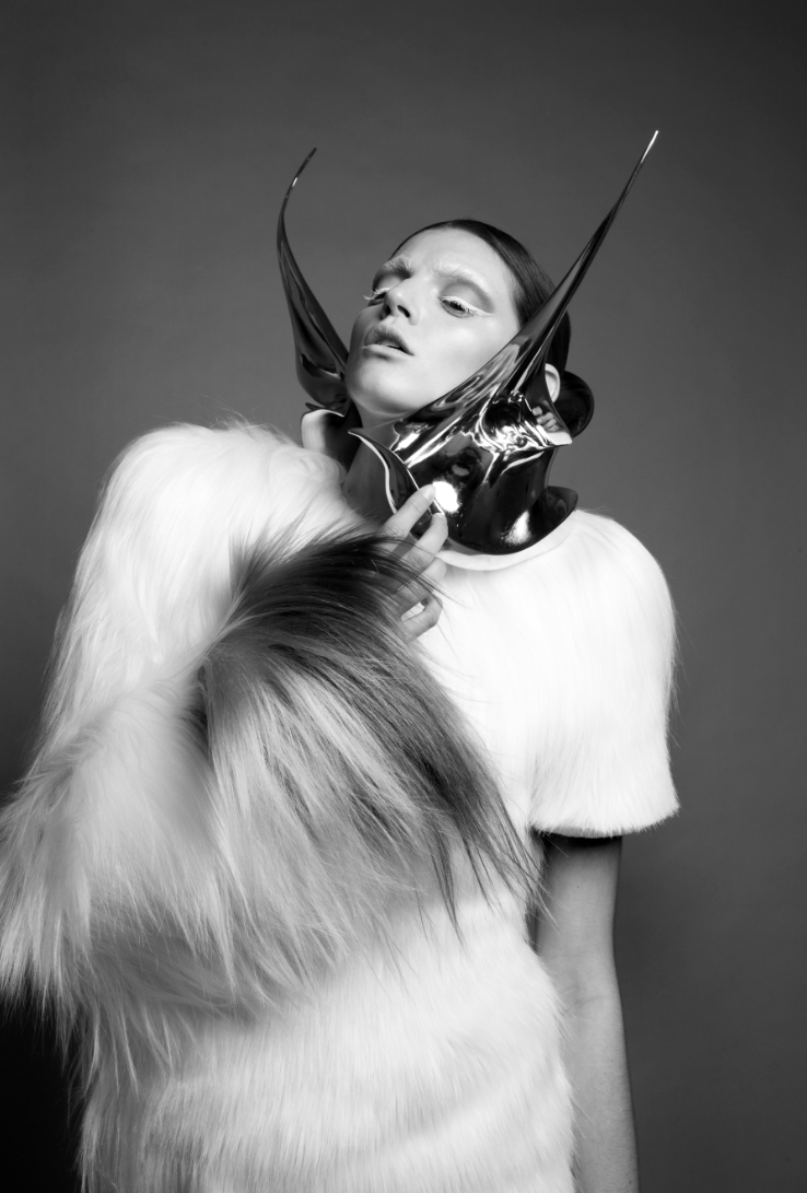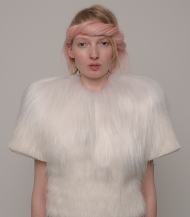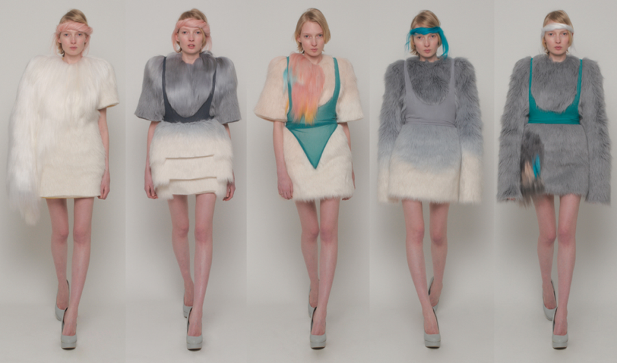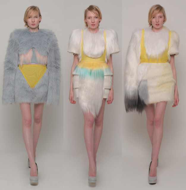 Andrei Amado treats faux fur as any other kind of material. He cuts it, carves it, mistreats it. He encapsulates it into lycra cages, giving birth to hyperfeminine yet unexpected silhouettes.