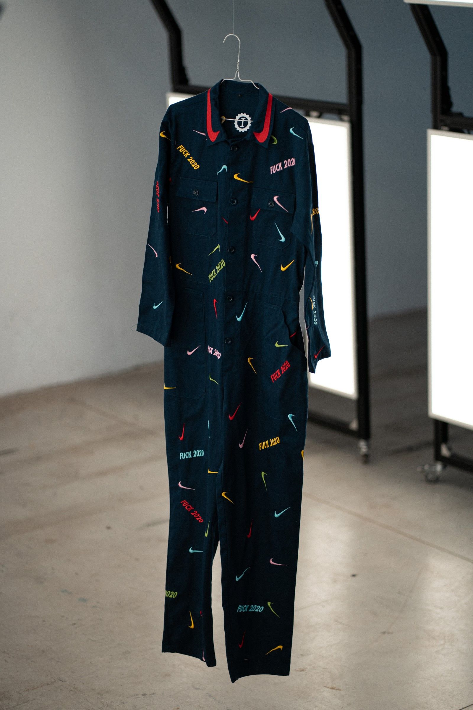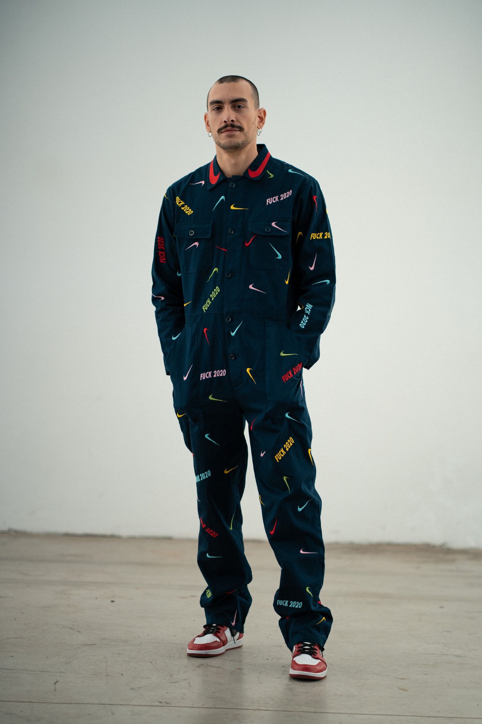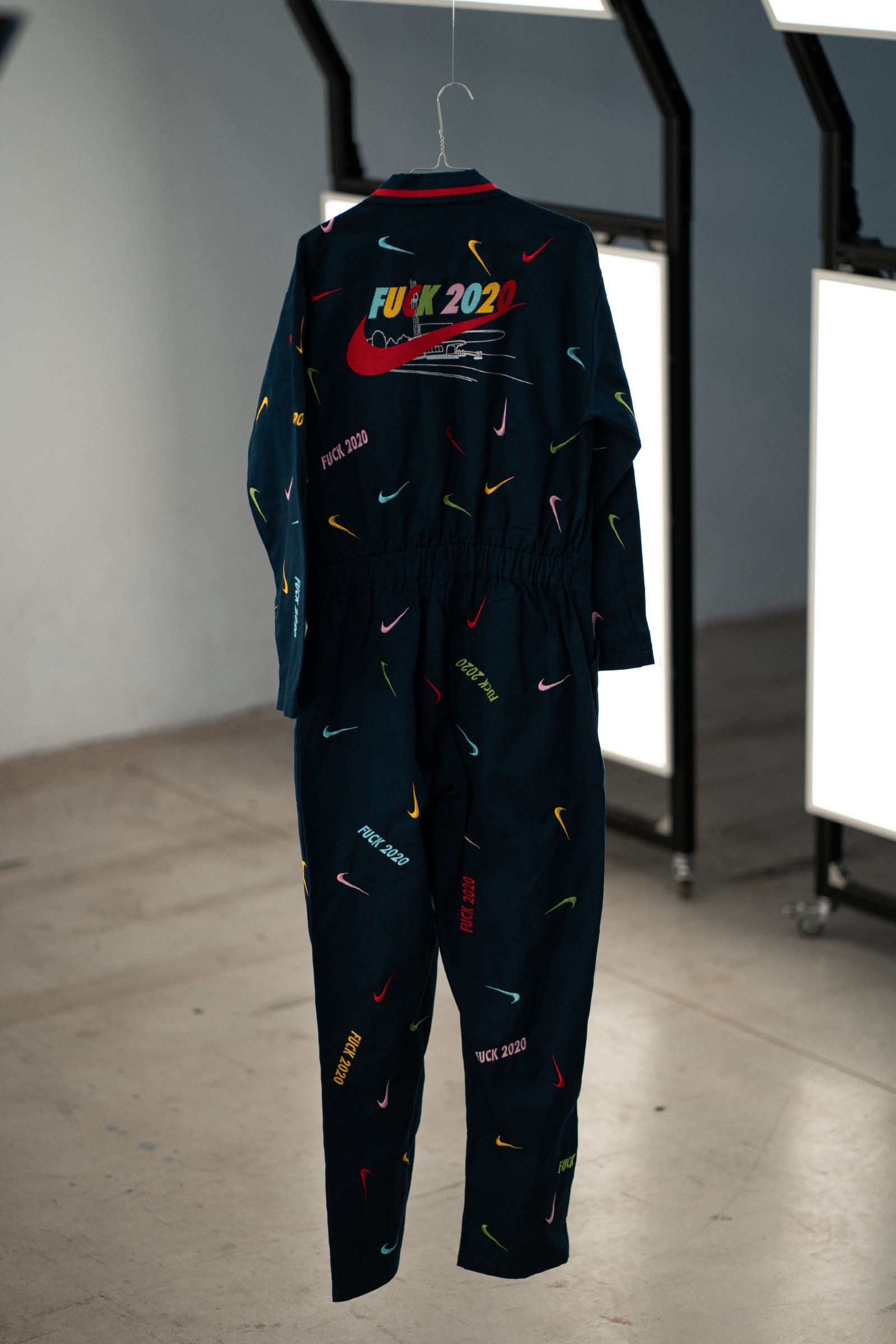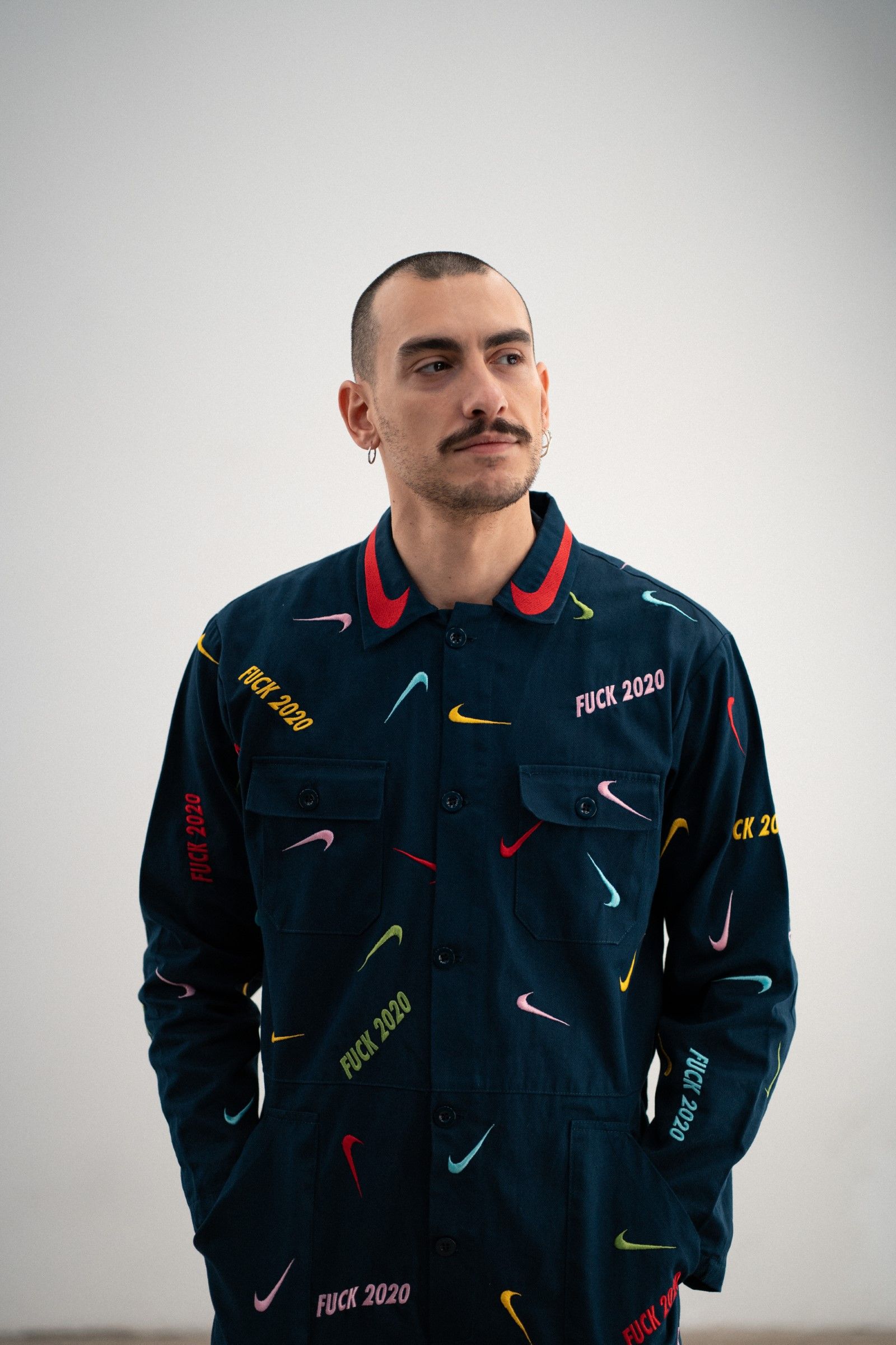 For his jumpsuit, the art director and graphic designer of Cagliari, Davide Perella, already returning from collaborations with brands such as Moschino, Nike, Neil Barrett and Alberta Ferretti, was inspired by his passion for Nike and Swoosh by adding the slogan "Fuck 2020". All the embroidery of his garment, were then made by an embroidery factory in his native Sardinia. Shoe designer and artist Nicoletta Saracco, on the other hand, has brought a more committed imprint to her work, decorating the jumpsuit with the logo and artwork of NI.ART.GALLERY, the creative project she started and directed to tell about her fight against breast cancer and raise funds for the IEO Foundation (European Institute of Oncology). Through the embroidery of the Madonna, symbol of NI.ART.GALLERY, and the logo of her project on the back, Nicoletta brought together the imagination of her world and that of Garage Italia.
