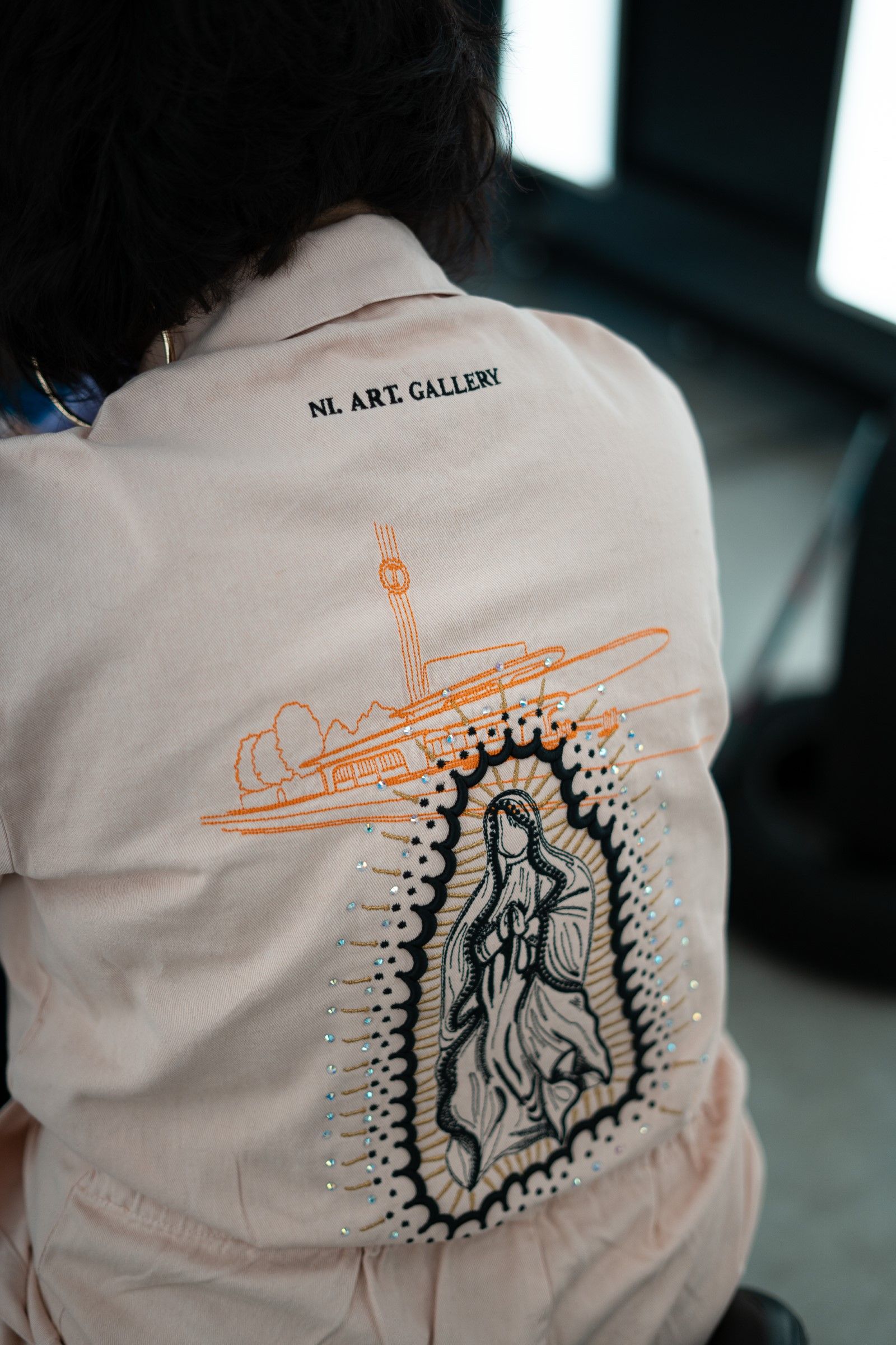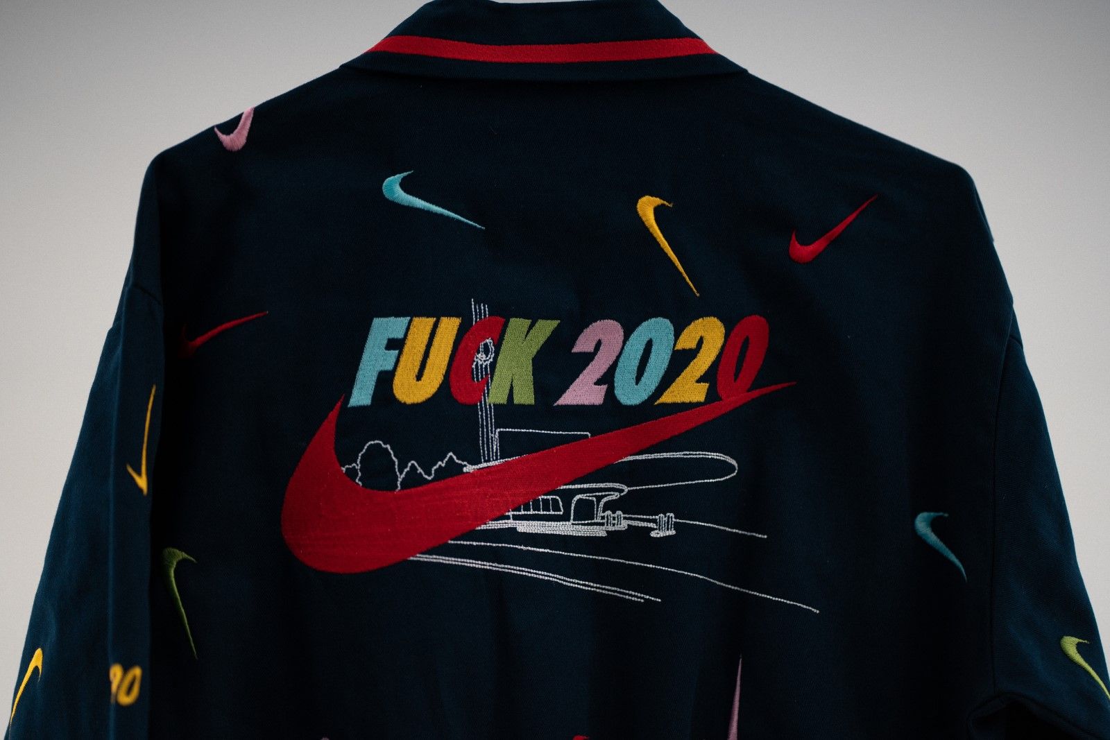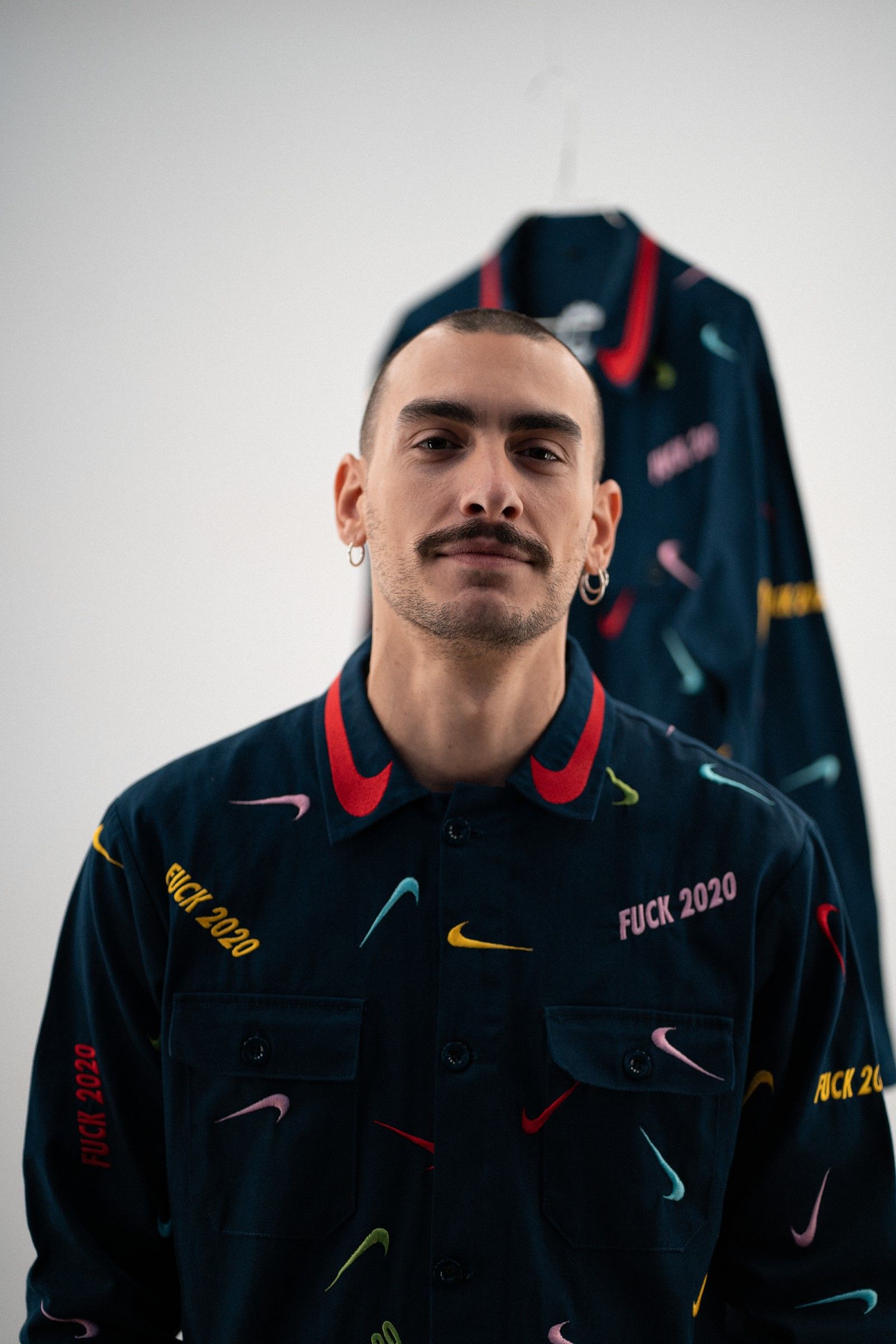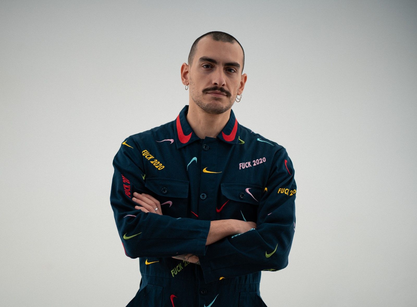 For his jumpsuit, the art director and graphic designer of Cagliari, Davide Perella, already returning from collaborations with brands such as Moschino, Nike, Neil Barrett and Alberta Ferretti, was inspired by his passion for Nike and Swoosh by adding the slogan "Fuck 2020". All the embroidery of his garment, were then made by an embroidery factory in his native Sardinia. Shoe designer and artist Nicoletta Saracco, on the other hand, has brought a more committed imprint to her work, decorating the jumpsuit with the logo and artwork of NI.ART.GALLERY, the creative project she started and directed to tell about her fight against breast cancer and raise funds for the IEO Foundation (European Institute of Oncology). Through the embroidery of the Madonna, symbol of NI.ART.GALLERY, and the logo of her project on the back, Nicoletta brought together the imagination of her world and that of Garage Italia.
