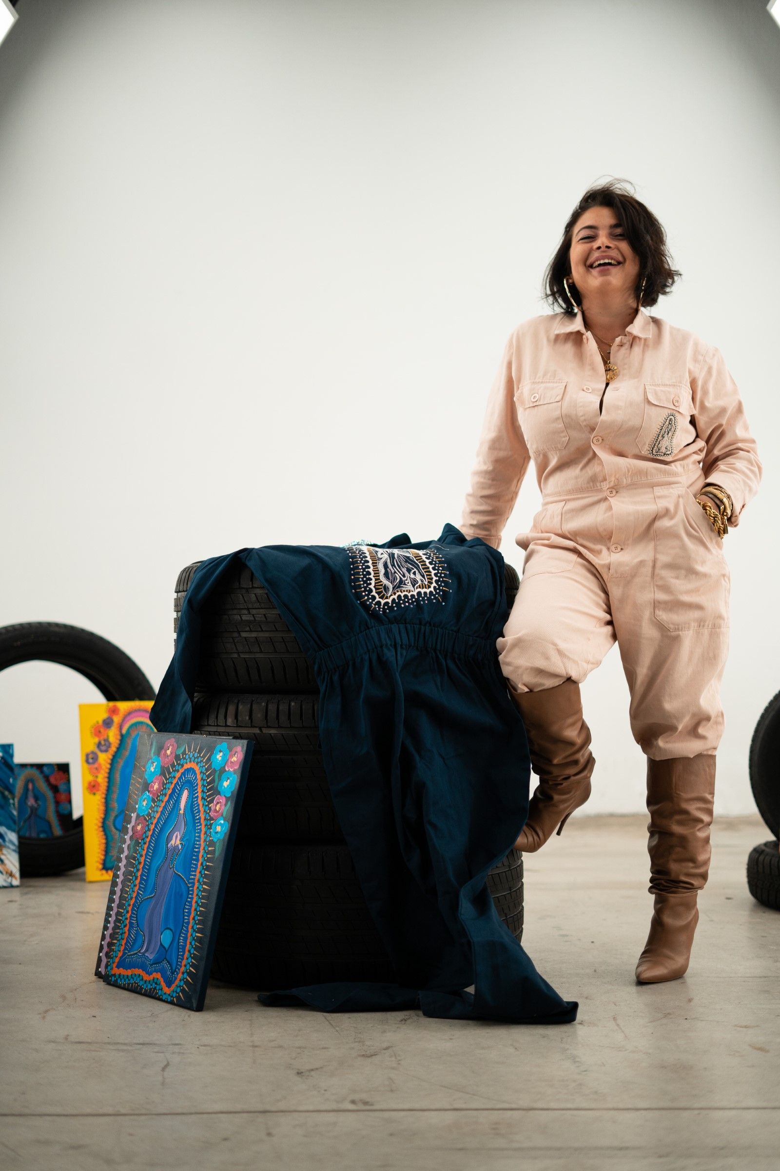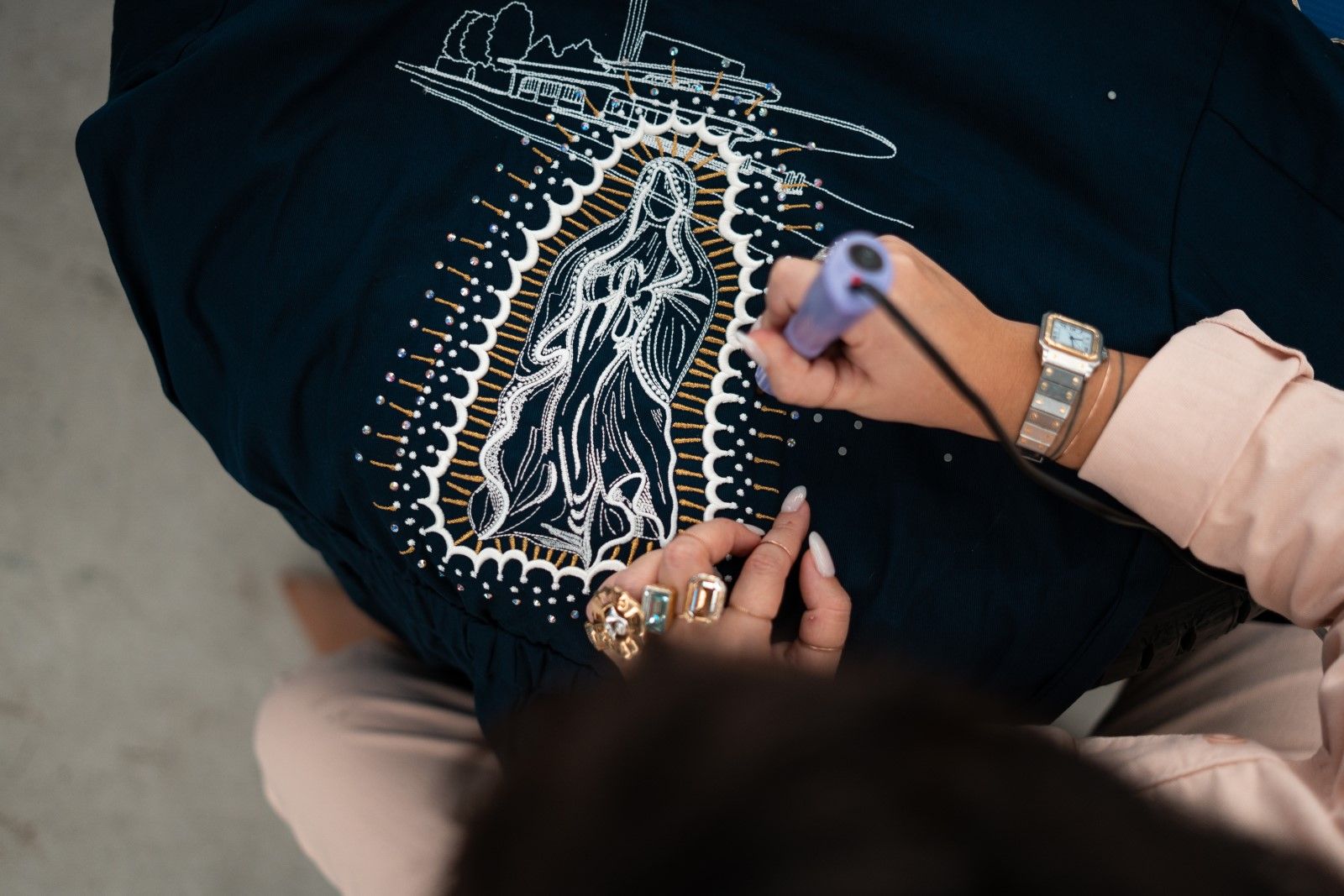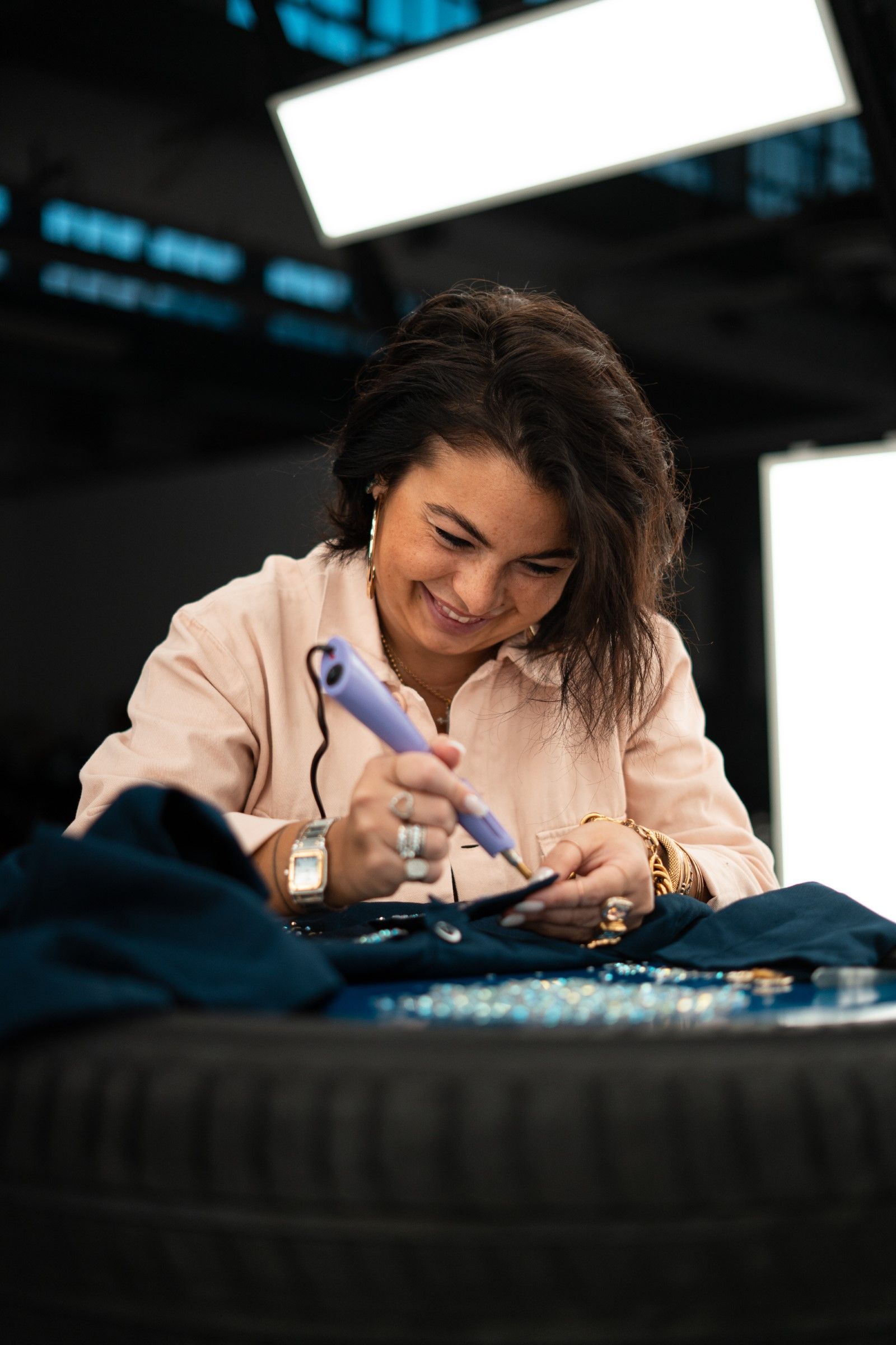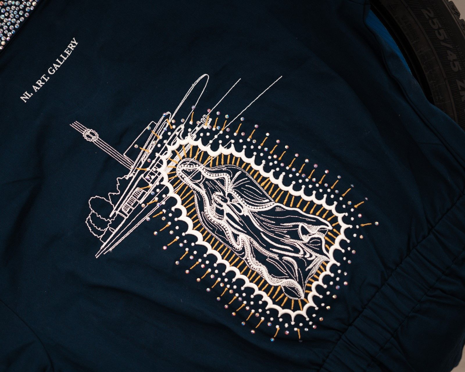 For his jumpsuit, the art director and graphic designer of Cagliari, Davide Perella, already returning from collaborations with brands such as Moschino, Nike, Neil Barrett and Alberta Ferretti, was inspired by his passion for Nike and Swoosh by adding the slogan "Fuck 2020". All the embroidery of his garment, were then made by an embroidery factory in his native Sardinia. Shoe designer and artist Nicoletta Saracco, on the other hand, has brought a more committed imprint to her work, decorating the jumpsuit with the logo and artwork of NI.ART.GALLERY, the creative project she started and directed to tell about her fight against breast cancer and raise funds for the IEO Foundation (European Institute of Oncology). Through the embroidery of the Madonna, symbol of NI.ART.GALLERY, and the logo of her project on the back, Nicoletta brought together the imagination of her world and that of Garage Italia.