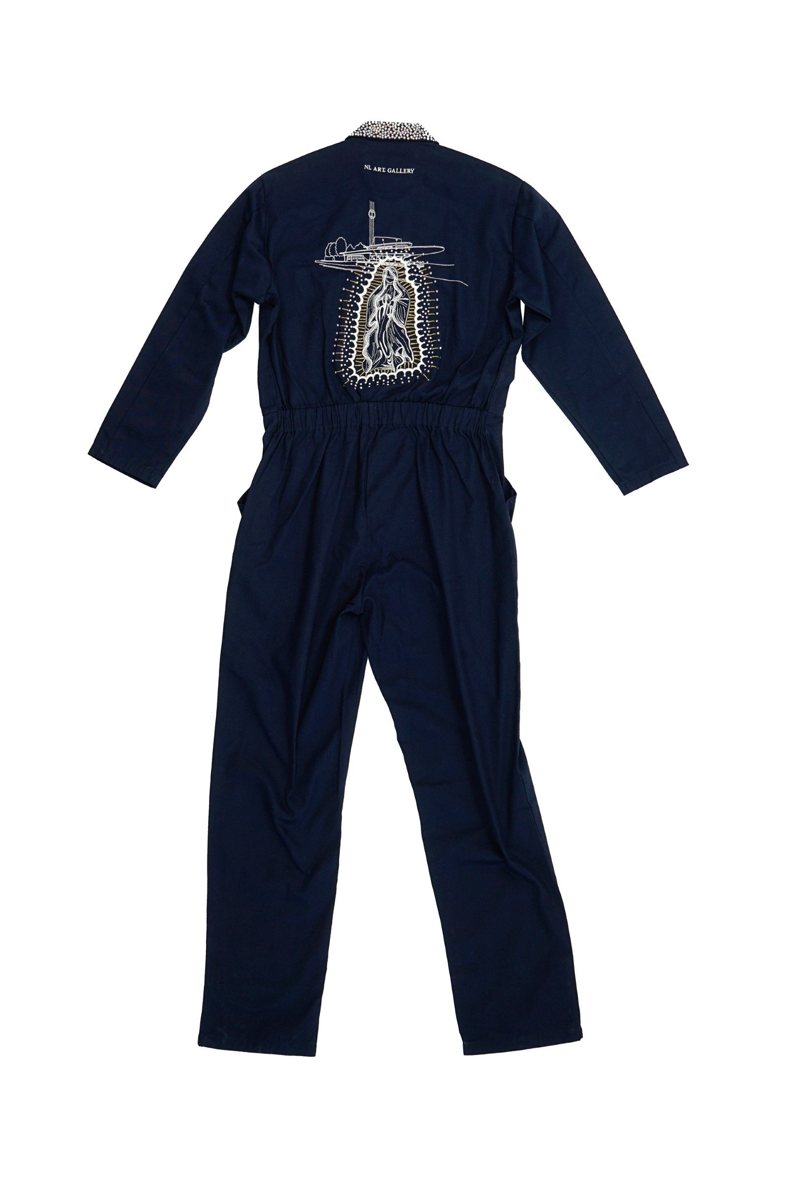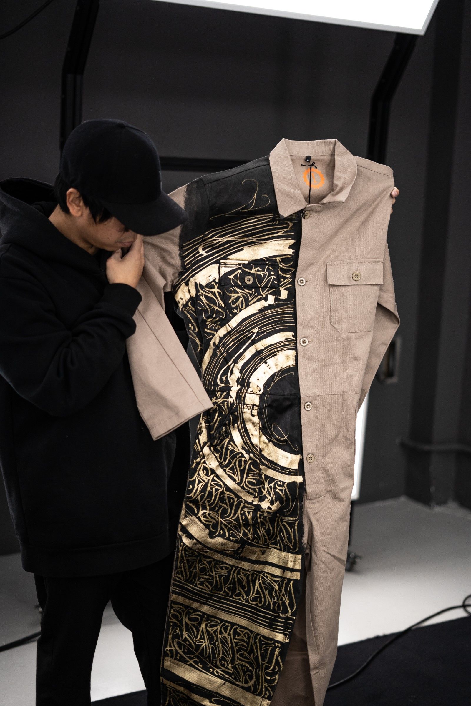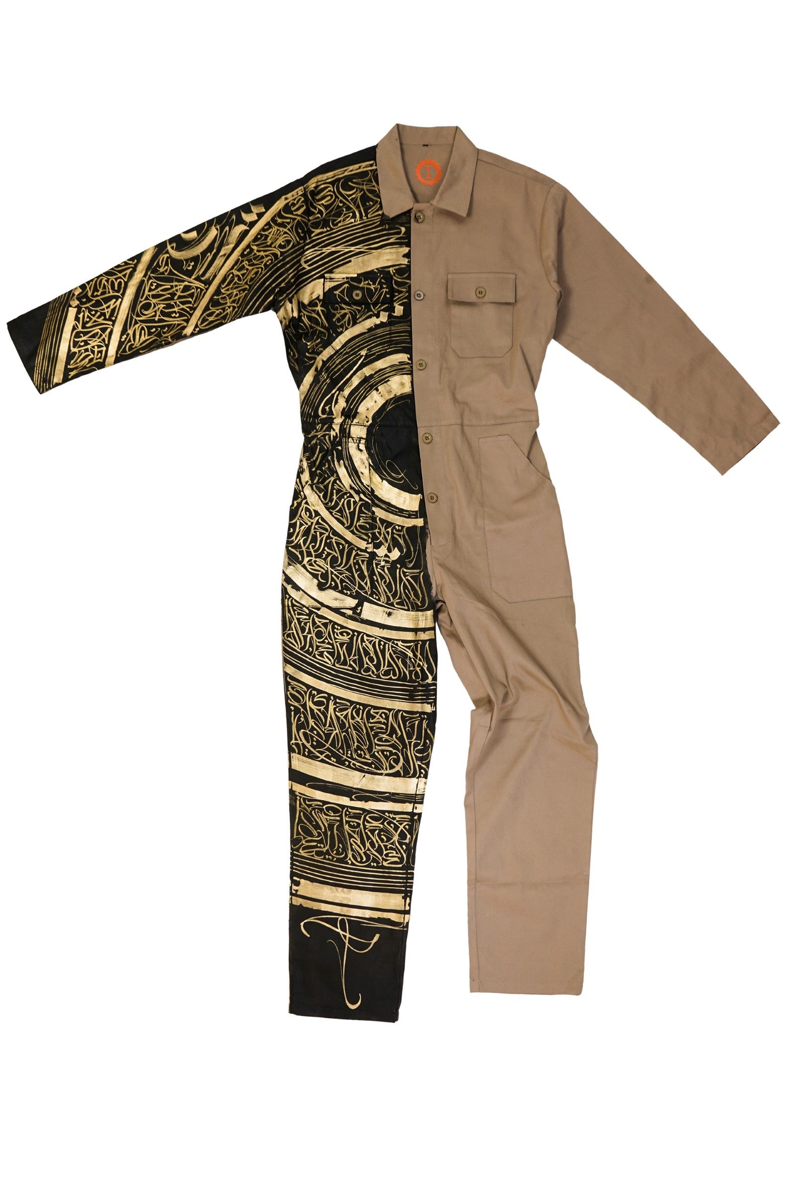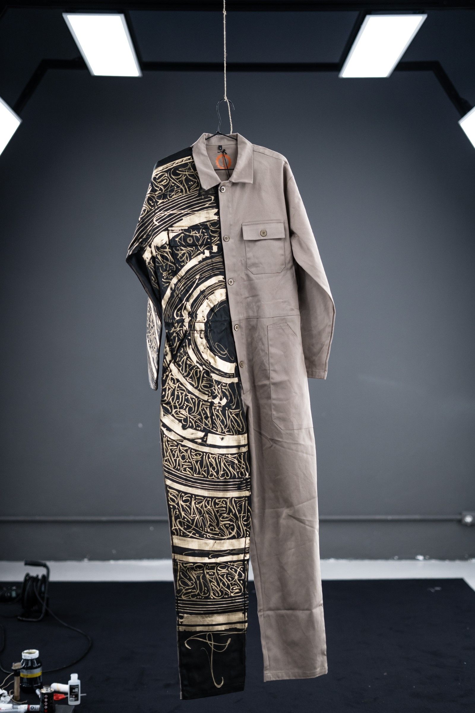 The self-taught artist Matteo Piccolo, aka Teti, instead brought to the jumpsuit his DIY aesthetic, which is expressed both through his abstract and geometric lines, which he called Axonometry, decorating the garment with further details such as unusually shaped buttons, cut-outs and fabric dyes. Finally, the Filipino artist Patrick Eduardo, whose work focuses on a redefinition of the concept of artistic calligraphy, used a base of black acrylic and gold details to convey on the jumpsuit the aesthetics of his paintings, cutting "in half" the garment that is divided into an ornate section and another essential in contrast to each other.