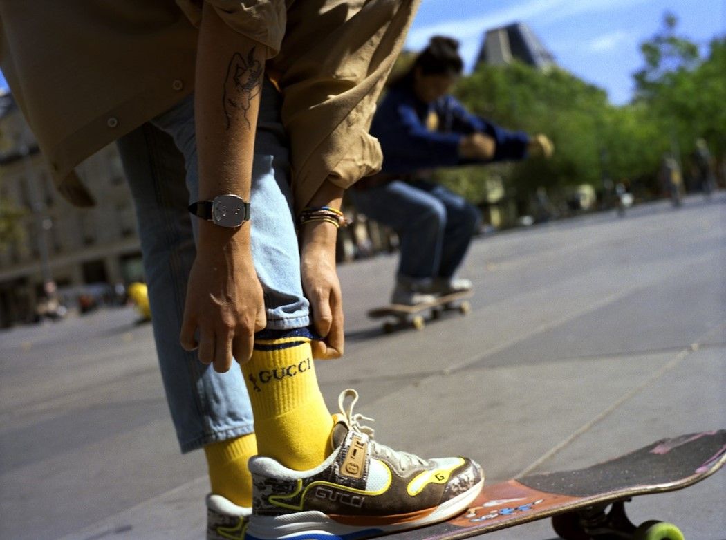 The exaggerated silhouette and prominent laces are just two of the characteristics of a sneaker that visibly winks at the skater aesthetic of the early 2000s when brands like Etnies and DC were the absolute masters of the scene well before the advent of the Osiris D3s. Given the absence of a well-rooted skater culture in Italy, at the time old school chunky sneakers had become synonymous and symbol of a rave subculture and social centres between the 90s and the 2000s. History divides in the States United, which has seen a growing movement since the seventies thanks to personalities such as Stacy Peralta and Tony Alva, until its pop explosion in the 90s with Tony Hawk. A bond made even stronger by another testimonial of excellence such as Evan Mock, actor but above all skater chosen by Lanvin as the face of the Curb sneaker campaign. A story that tells once again the immoderate passion of the fashion world for the skater culture, passed from the status of a subculture and true cornerstone of the fashion system. There is not only the now consolidated success of brands like Palace, Supreme and Noah, but also the recent collaboration between Dior and Shawn Stüssy and the choice made by Alessandro Michele, who had chosen the queer skate collective Unity for a Gucci campaign.