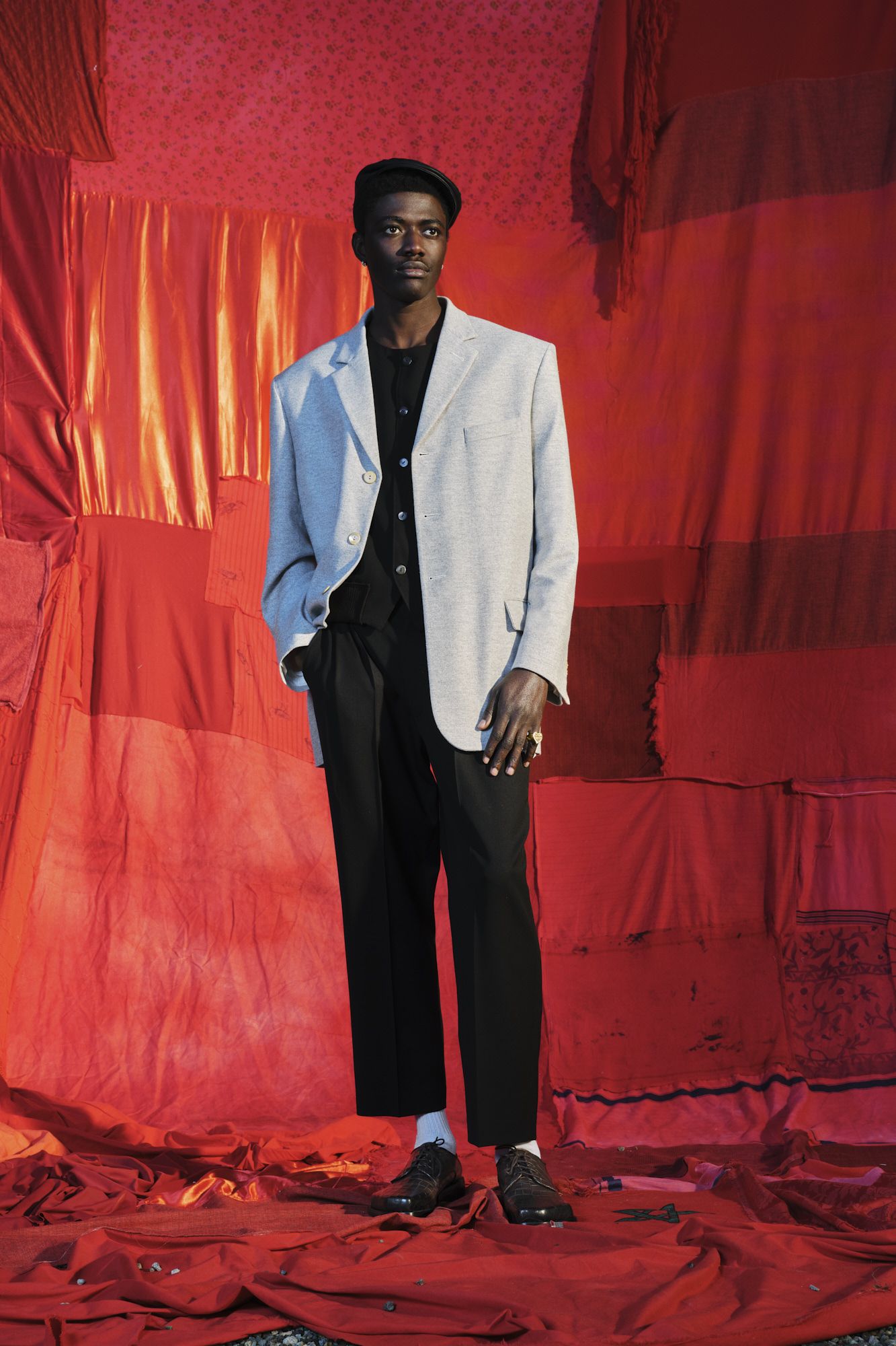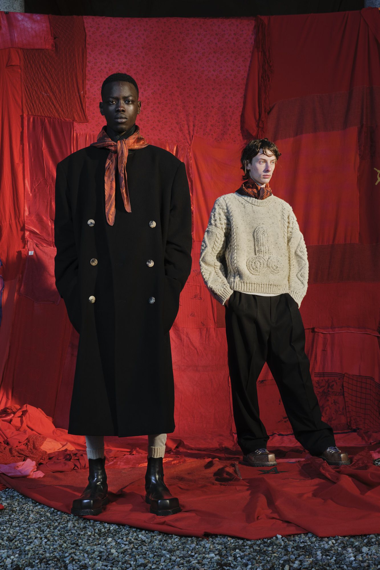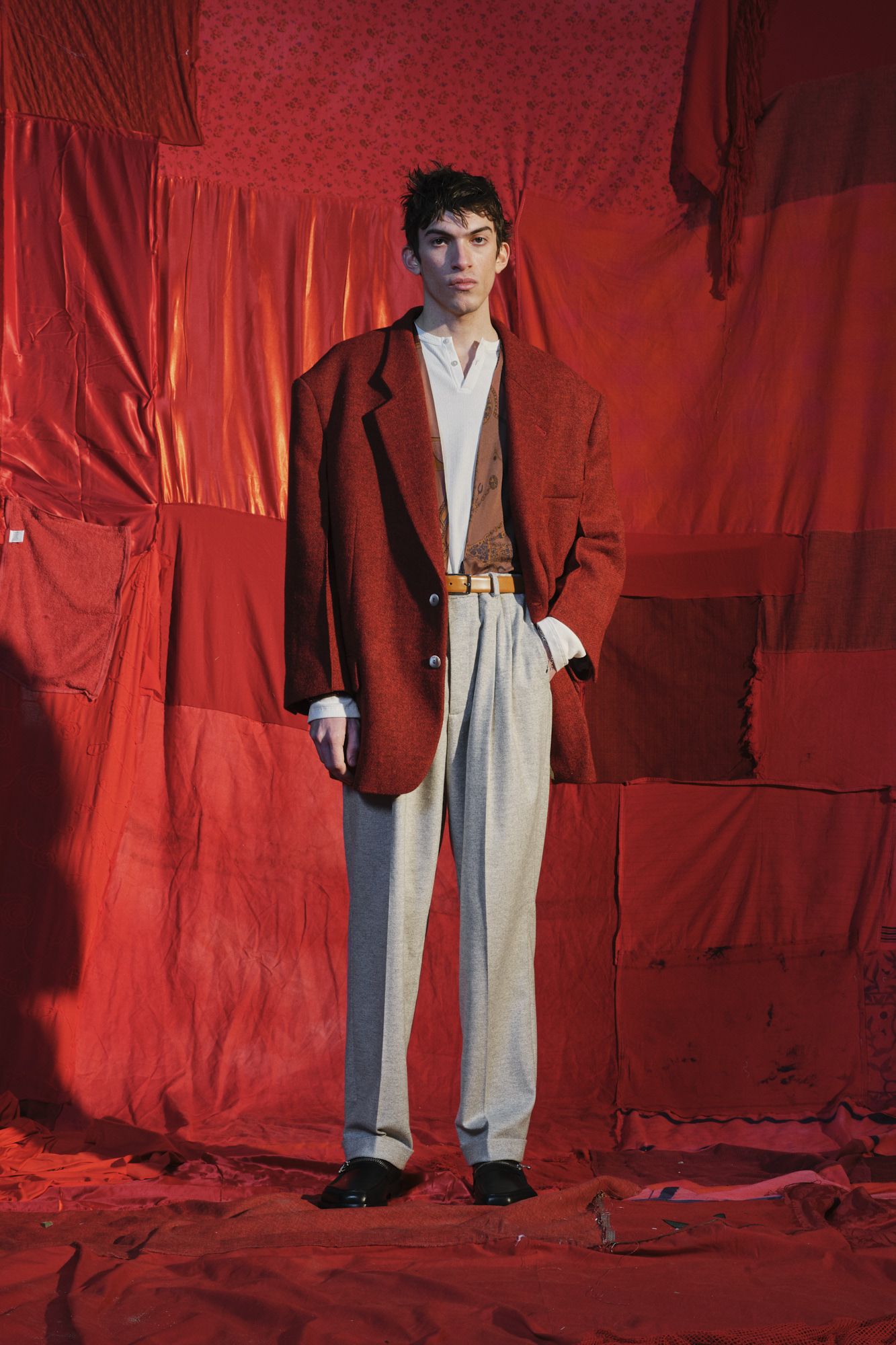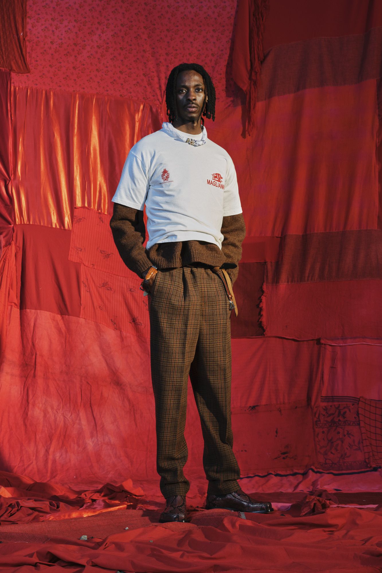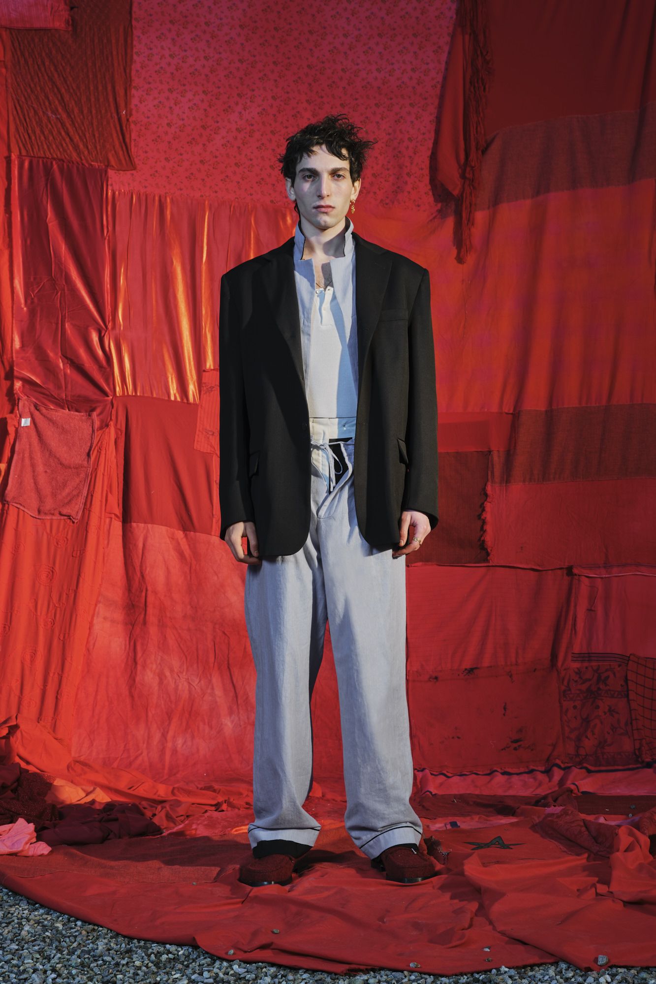 The range of garments is narrow and concise – a collection that wants to evoke pavese's lyrics, suspended between mythology and peasant civilization, but also Le Belle Bandiere di Pasolini and class struggles. A collection therefore on which, in the same words as the designer, «a particular patina, symptom of the time passing, sedimented in the Magliano wardrobe», symbolized by tweeds and almost archaic, durable fabrics, reminiscent of ancient work clothes. Not for this reason, however, Luca Magliano has renounced his usual irony and his innuendos, inserting in the cast of his characters the "Cruiser" and the "Frocialist" alongside workers and peasants, the punk group CCCP, the memories of the writer Yukio Mishima and the activist Angela Davis.