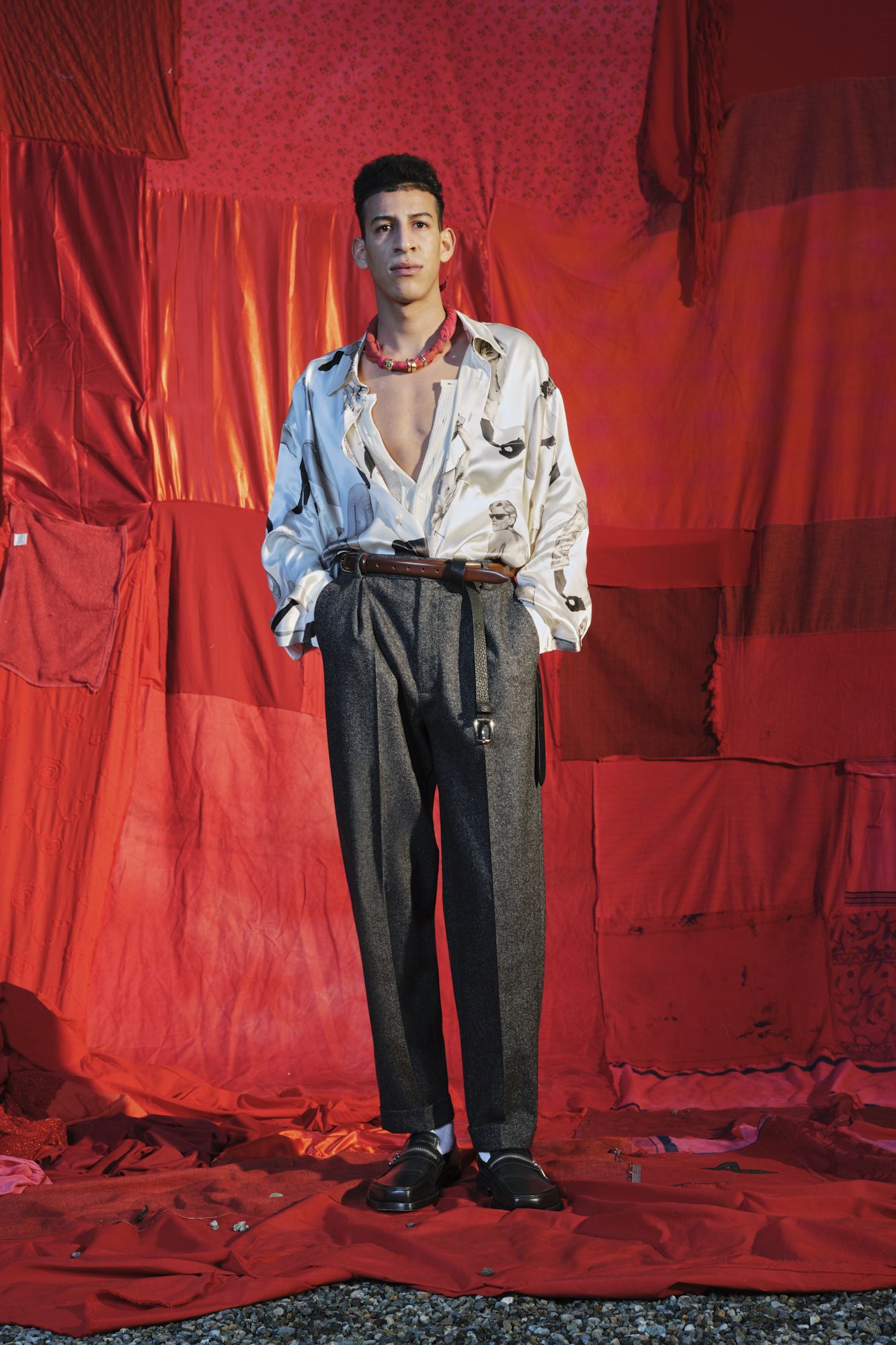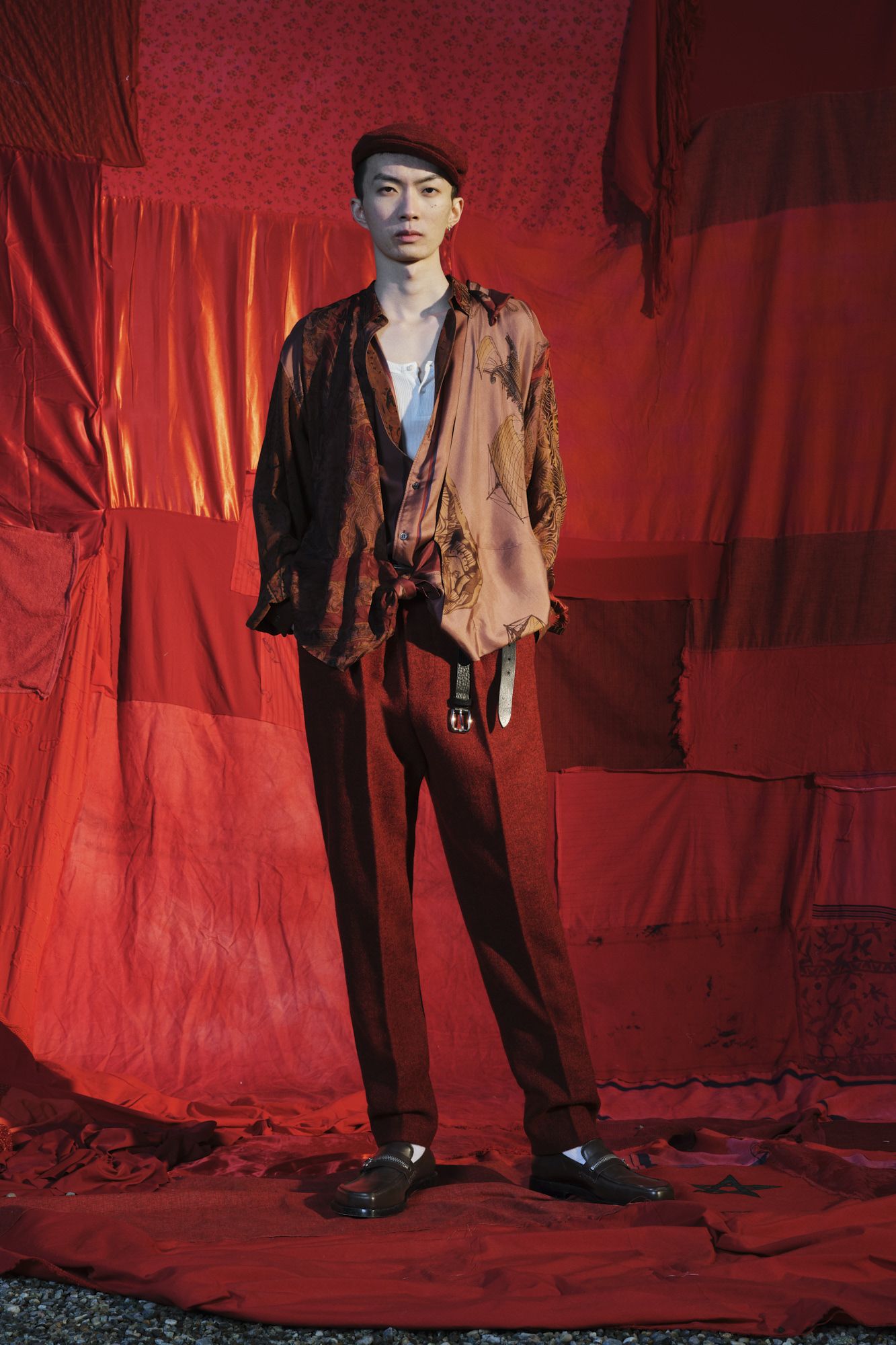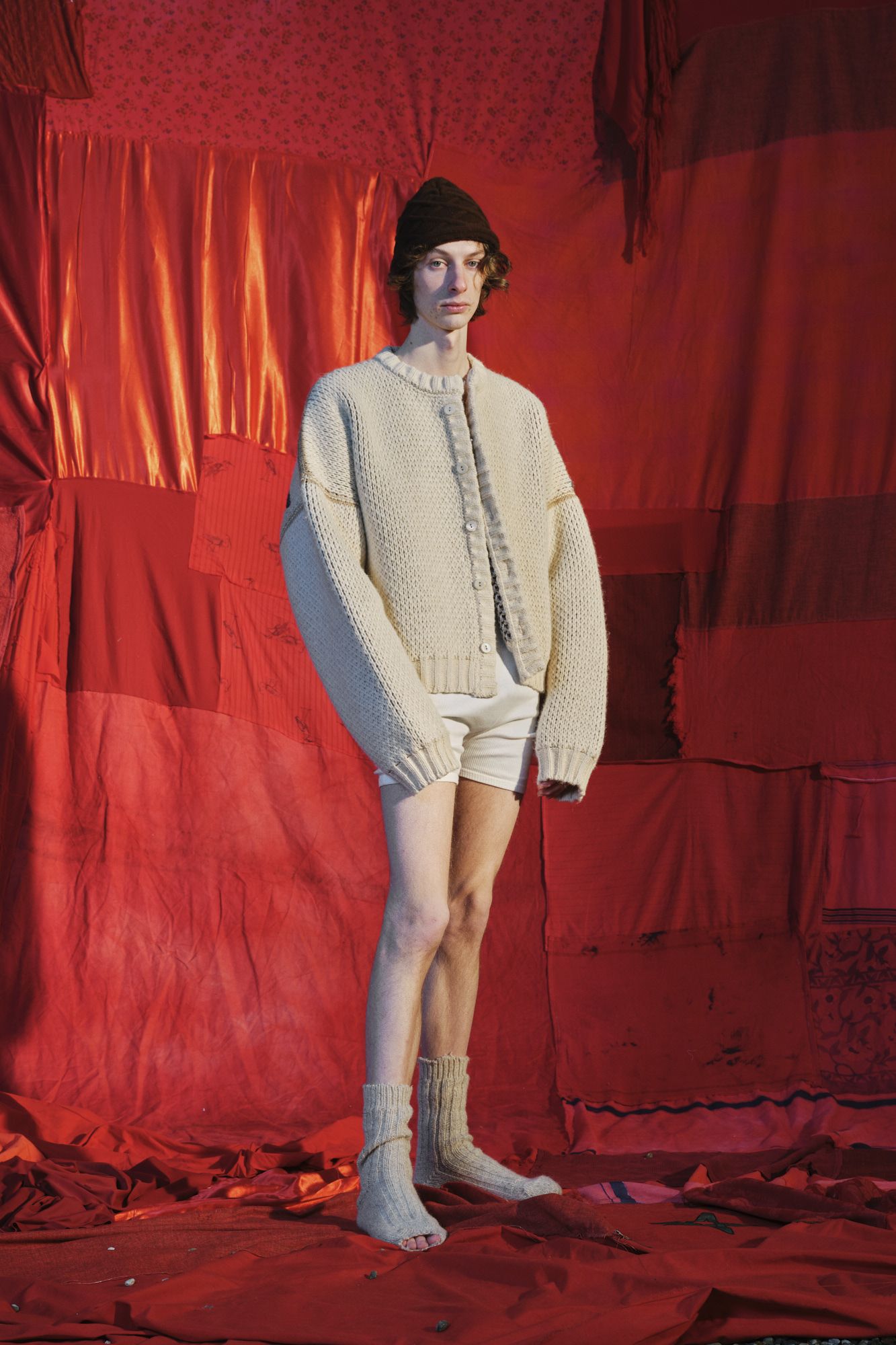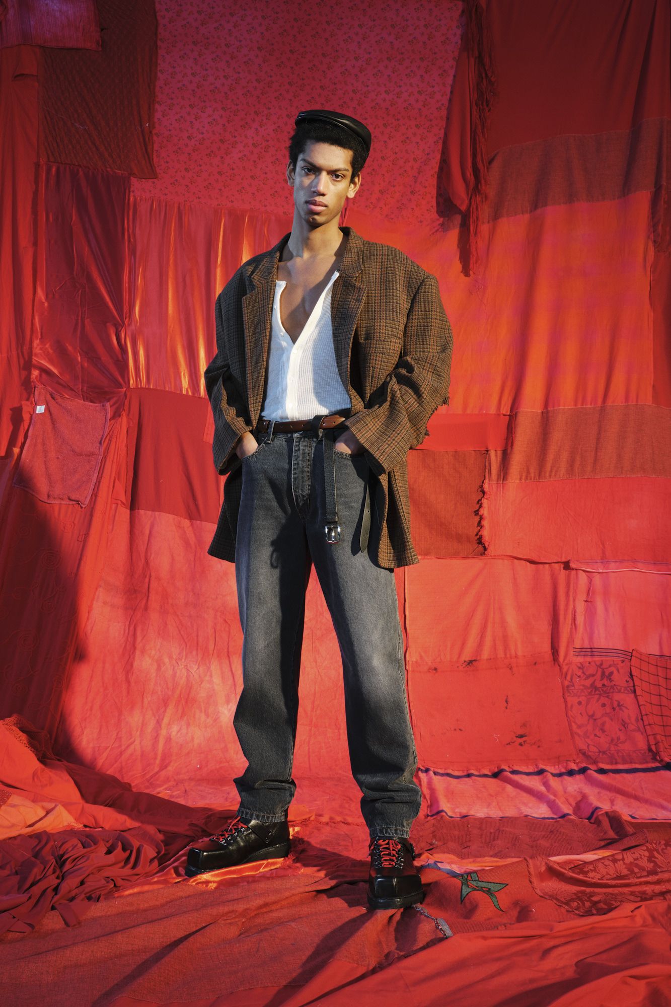 The range of garments is narrow and concise – a collection that wants to evoke pavese's lyrics, suspended between mythology and peasant civilization, but also Le Belle Bandiere di Pasolini and class struggles. A collection therefore on which, in the same words as the designer, «a particular patina, symptom of the time passing, sedimented in the Magliano wardrobe», symbolized by tweeds and almost archaic, durable fabrics, reminiscent of ancient work clothes. Not for this reason, however, Luca Magliano has renounced his usual irony and his innuendos, inserting in the cast of his characters the "Cruiser" and the "Frocialist" alongside workers and peasants, the punk group CCCP, the memories of the writer Yukio Mishima and the activist Angela Davis.