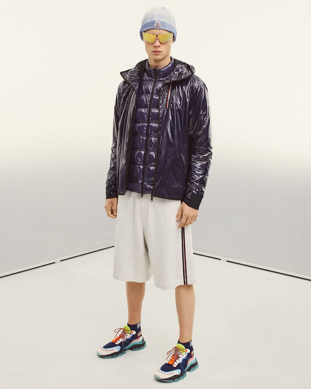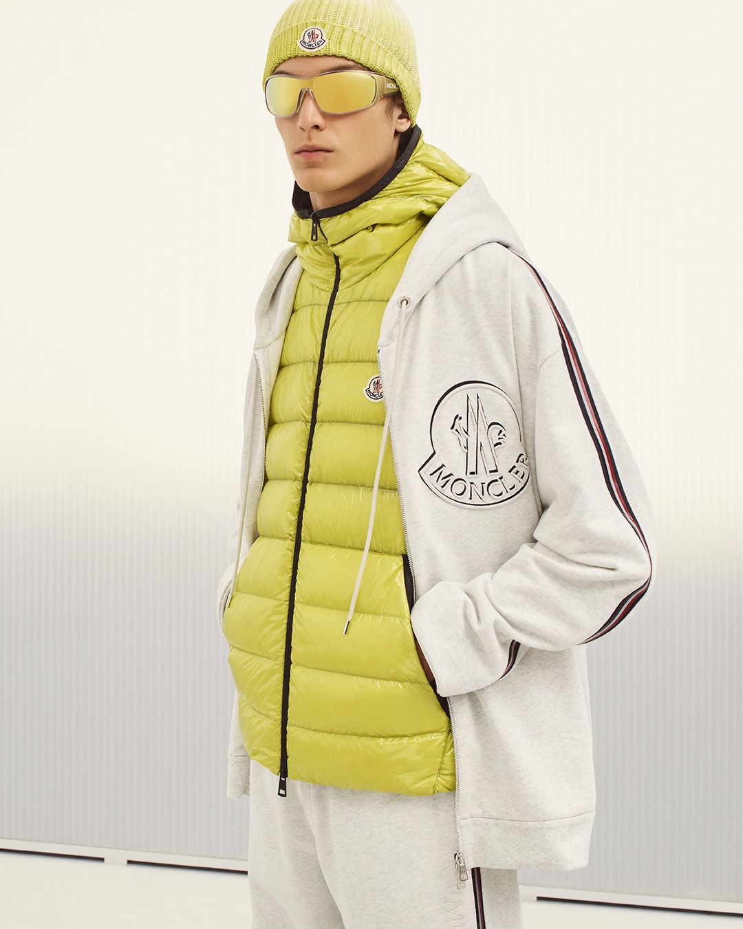 Highlights of the collection are certainly the three outerwear pieces that guide the collection: the Lappe vest, reworking in a lime green version of Moncler's traditional padded vest that allows maximum freedom of movement; the Agar spring jacket, inspired by an archive model, with boudin quilting, a light down padding and a double slider zip to customize the fit; and the Marly windbreaker, structured in nylon with icy finishes and equipped with elastic pads for perfect adherence to the body. The collection is completed by a series of cotton sweatshirts with oversized volumes, shorts and sports pants and two caps decorated in a tye-dye pattern.