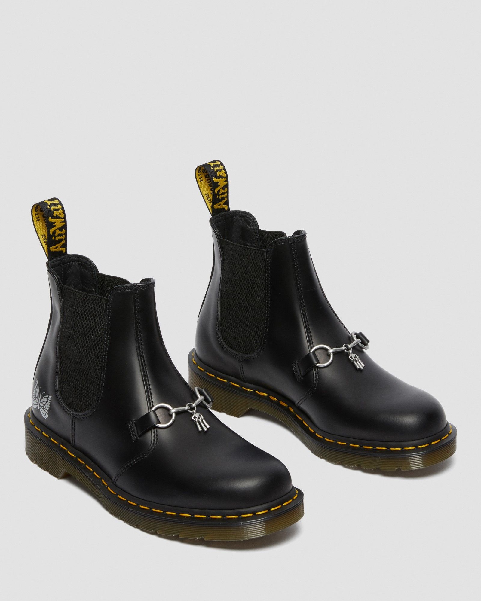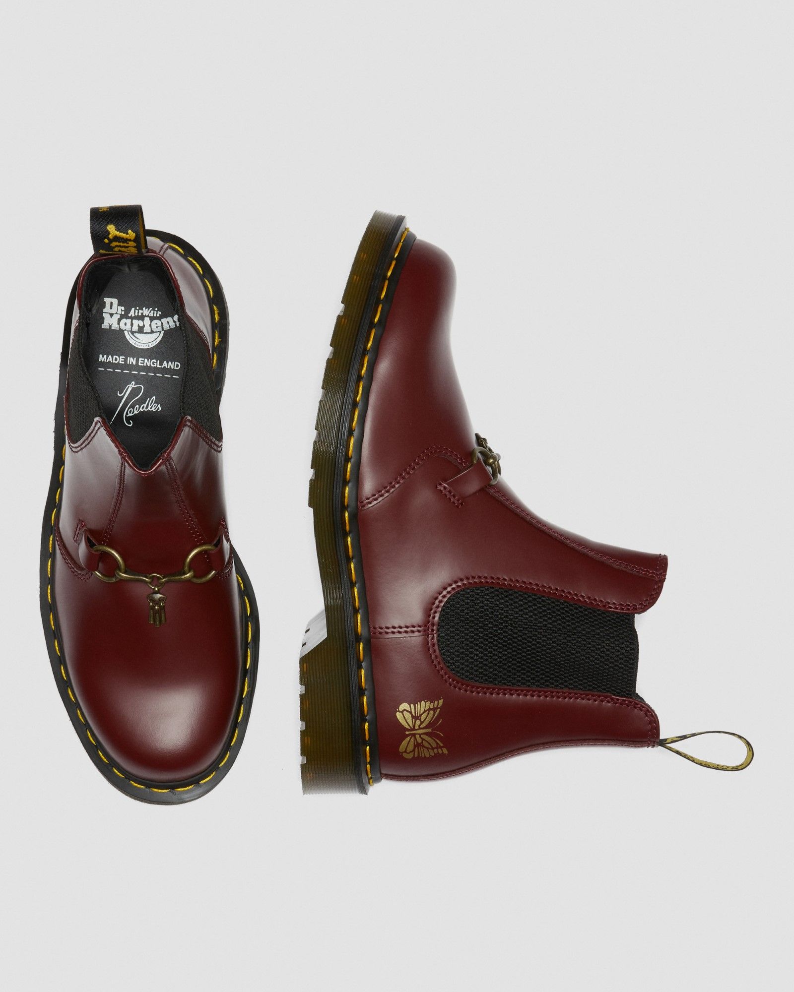 Made entirely in the historic English factory in Wollaston, the boots combine Dr. Martens' yellow stitching with Needles' Papillon logo (logo inspired by Franklin J. Schaffner's film of the same name). On the front of the upper was added a metallic tassel in silver version for the black colorway and in gold version for the red one. Double branding is also repeated on the inner sole.