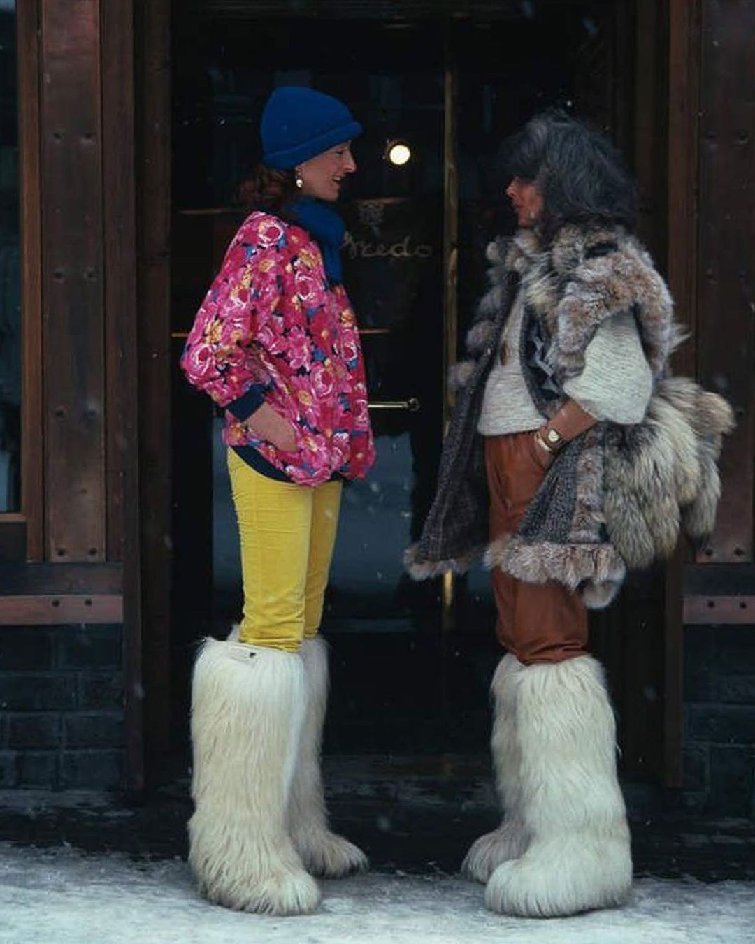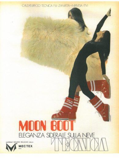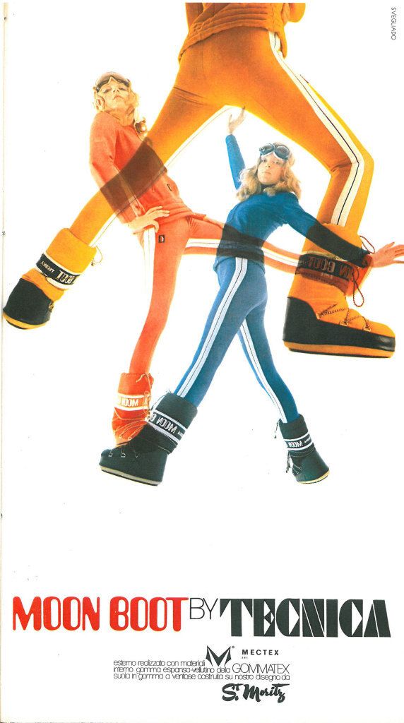 One of the greatest testaments of the cultural impact Moon Boot had in those years are the shots of Slim Aarons, a famous chronicler of the life of the European and American jet-set, who dedicated many series of photos to the jet-set of ski resorts such as Cortina and Gstaad in which the boots appear at the feet of the princesses of the last European aristocracy or at the feet of the guests of the Furstenberg house. The Moon Boot changed the rules: it was composed of nylon (the same fabric that In the mid-1980s Miuccia Prada would raise to luxury material), it was light, impossible to wet, ambidextrous and produced in a series of flamboyant colourways that gave a shock to the aristocratic and frigid après-ski wardrobe of the 70s. The use of synthetic materials had already been cleared in the USA by Bob Lange, but Zanatta adopted it better using double injection technology to create layers of material with different hardnesses giving life to the Tecnus boot – an operation learned by visiting Fiat factories where injection plastic moulds were used for car dashboards.