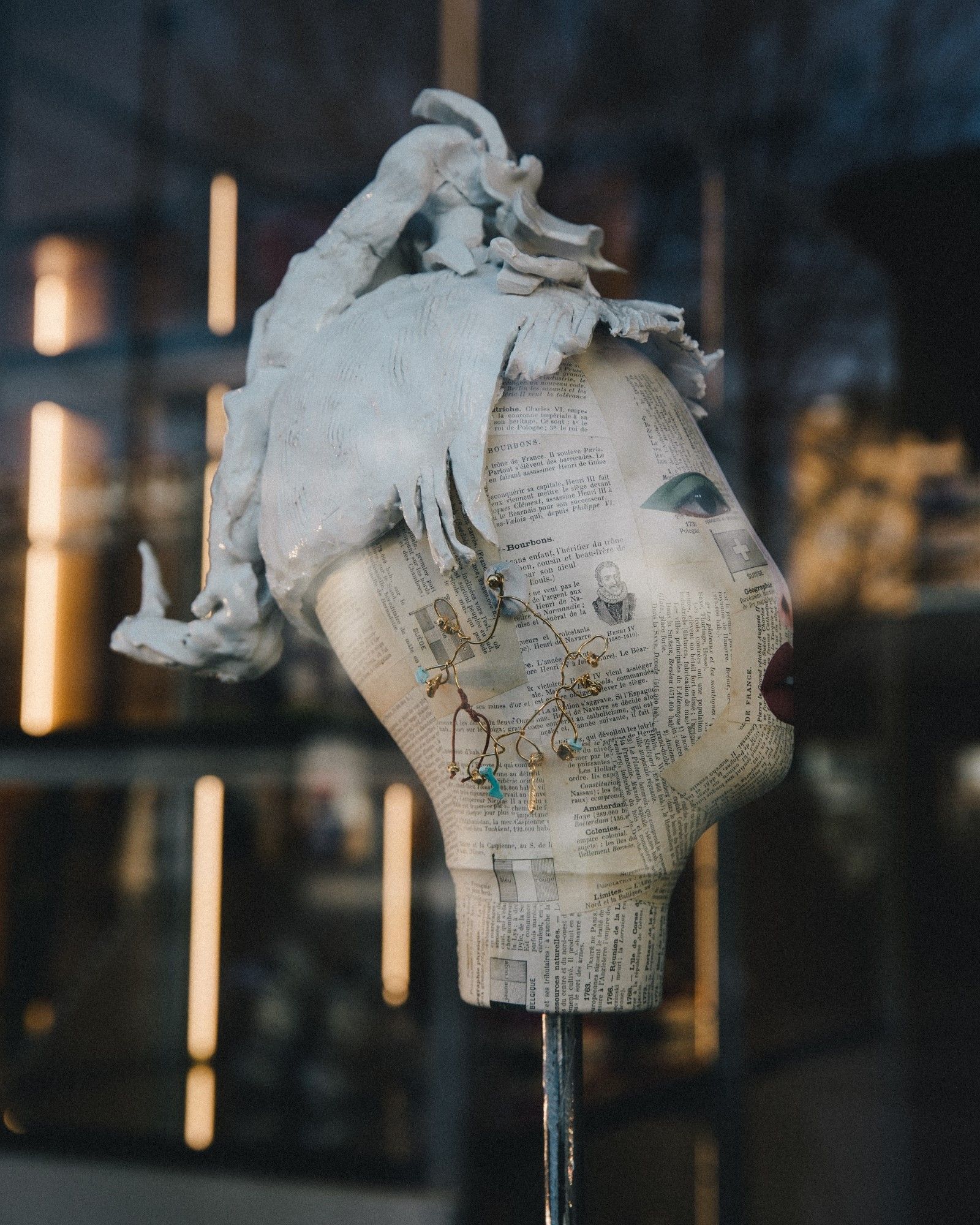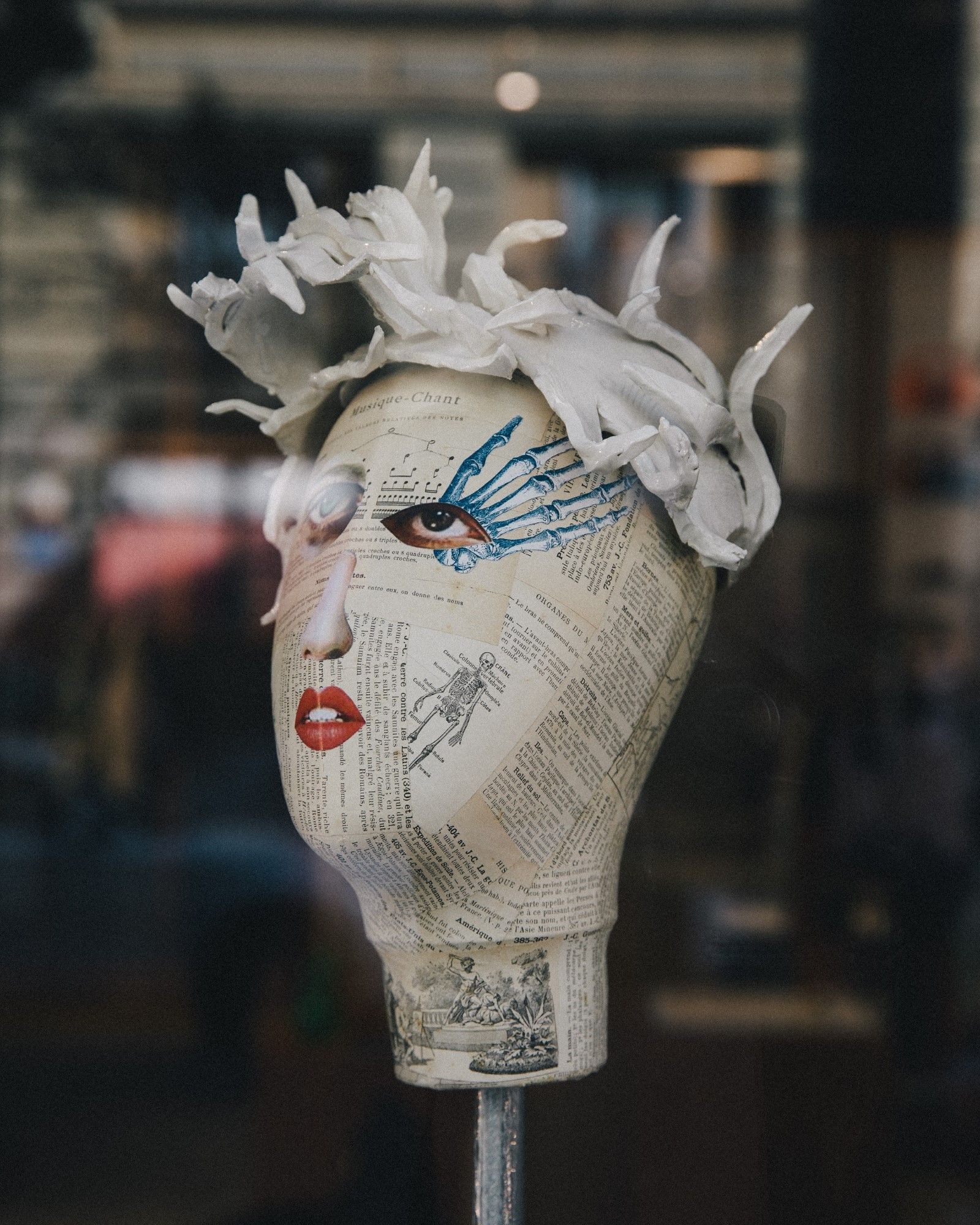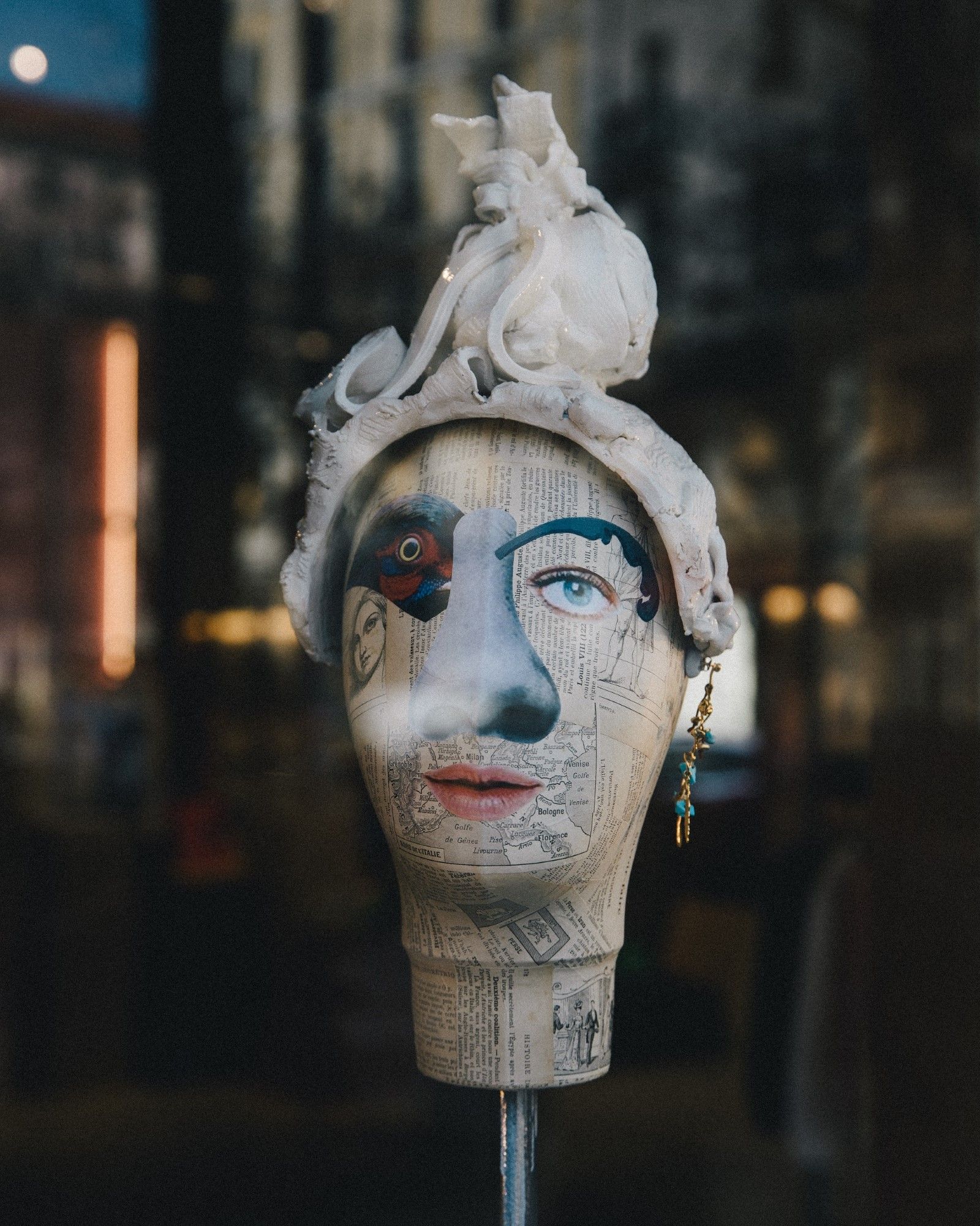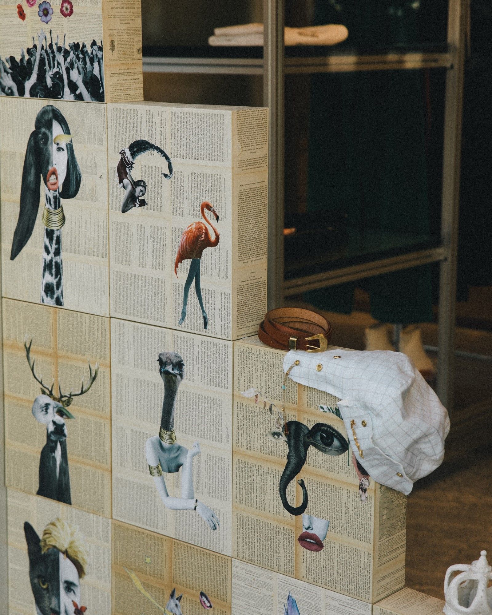 After their first collaboration presented on the occasion of last fashion week, the Florentine Federico Curradi and the hat-maker of hollywood stars, Nick Fouquet, presented their first capsule collection of womanswear. The windows of MODES, the boutique of Piazza Risorgimento in Milan, are the space chosen by the two to present their creations, through an installation-display, where oval heads and ceramic wigs with vaguely retro charm remain suspended with the garments on display together with the artistic boxes and decorated with collages that make up the packaging of the collection.