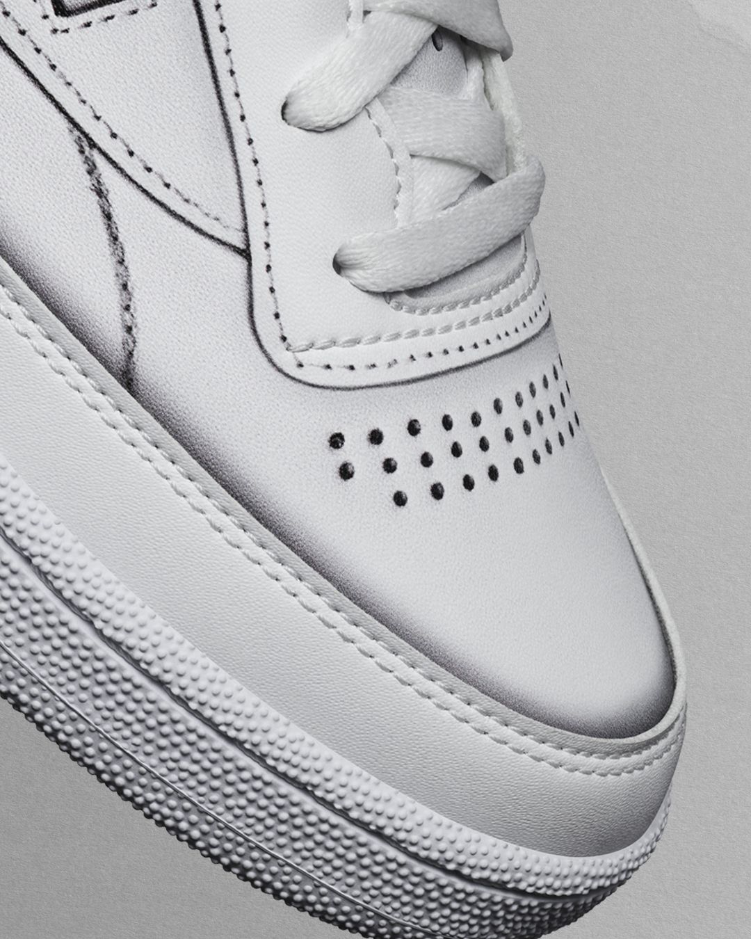 In the world of art, the so-called trompe l'oeil is a game of perspectives according to which a flat object, once painted, seems to take on depth and three-dimensionality. This is the technique that John Galliano, creative director of Maison Margiela, has chosen to characterize his most recent collaboration with Rebook, the Maison Margiela x Reebok Club C: composed of a single piece of smooth leather that would seem somewhat futuristic without decoration, but on whose upper was printed the scanned image of the original Reebok model.