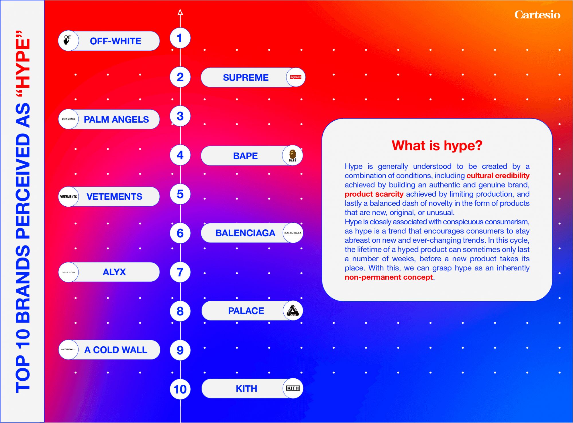 Surprisingly, none of these three brands has been associated with the hype category where the first three positions are occupied by Off-White, Supreme and Palm Angels.