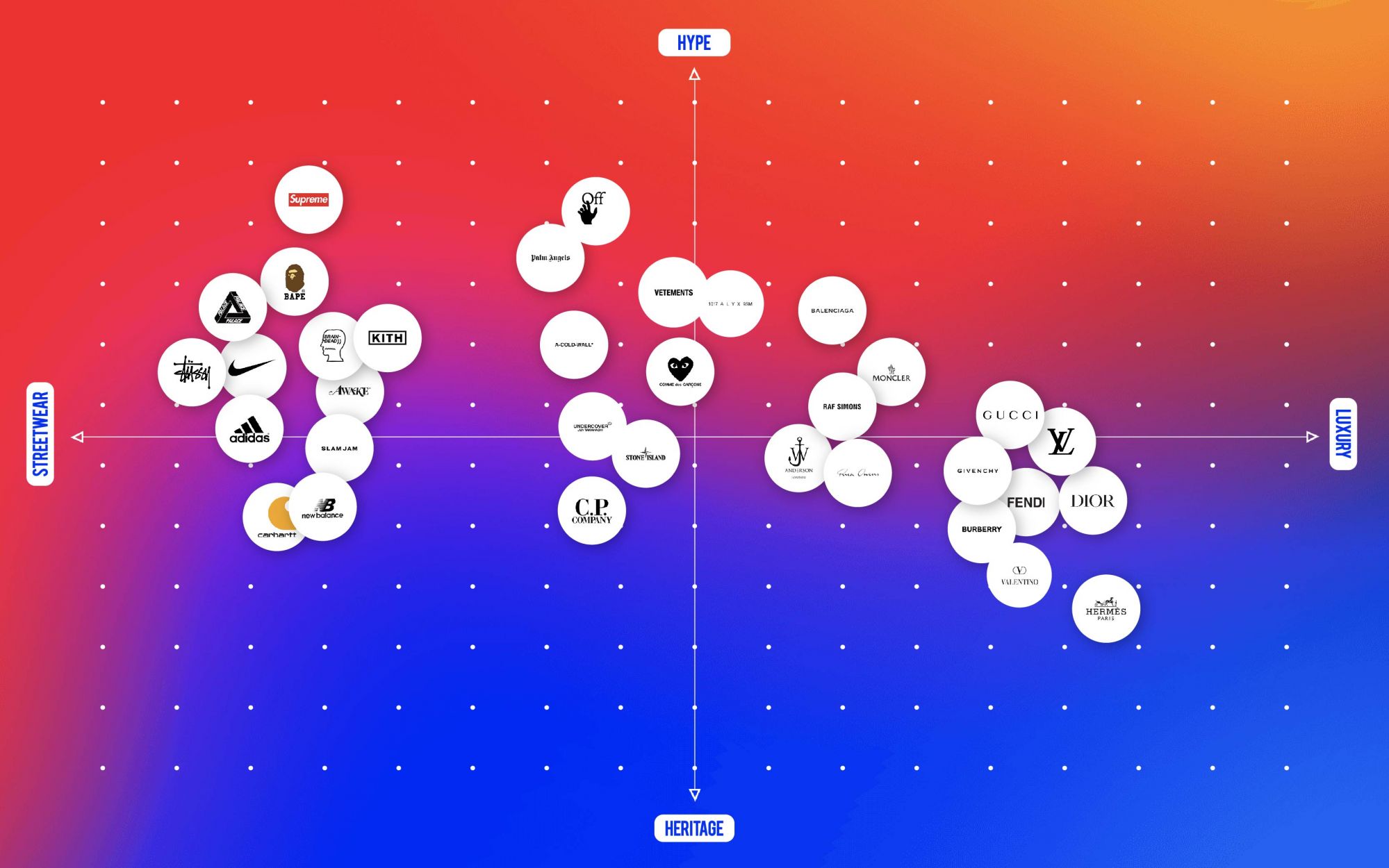 The map above shows the average of users: it's interesting how the perception is shifted upwards hype rather than downwards, and that today the number of brands perceived as luxury or streetwear are almost equivalent. Among the most interesting data are those extracted from the individual categories: Hermès, Dior and Valentino are the brands most associated with luxury, while Stüssy, Palace and Nike those perceived as more streetwear.