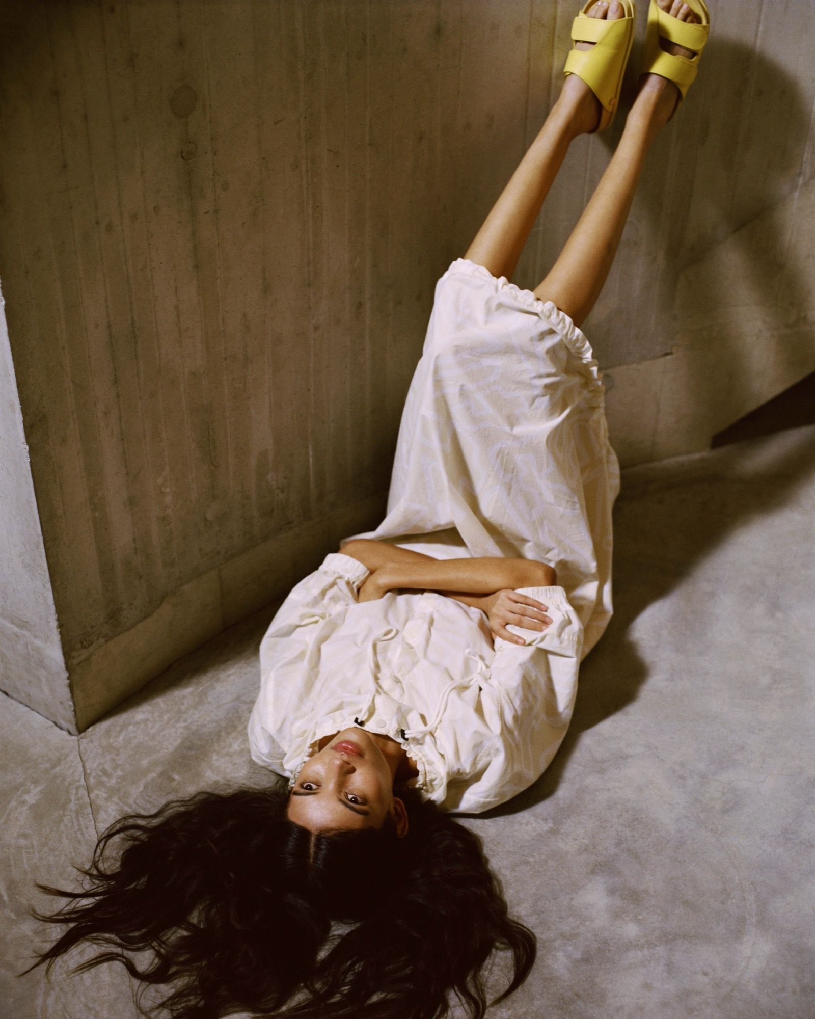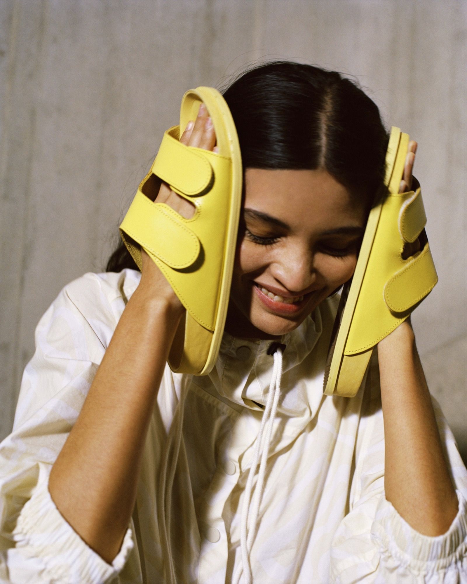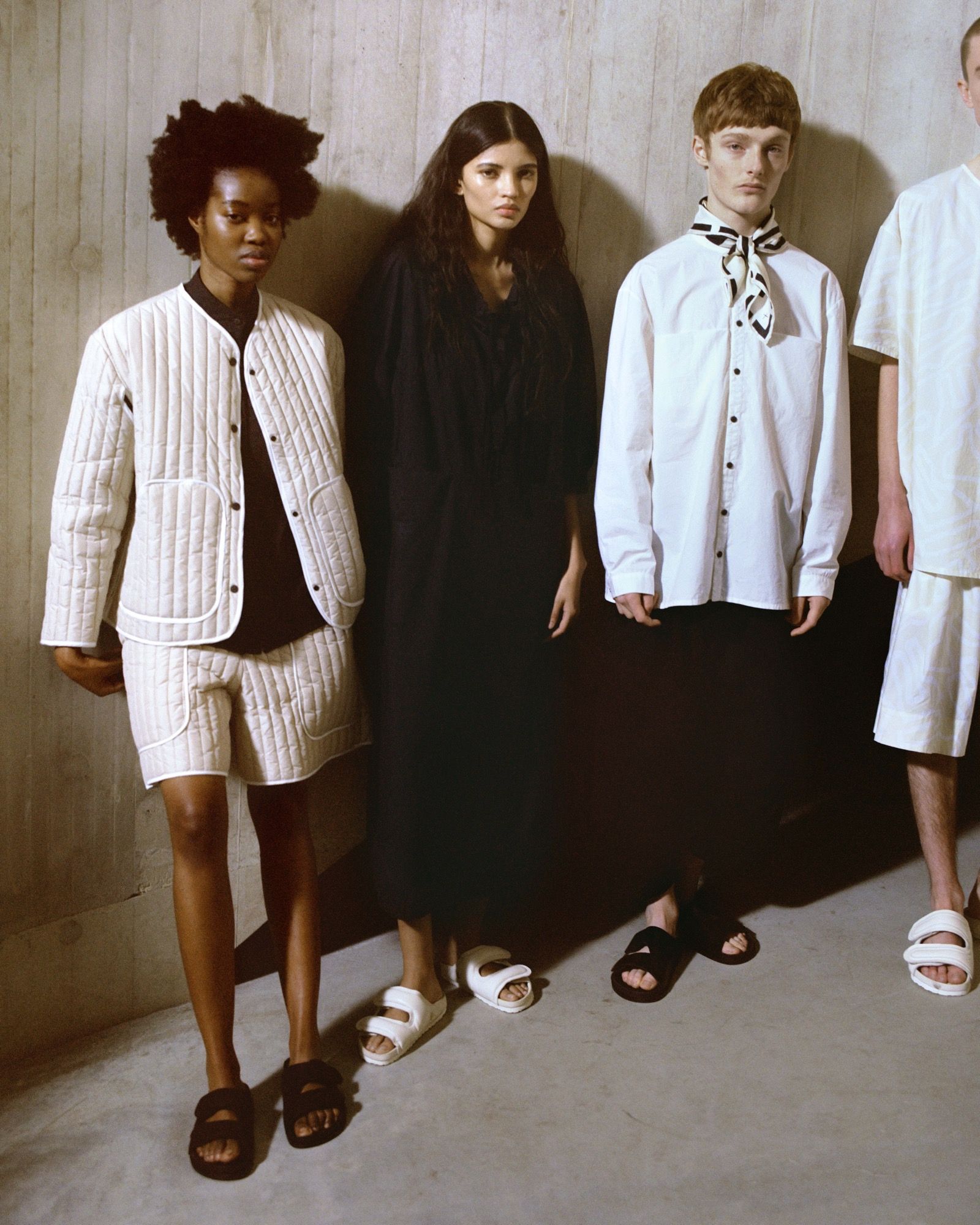 The inspiration for the three models of sandals for men and women - Forager, Mudlark and Beachcomber - comes from the idea of objets trouvés, fragments of the past rediscovered to create collections and exhibit them. Accompanying the sandals there's a capsule collection of workwear and accessories, characterized by sculptural shapes and fluid silhouettes. The neutral palette of black, white and grey, with a touch of yellow in the shoes, recalls the monochrome canvas coats of the first Toogood collection, enhancing the focus on shape, cut and texture.